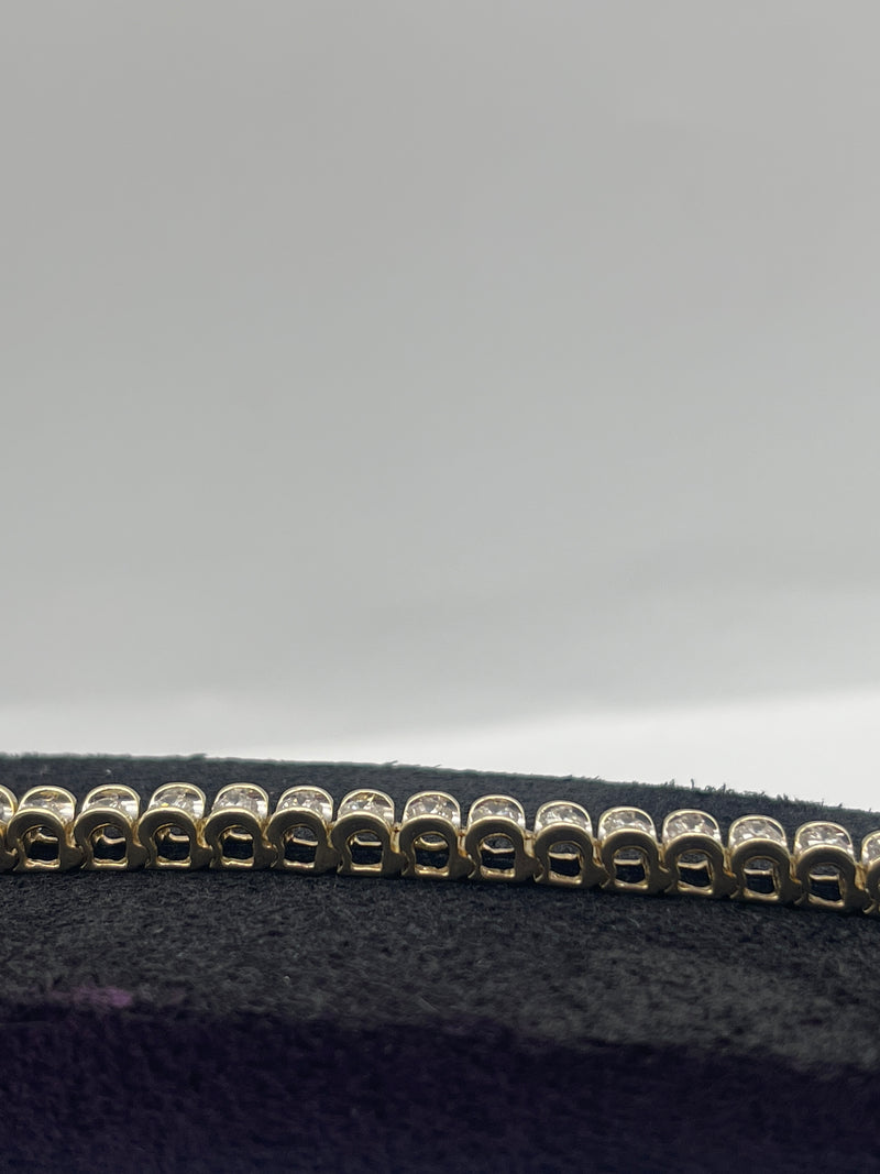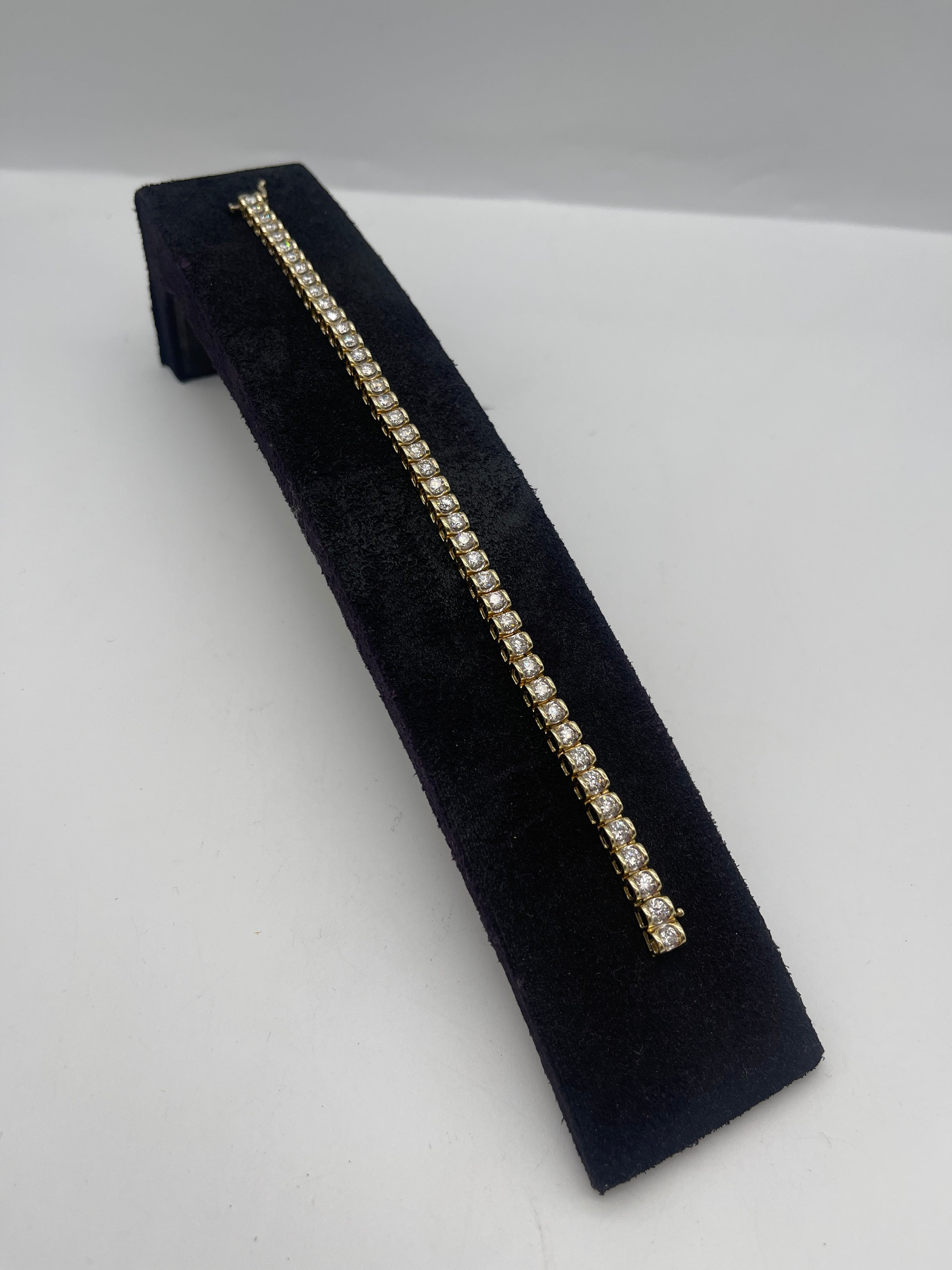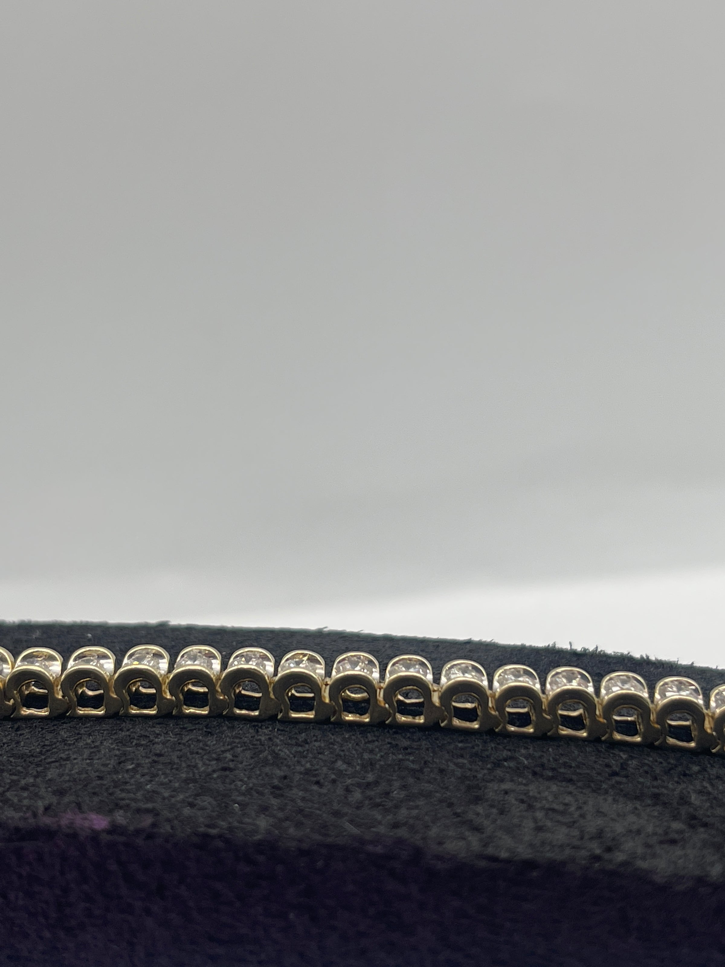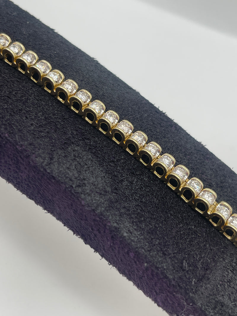 This beautiful diamond tennis bracelet is crafted in 14ct yellow gold, showcasing a timeless and elegant design. Featuring approximately 3.00ct of brilliant-cut diamonds, each stone is held in a secure claw setting to maximise light exposure and brilliance. The bracelet is fitted with a classic box clasp and an additional figure-8 safety catch for extra security and peace of mind. The warm tone of yellow gold pairs perfectly with the icy brilliance of the diamonds, creating a sophisticated and enduring piece suitable for both daily elegance and evening glamour. -