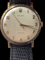 The Rolex Precision Reference 9659 is a vintage dress watch that exemplifies Rolex's commitment to elegance and precision. An 18-carat yellow gold, honey-comb engraved case, measuring 34.5mm in diameter, offers a classic and refined presence on the wrist. The satin silver dial features applied yellow gold arabic indices, providing a clean and sophisticated aesthetic. This 9659 is powered by the accurate and durable Rolex Calibre 1210 manual-winding movement. The domed plexiglass crystal, typical of the era, offers a clear and warm view of the dial beloved by collectors of vintage watches. This watch is also paired with a high-quality brown lizard strap, with a gold buckle featuring the Rolex coronet.
