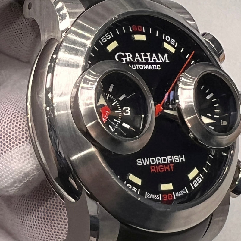 A superb example of this unique and highly collectible iconic sports watch designed by the award winning Graham watchmakers Group. This is a right hand winder mechanism (it’s optional left or right). Stainless steel case, with rubber strap and steel buckle . This watch is number 41 of this limited edition model.