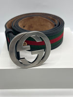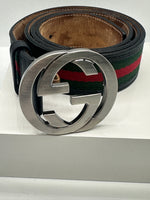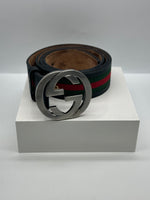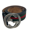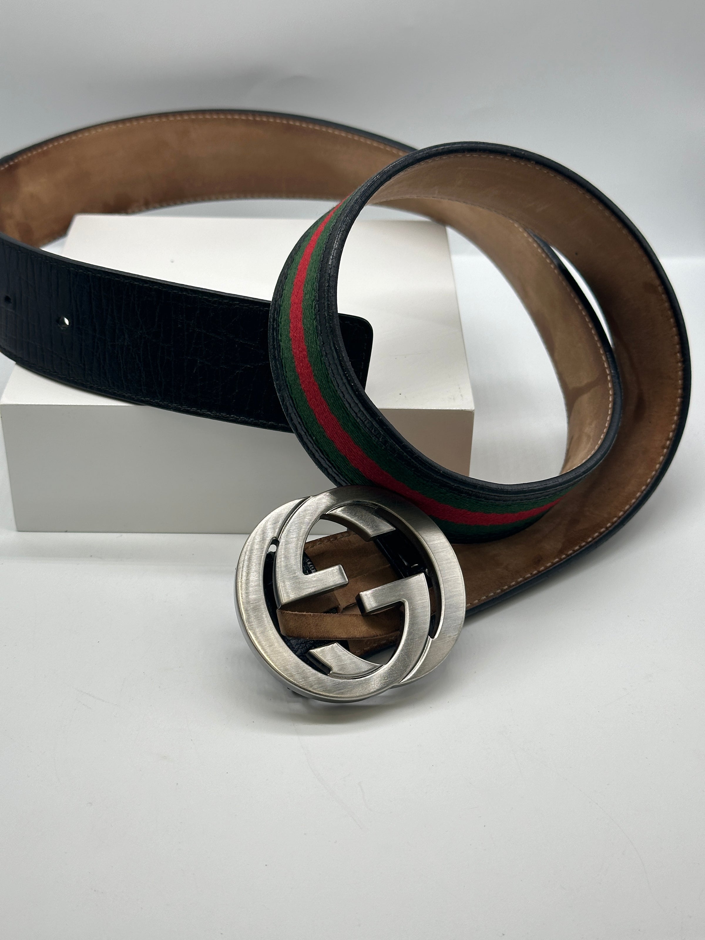 - Buckle: The belt showcases a silver-toned Interlocking GG buckle, a hallmark of Gucci's iconic design elements.