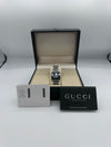 The star of this watch is the striking black dial that sets the stage for a timeless aesthetic. The minimalist design exudes an air of sophistication and understated luxury. The iconic Gucci "G" logo elegantly graces the centre of the dial, making it an unmistakable symbol of high fashion. A single silver-toned watch hand and discrete hour markers keep time in an uncluttered and refined manner. The stainless steel case and bracelet complement the black dial beautifully, creating a seamless blend of form and function.