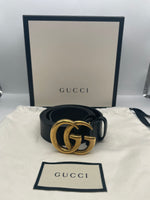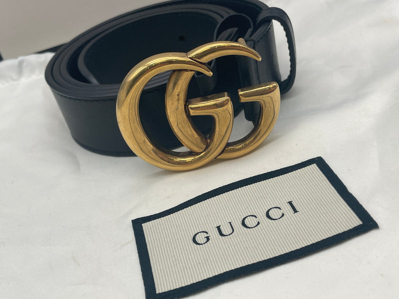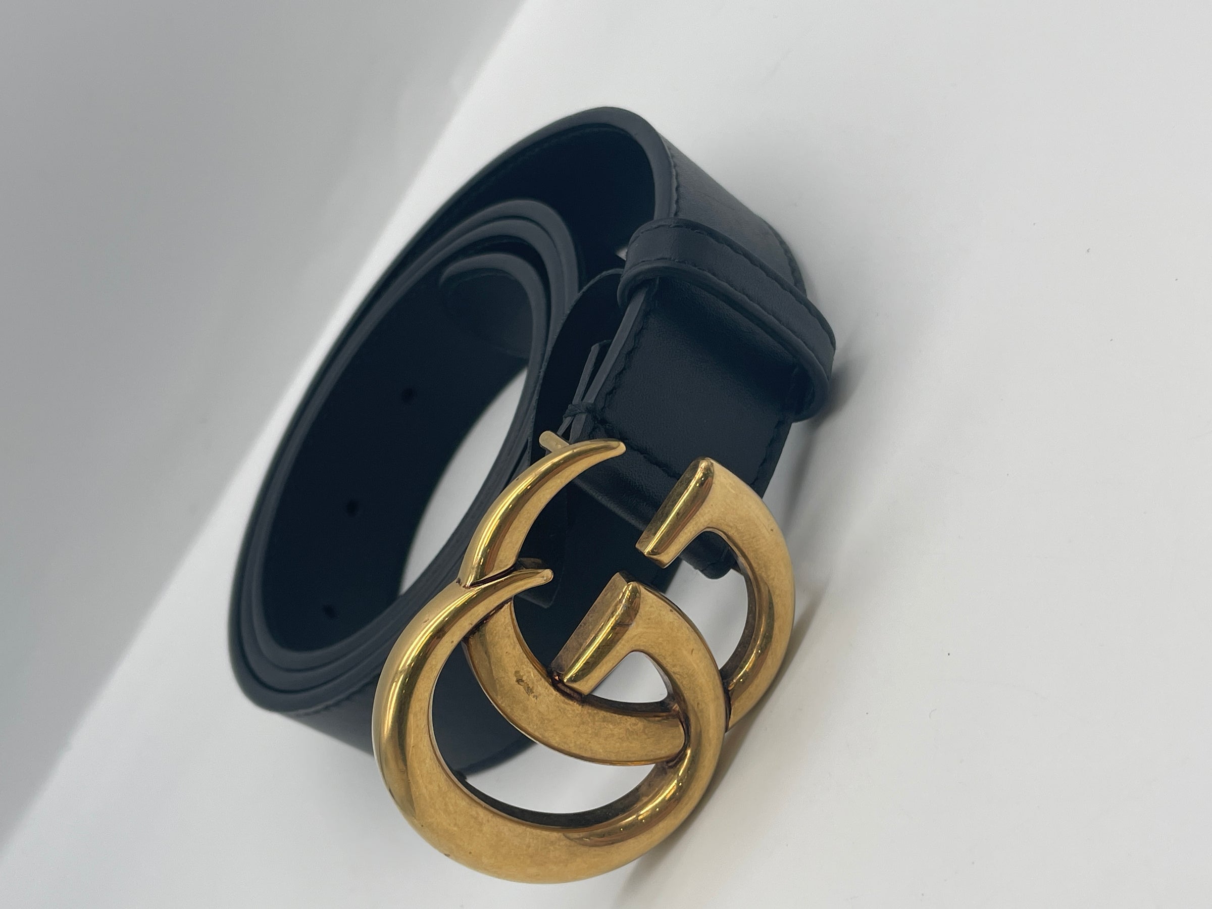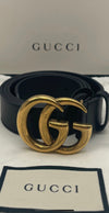 Classic black leather belt with the Double G buckle, an archival reprisal from the '70s collections. The women's leather belt can be worn on the hips or at the waist to create different looks, comes with original box, dust bag and purchase receipt.