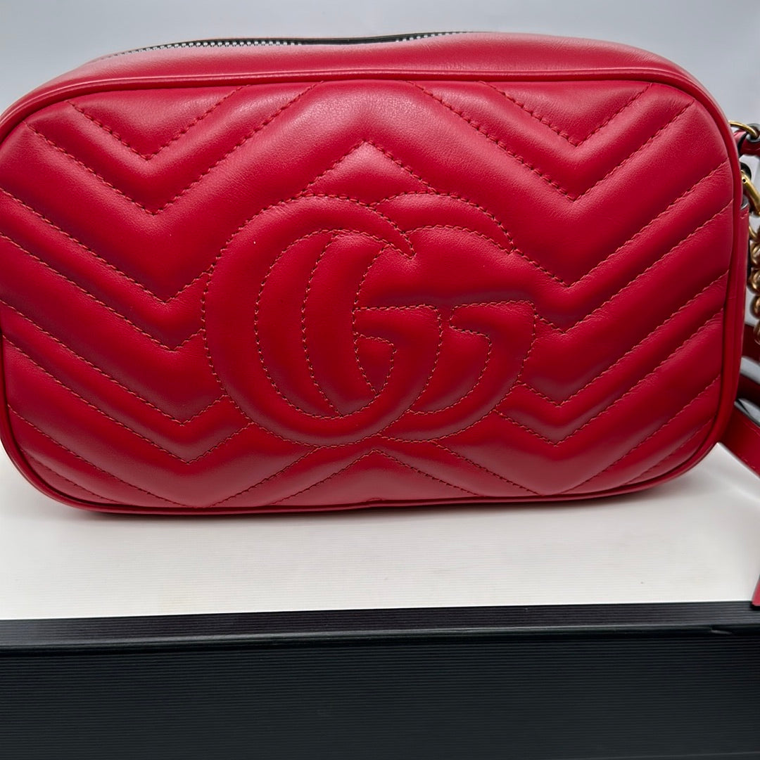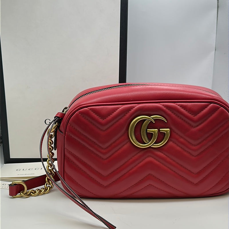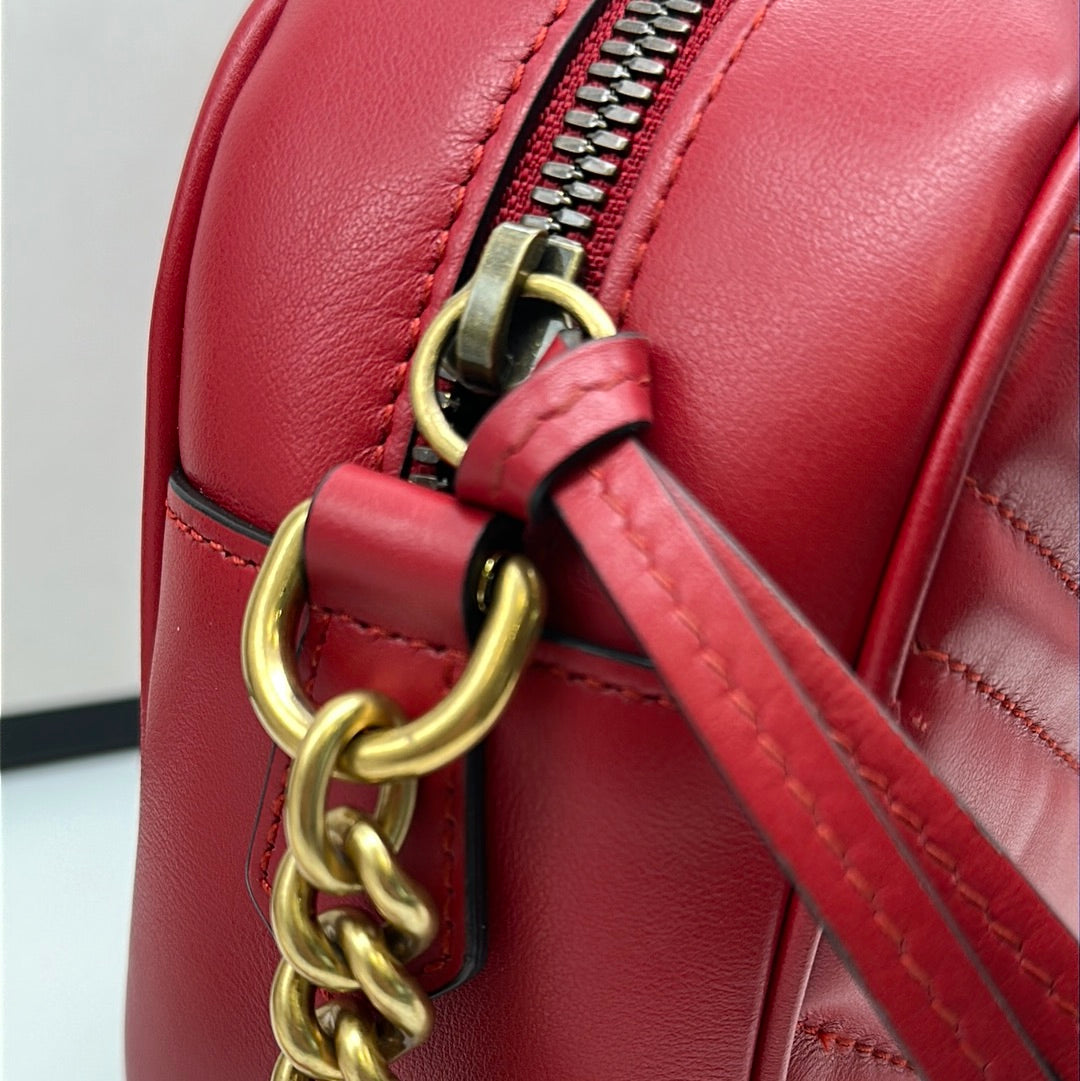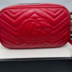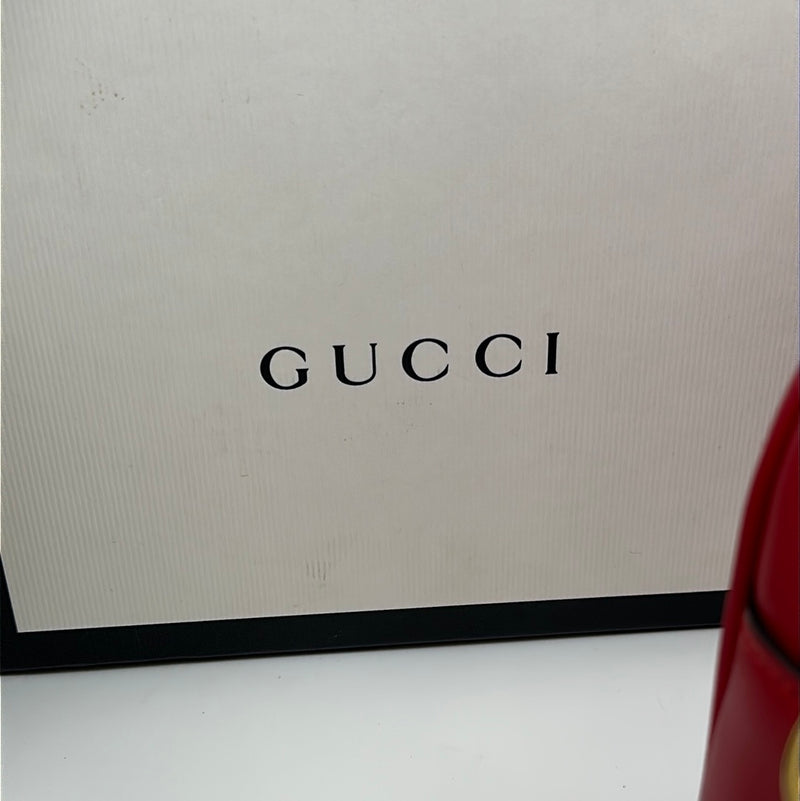 Ladies Gucci Marmont Red Leather Crossbody Bag With Gold Hardwear, Original Box And Dust Bag, This Bag Is In Very Good Condition With Little Or No Signs Of Wear.
