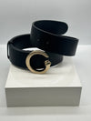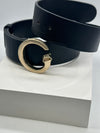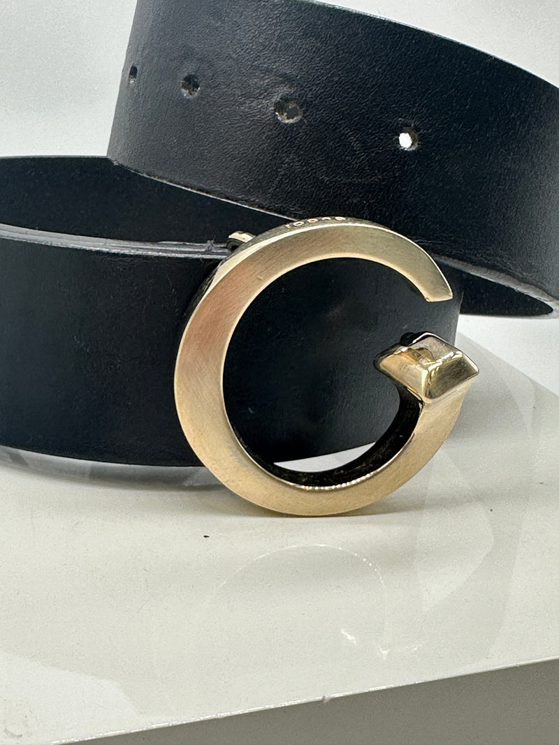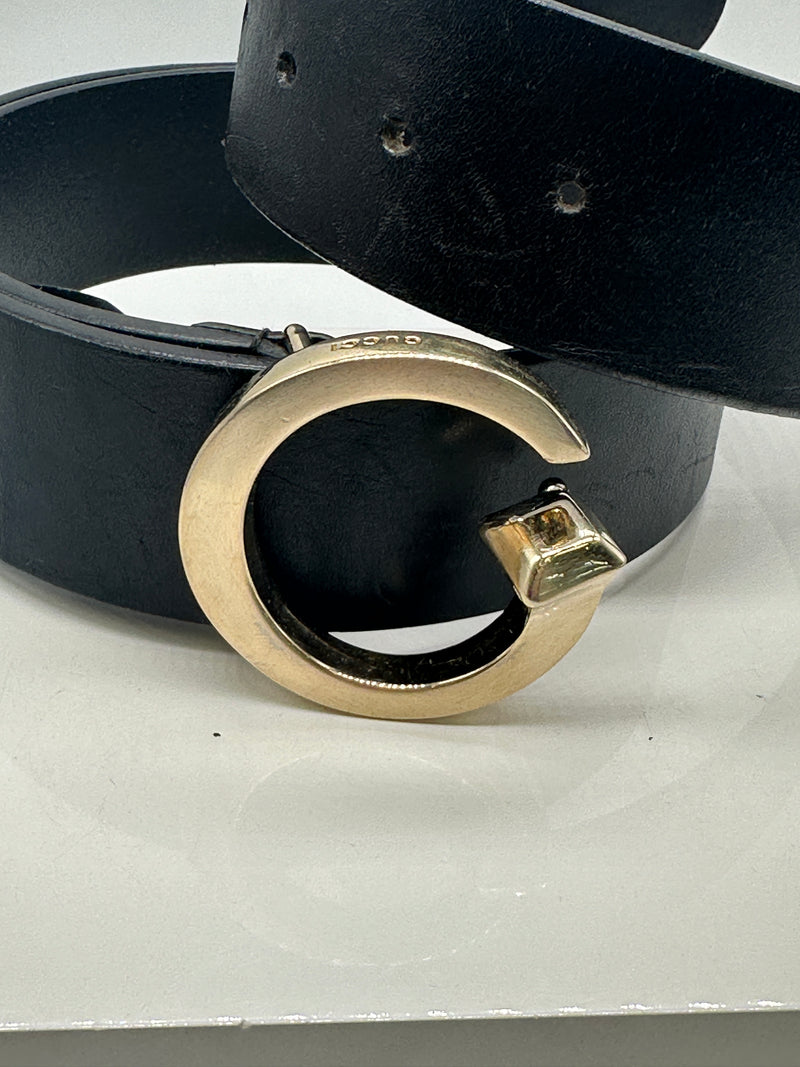 This Gucci men's belt is meticulously crafted from premium black natural leather, ensuring durability and a refined appearance. It features a distinctive gold-toned 'G' buckle, intricately engraved with the Gucci logo at the top, exemplifying the brand's attention to detail.