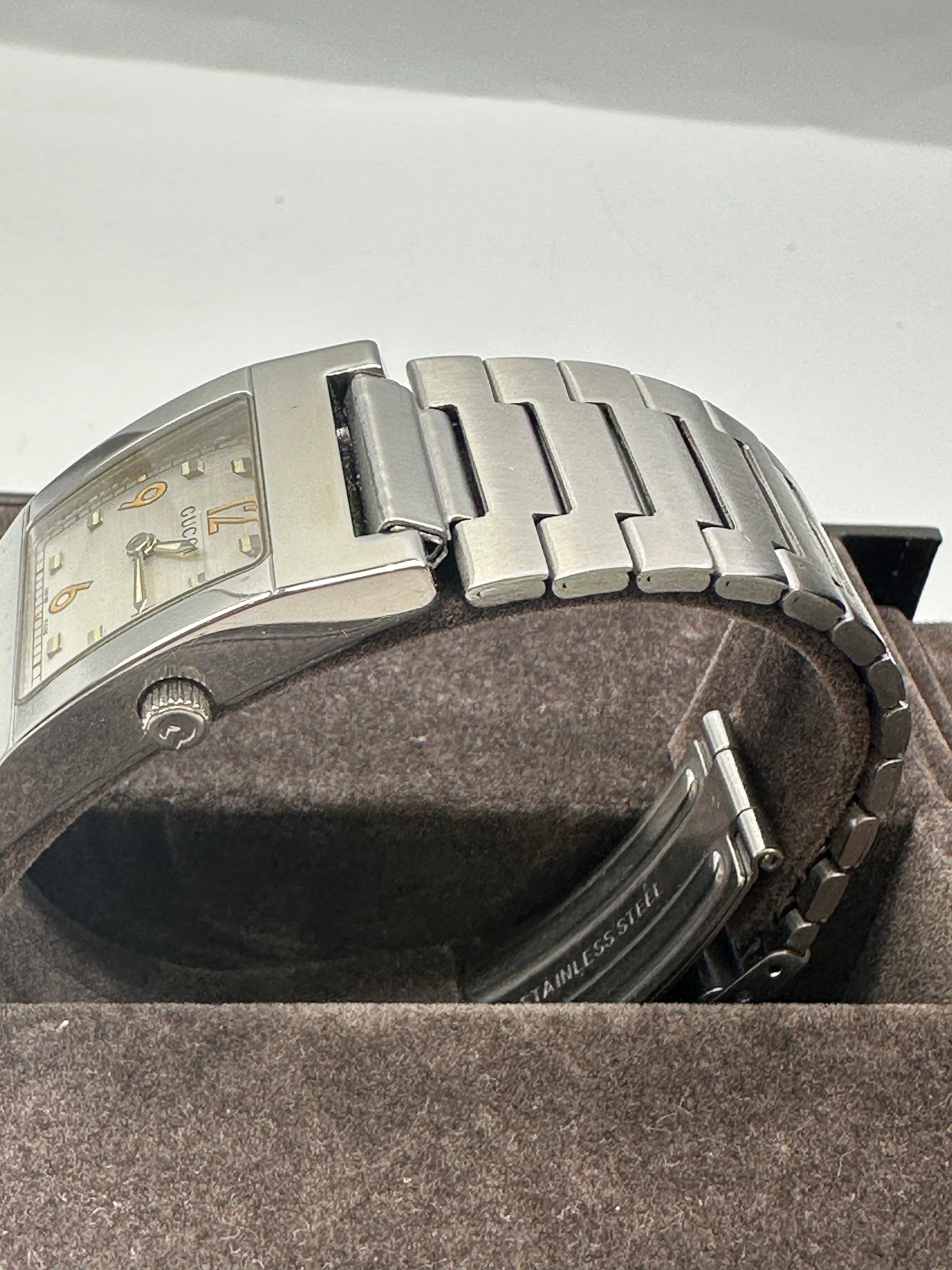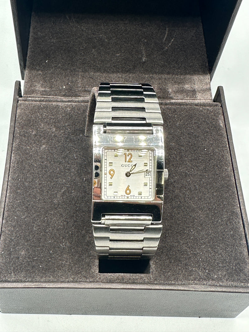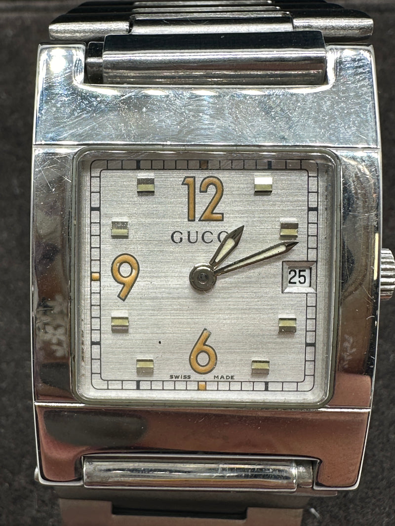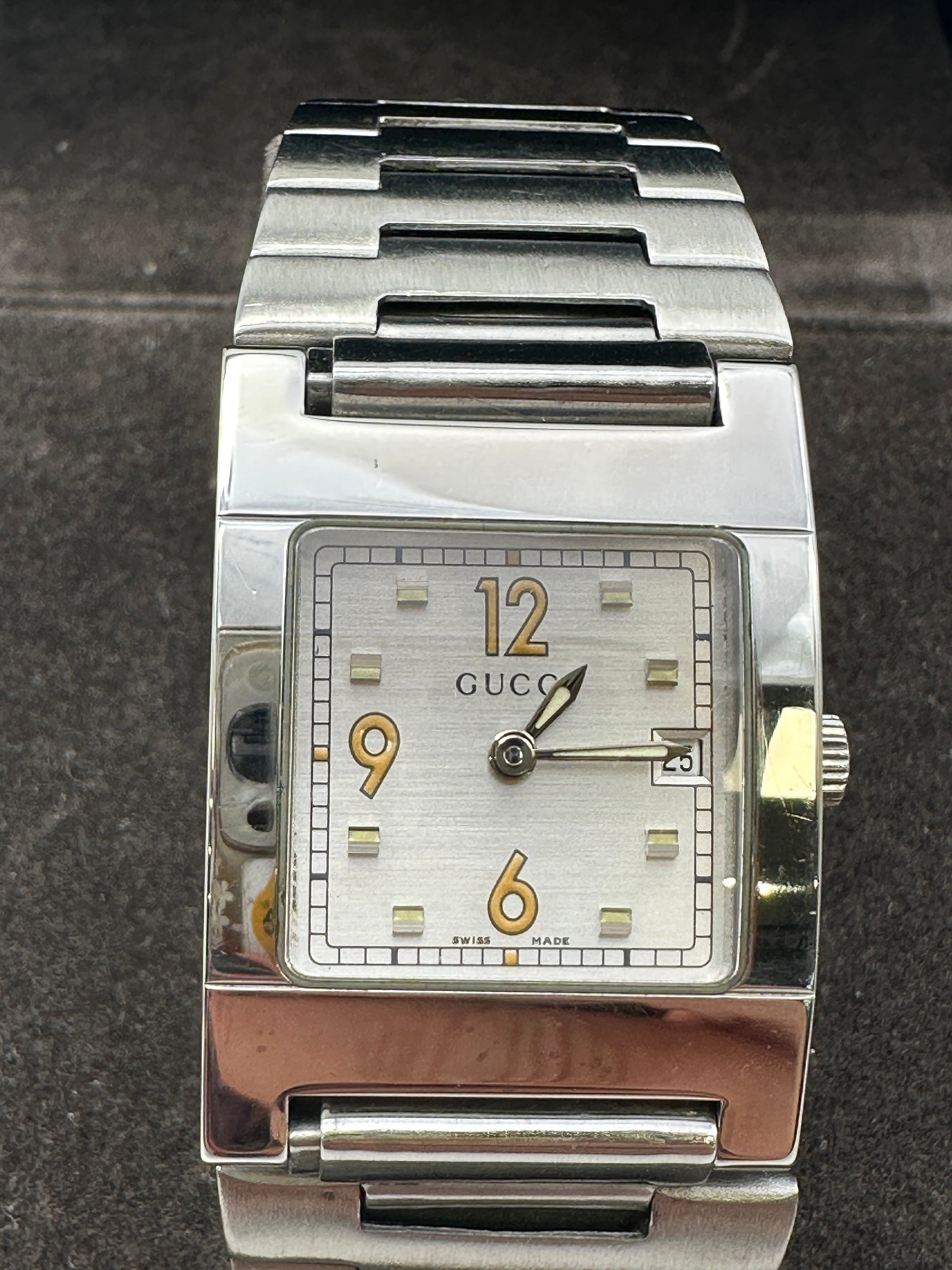 This Gucci watch is in stainless steel, the face is a nice vintage design with the date at 3 o'clock and 3 arabic numerals at 12, 6 and 9.