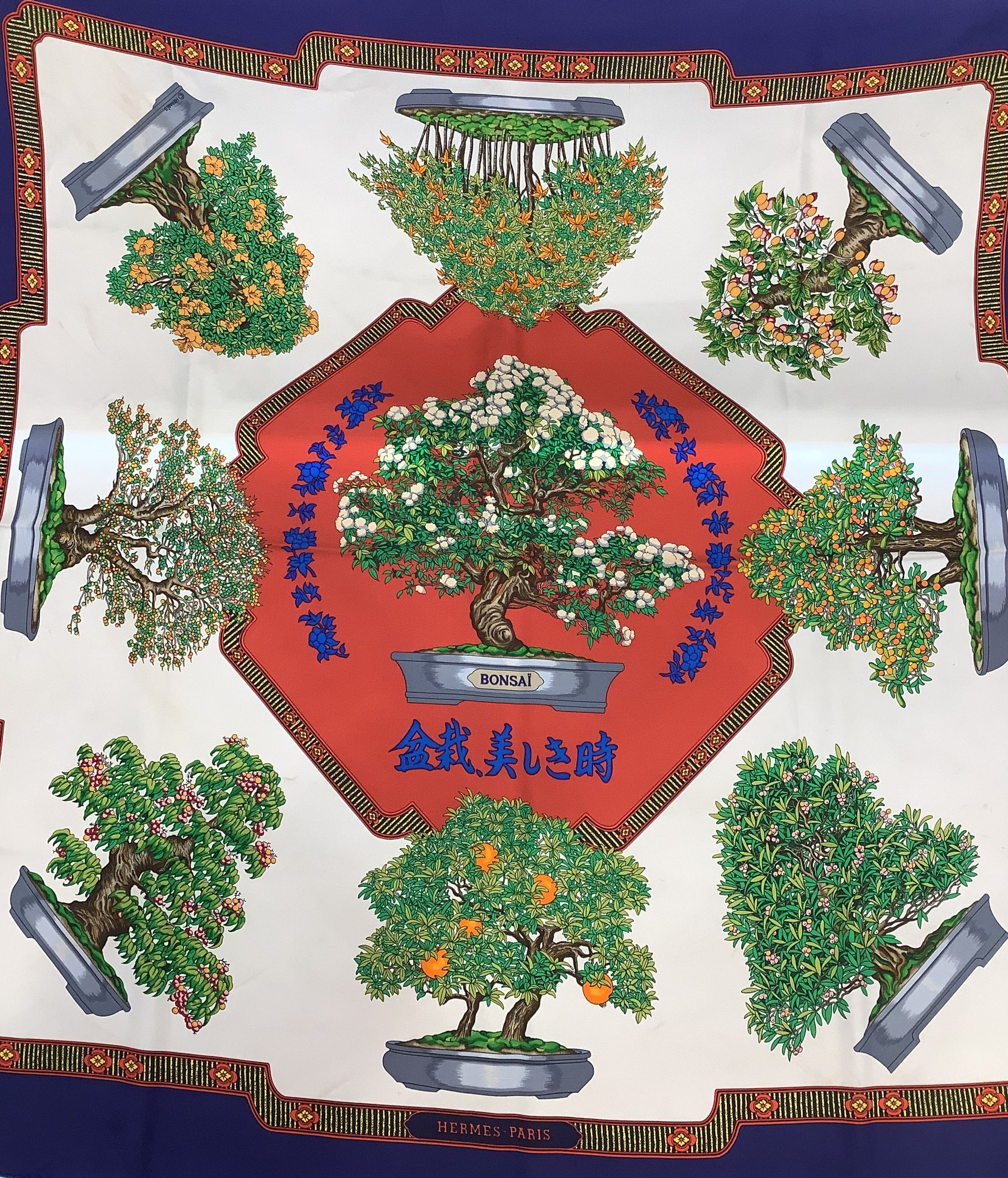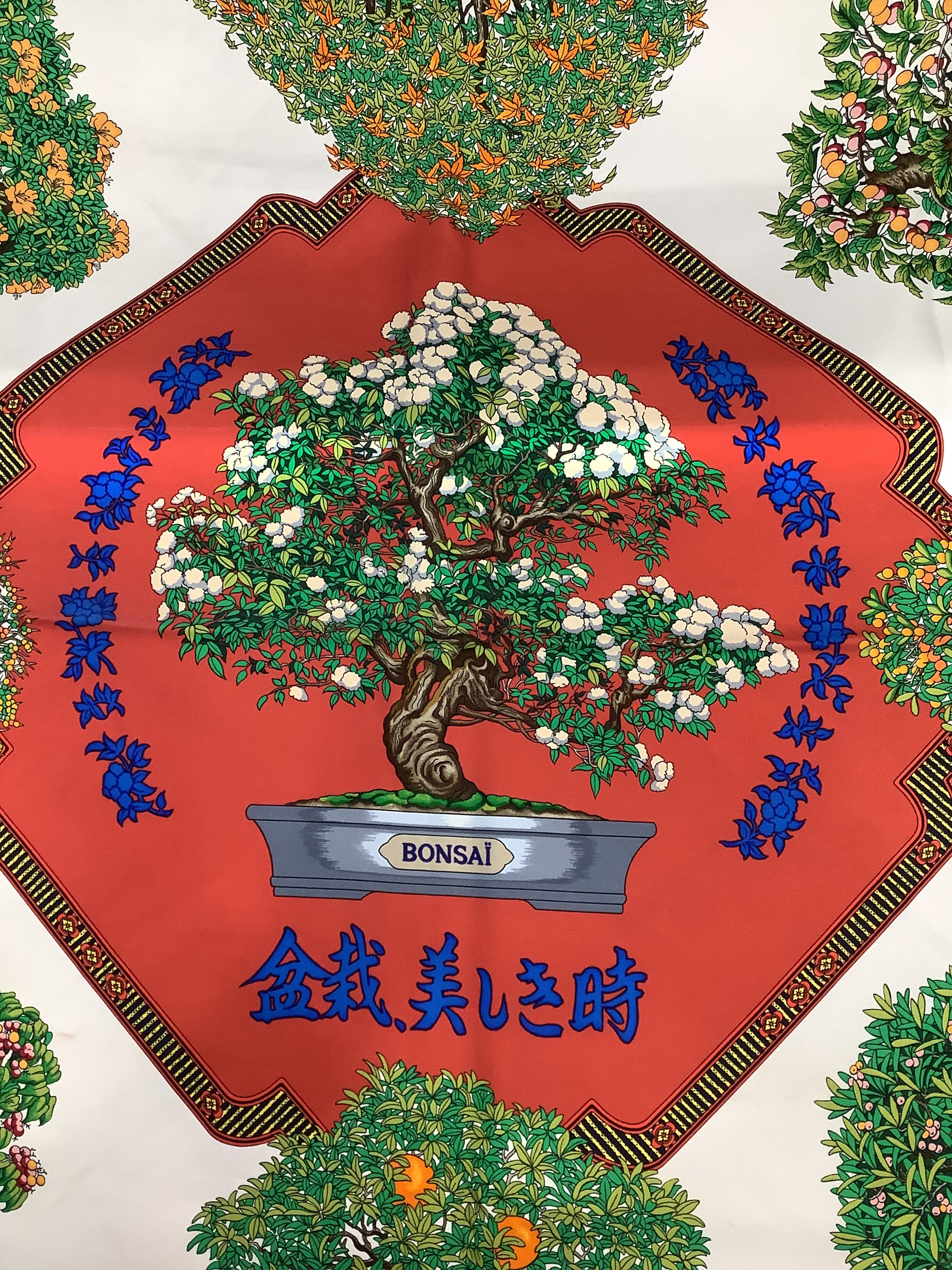 “Les Beaux Jours de Bonsai” was designed by Catherine Baschet and issued around 1991/92. In 1991, Hermès featured Asia as a thematic direction, and this scarf was part of that collection. The design draws from the Japanese art of bonsai — shaping nature into miniature, living art — and translates that into a refined textile composition. Hermès carrés are celebrated for their narrative, precision printing, and artisanal finishing; each design becomes a piece of wearable art.