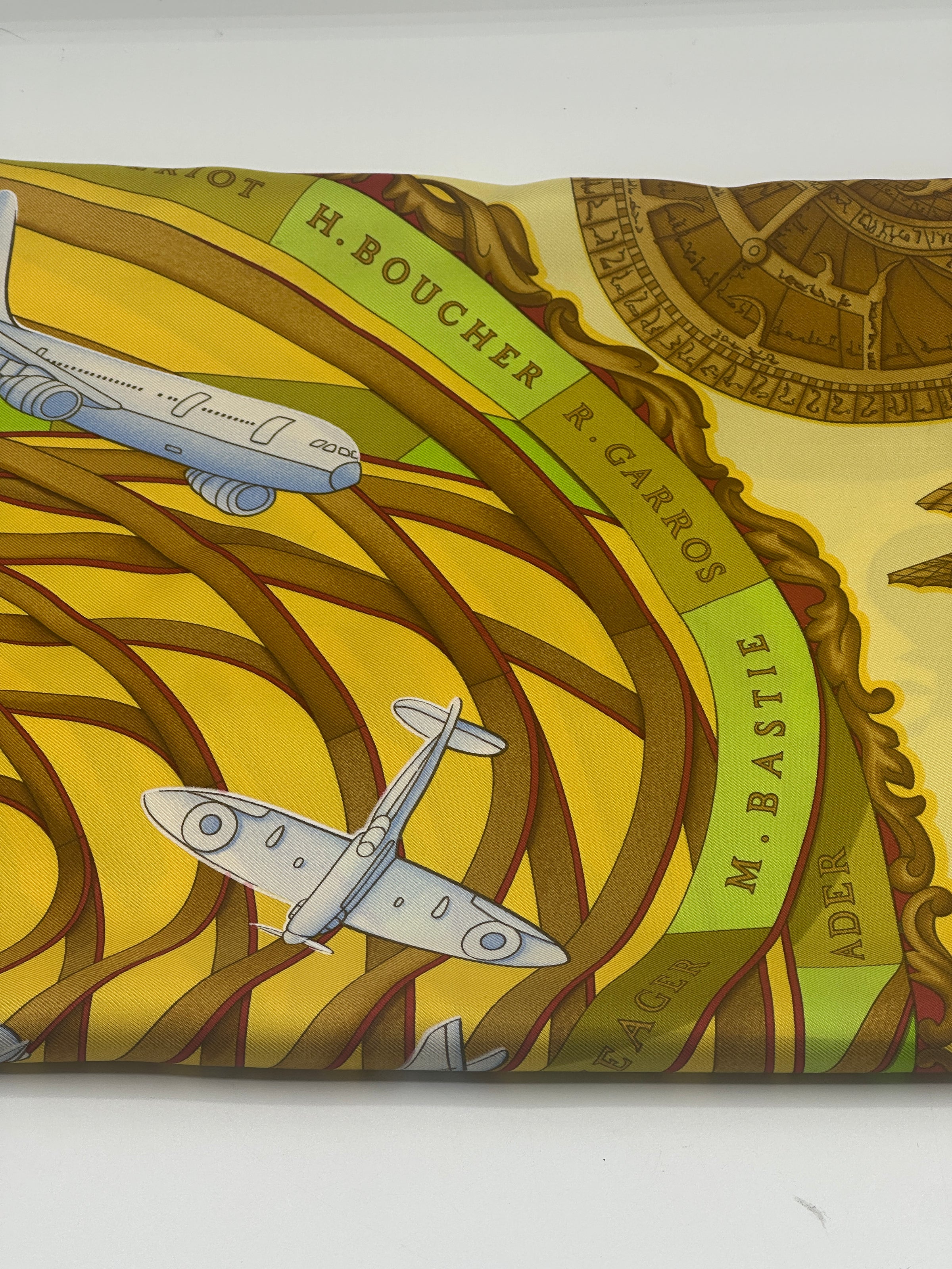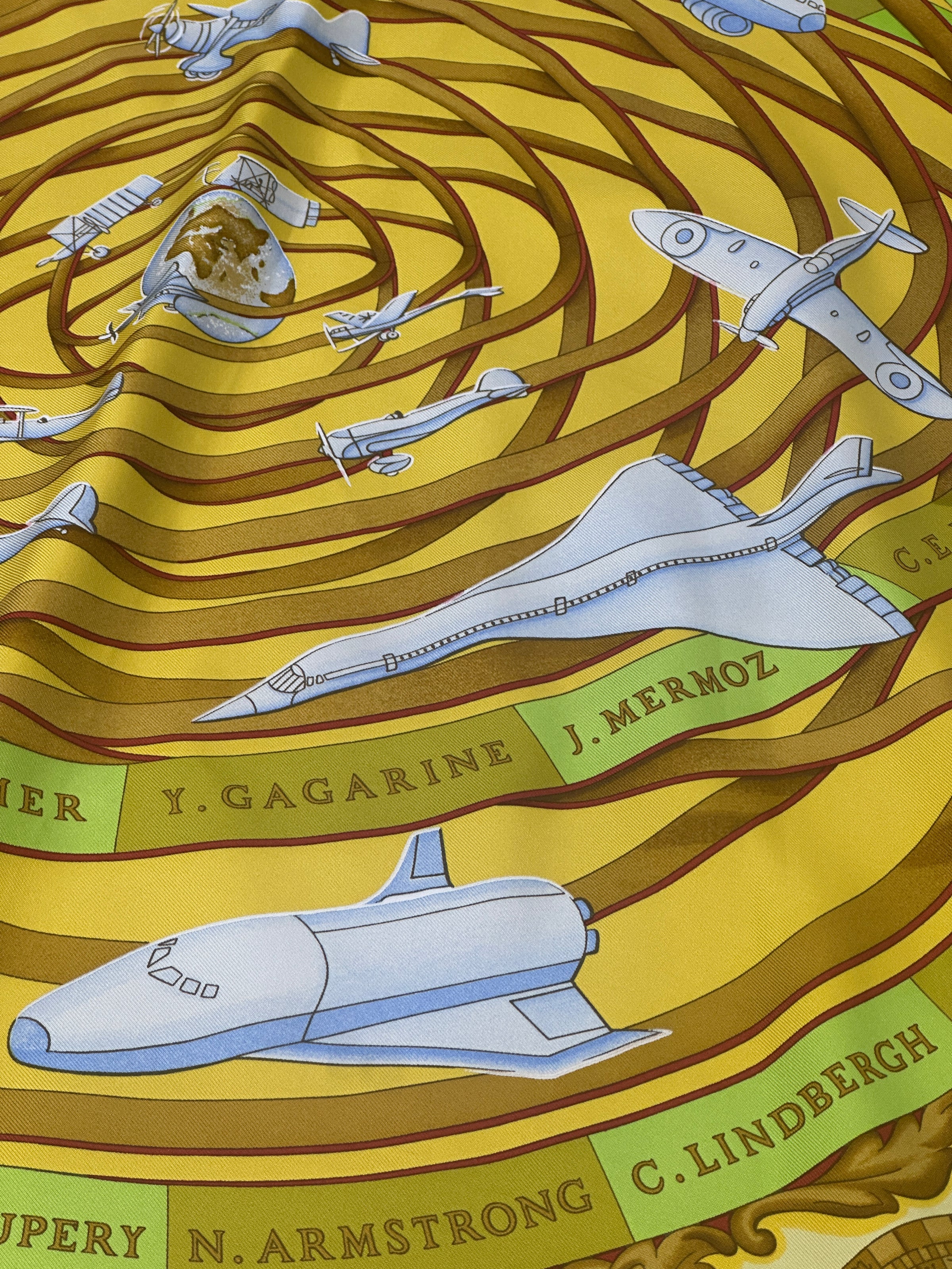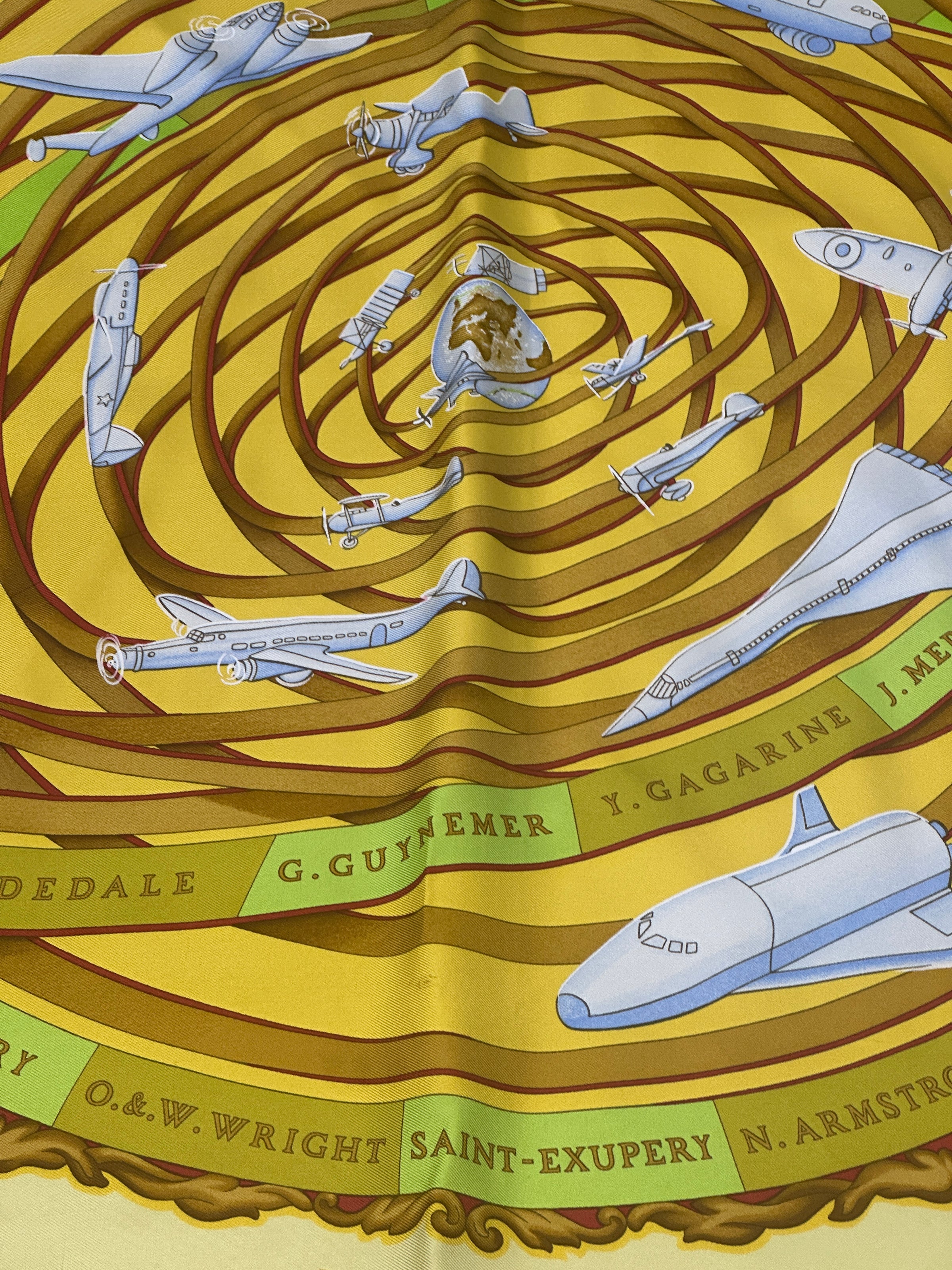 This scarf is a classic square carré measuring approximately 90 × 90 cm (some variants 86.5 × 89 cm) crafted from 100 % silk. The design — titled “Rêves d’Espace” — was created by Michel Duchêne and dates from 1993. The scarf features a striking yellow colourway, with the detailed print possibly including the space-inspired motifs characteristic of the “Rêves d’Espace” theme. The piece is finished with Hermès’s hand-rolled edges, giving a refined drape and smooth, luxurious feel.