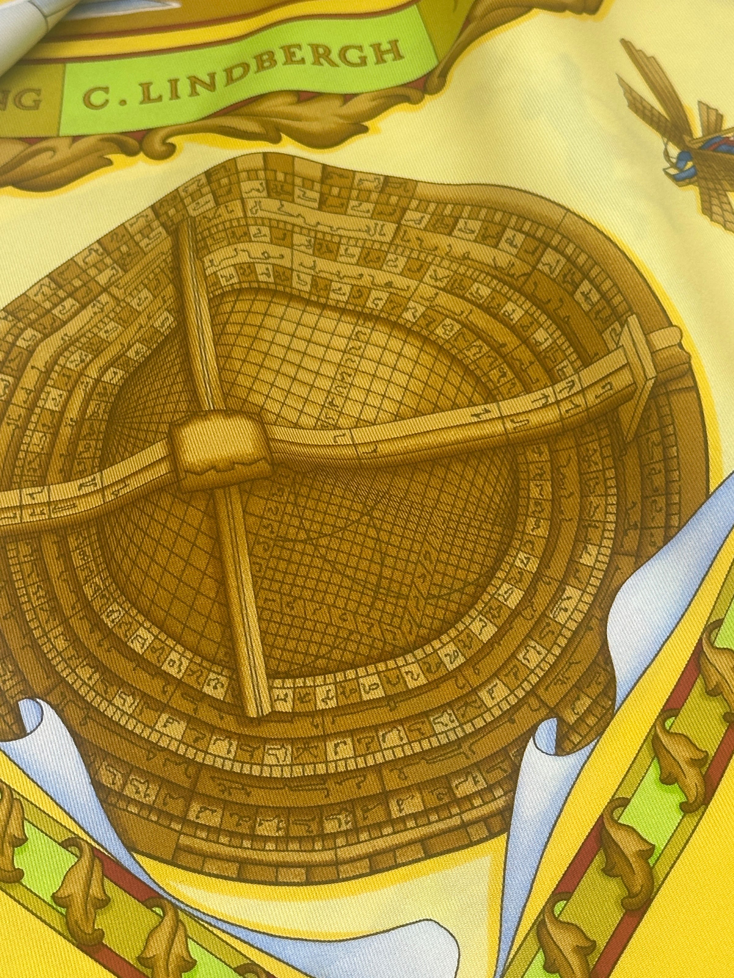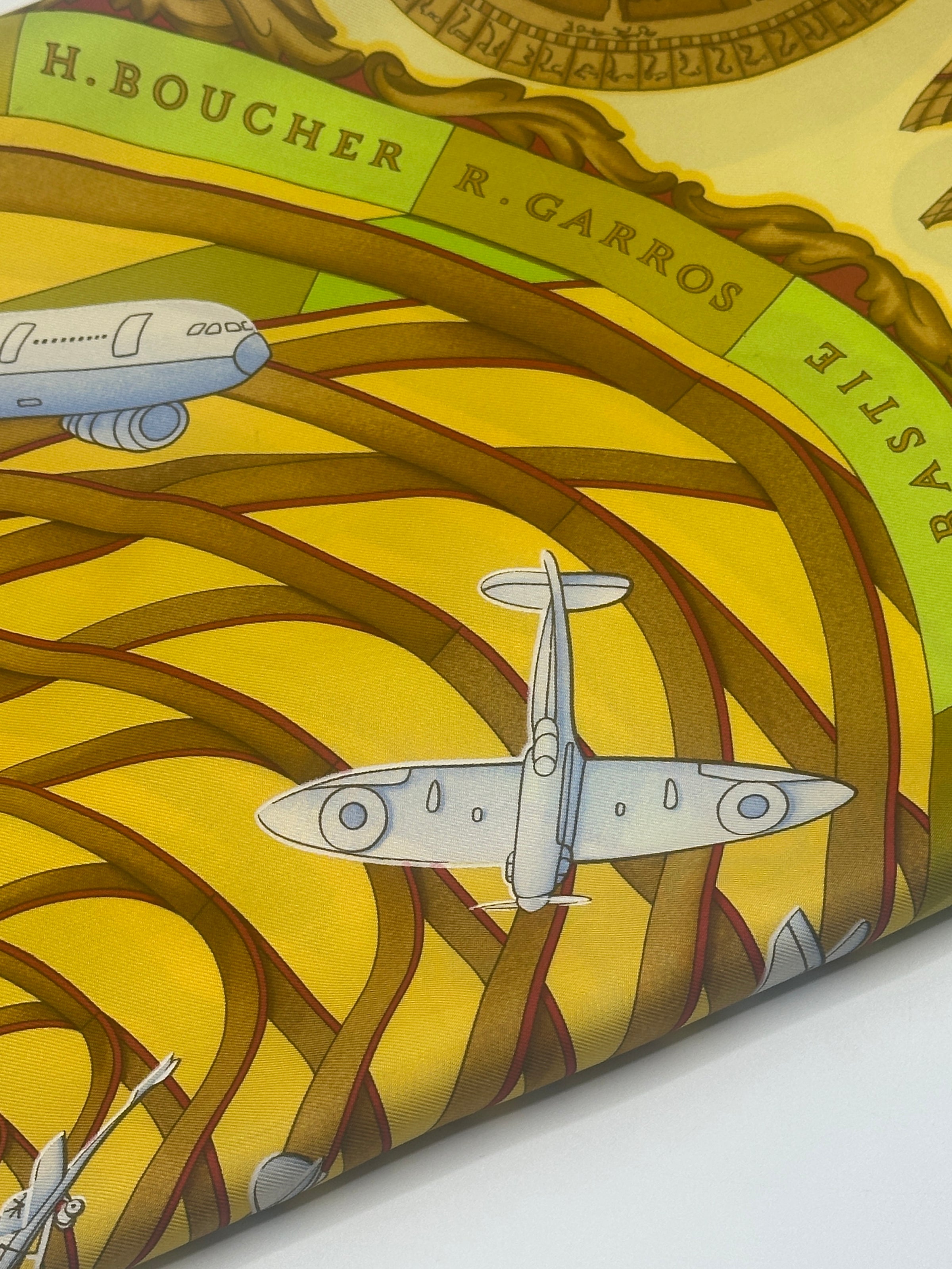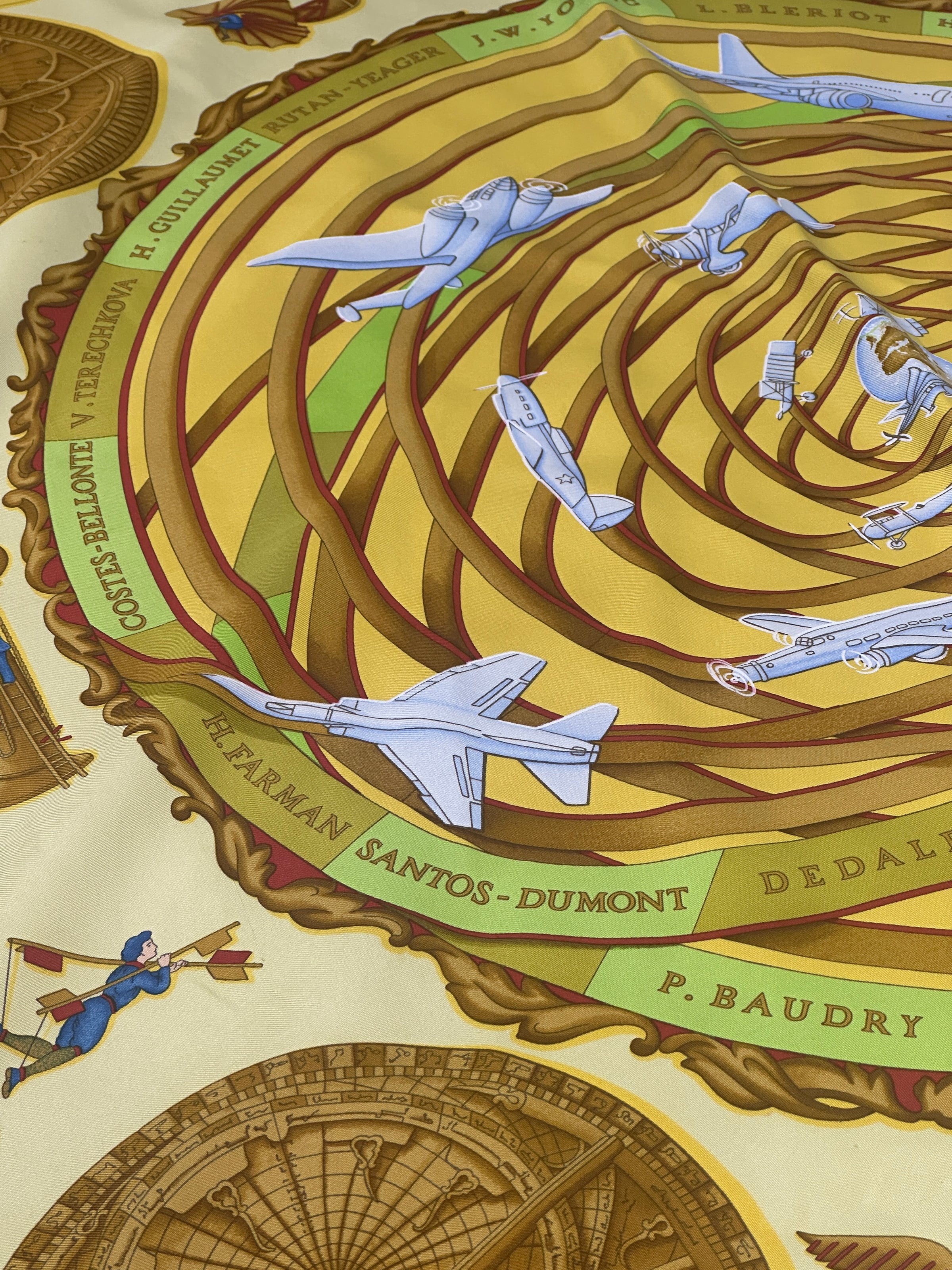 This scarf is a classic square carré measuring approximately 90 × 90 cm (some variants 86.5 × 89 cm) crafted from 100 % silk. The design — titled “Rêves d’Espace” — was created by Michel Duchêne and dates from 1993. The scarf features a striking yellow colourway, with the detailed print possibly including the space-inspired motifs characteristic of the “Rêves d’Espace” theme. The piece is finished with Hermès’s hand-rolled edges, giving a refined drape and smooth, luxurious feel.