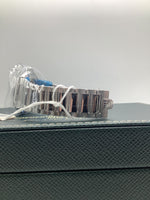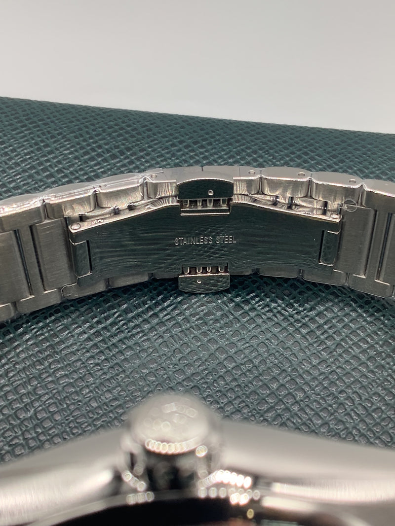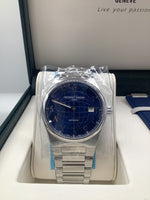 - Bracelet: The watch comes with a stainless steel bracelet featuring a three-link design and a folding clasp with push buttons. An additional navy blue rubber strap is included, allowing for versatile styling options.