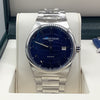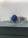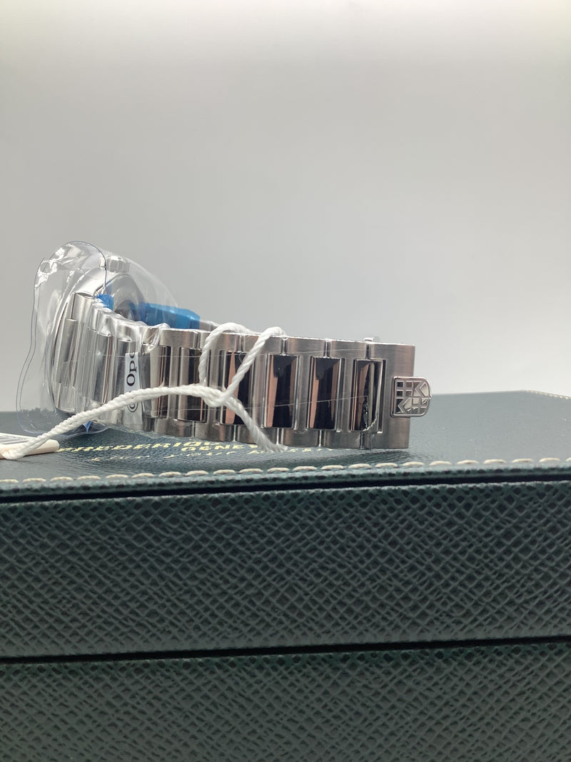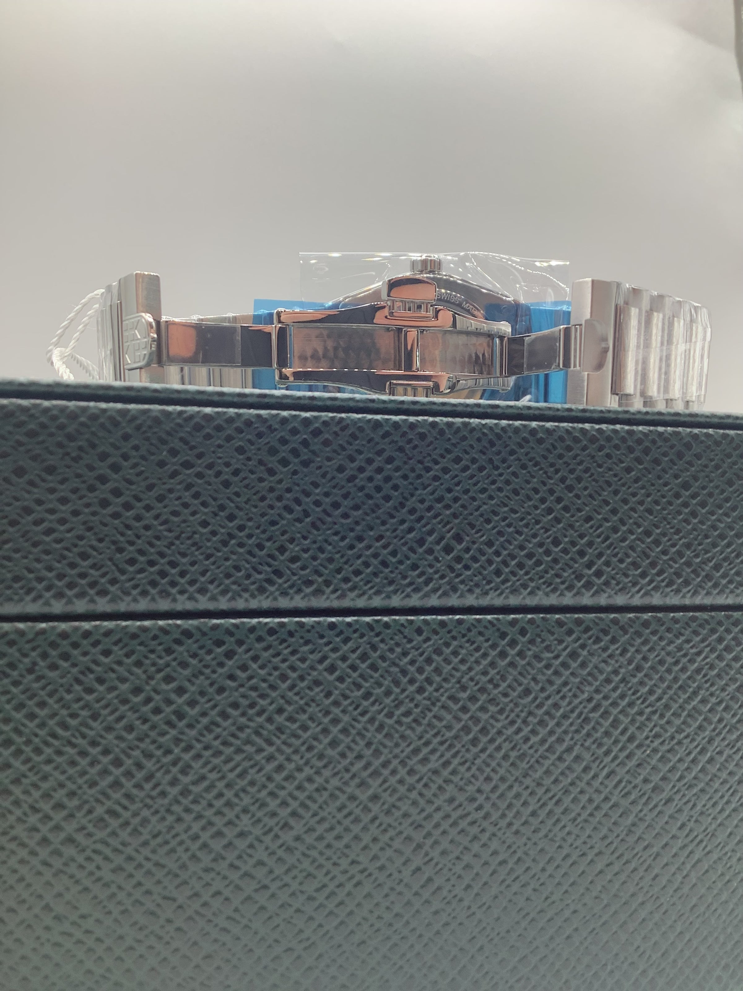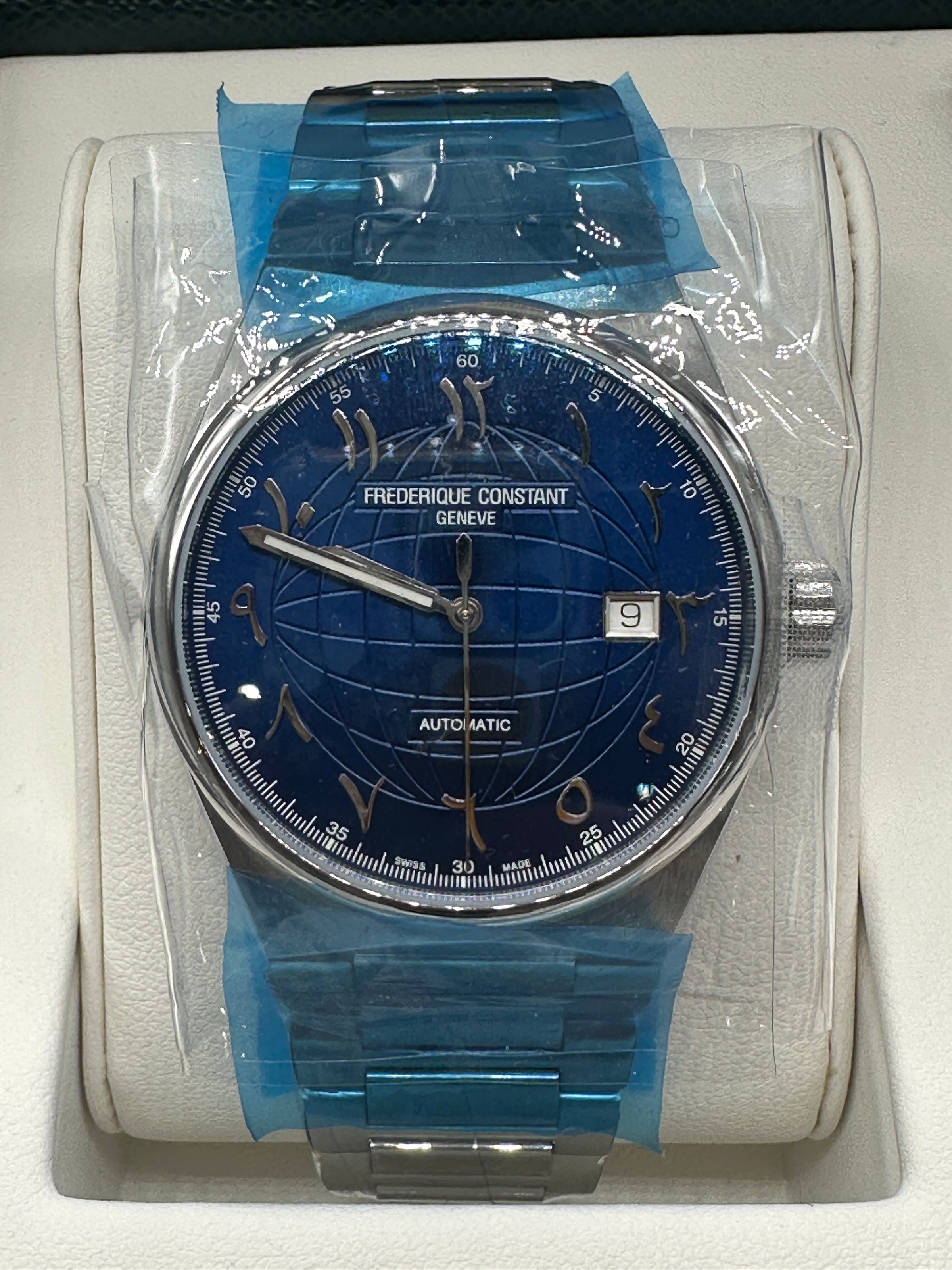 - Materials & Design: This watch has a 41mm stainless steel case with a polished and brushed finish. The navy blue dial showcases an embossed globe pattern, with this special edition featuring applied Arabic numbers.