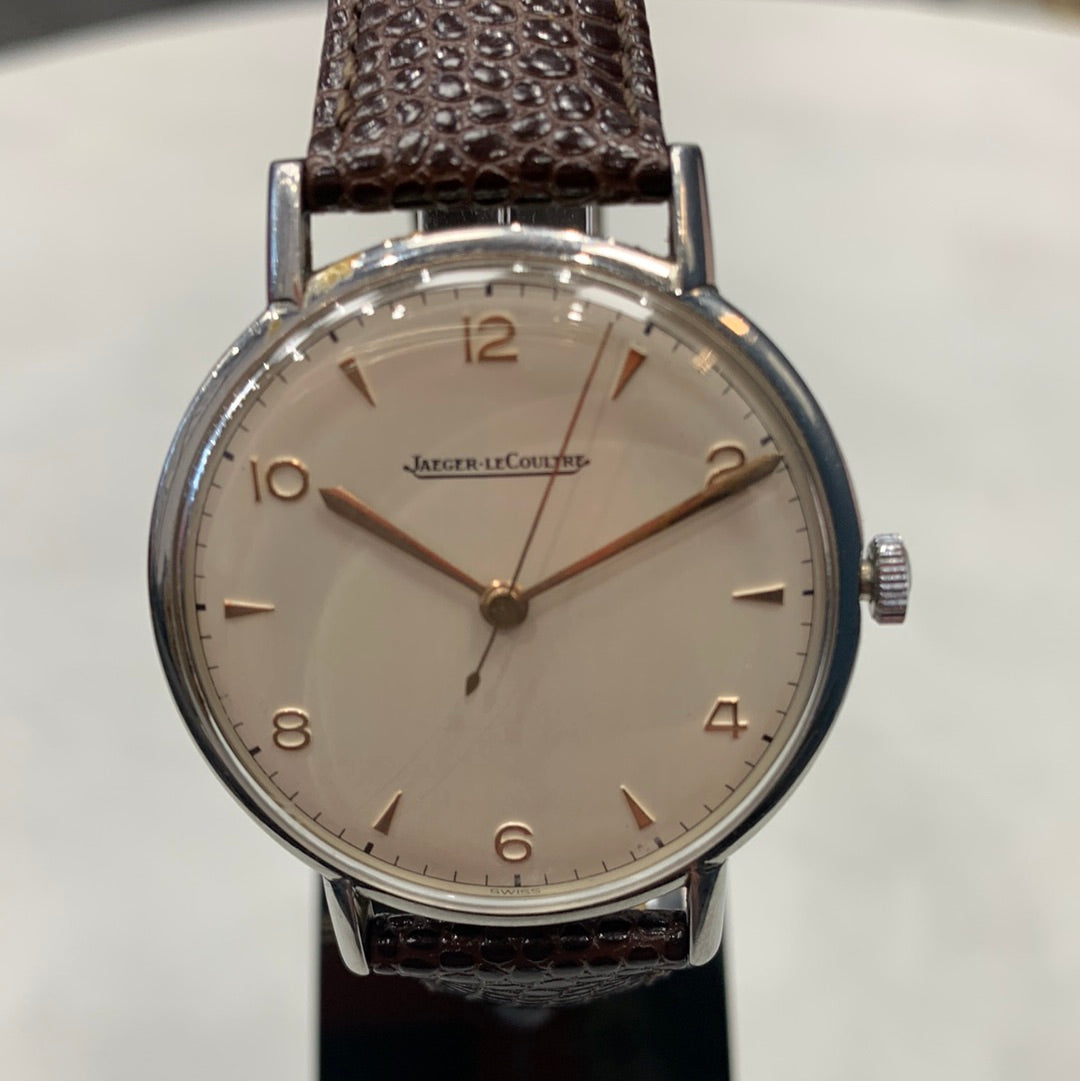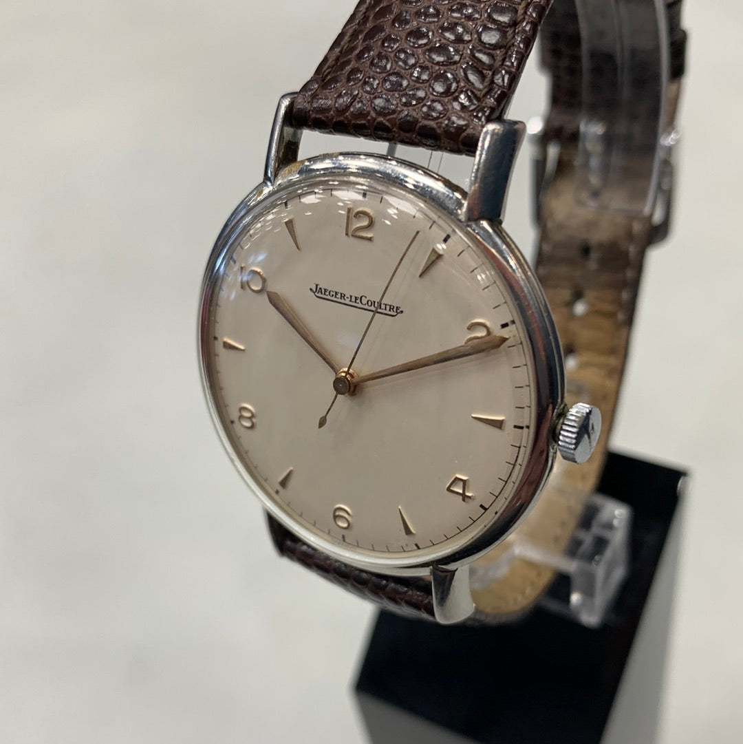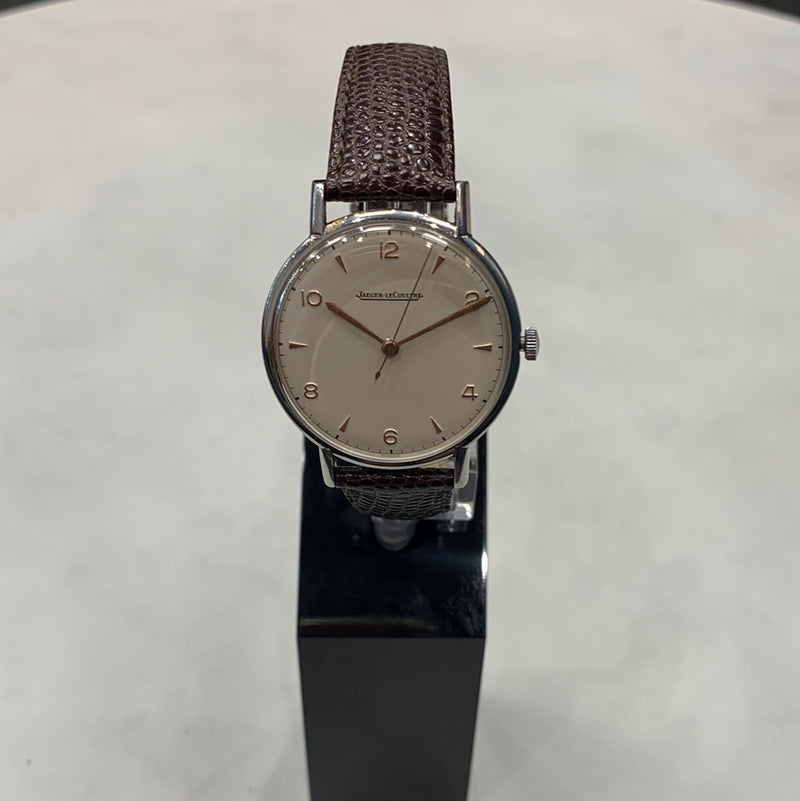 Jaegar-LeCoultre Dress Watch with White Dial and Brown Lizard Strap.