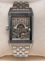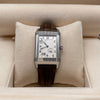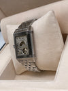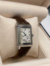 Materials and Design: The Jaeger-LeCoultre Reverso Grande Date, reference Q3008120, features a stainless steel case with the iconic reversible design - in this instance with a large sapphire crystal display back on the reverse. The case measures approximately 29.5mm in width and 46.5mm in length. The silvered guilloché dial is adorned with Arabic numeral hour markers and blued steel hands, exuding a timeless Art Deco aesthetic. The watch is complemented by both a steel bracelet with an additional brown alligator leather strap, enhancing its sophisticated appeal.