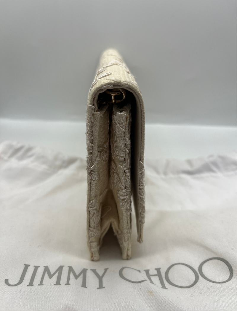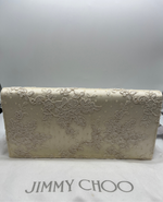 The Jimmy Choo Lilia Clutch in ivory floral lace is a refined accessory that embodies elegance and sophistication. Crafted with intricate floral lace overlay, this mini bag features a clean and modern raw-edge construction, exuding a delicate aesthetic. The design includes a Jimmy Choo engraved magnetic snap closure, ensuring both security and style. A chain-detailed shoulder strap offers versatility, allowing the clutch to be worn over the shoulder or carried by hand. The interior is thoughtfully designed with a card holder and an internal zipped pocket, providing practical storage solutions. Measuring L23 x H11 x W5cm, this clutch is the epitome of understated luxury.