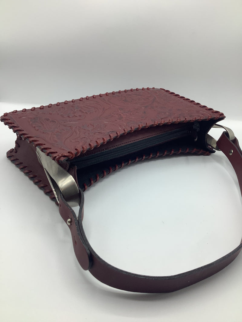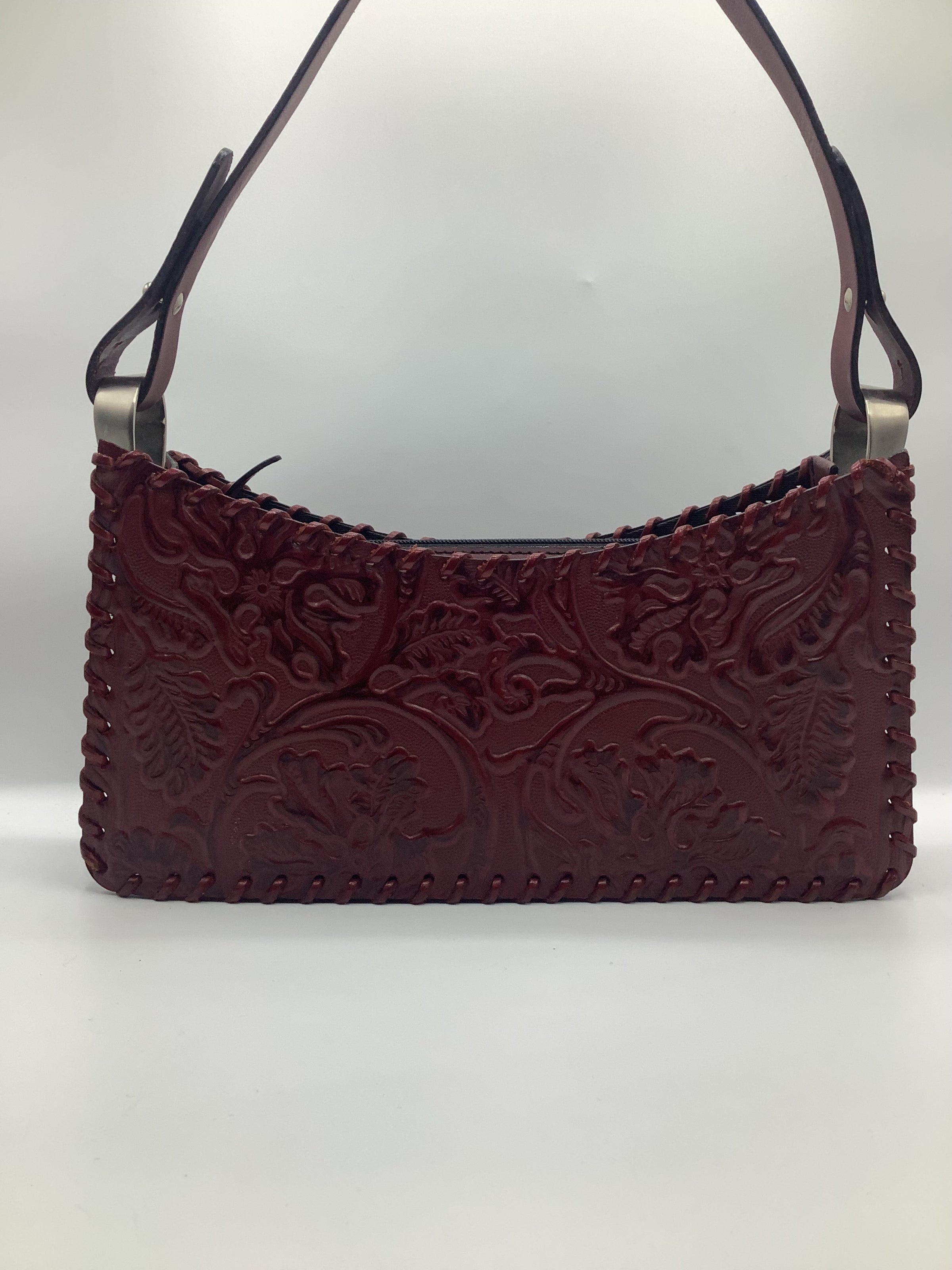 Featuring a vibrant Textured Floral design Embossed onto high quality Vegan Leather on the front of the bag, on the side and bag panels is high quality smooth Vegan leather, which showcases the rich, deep wine red colouring.