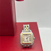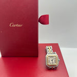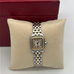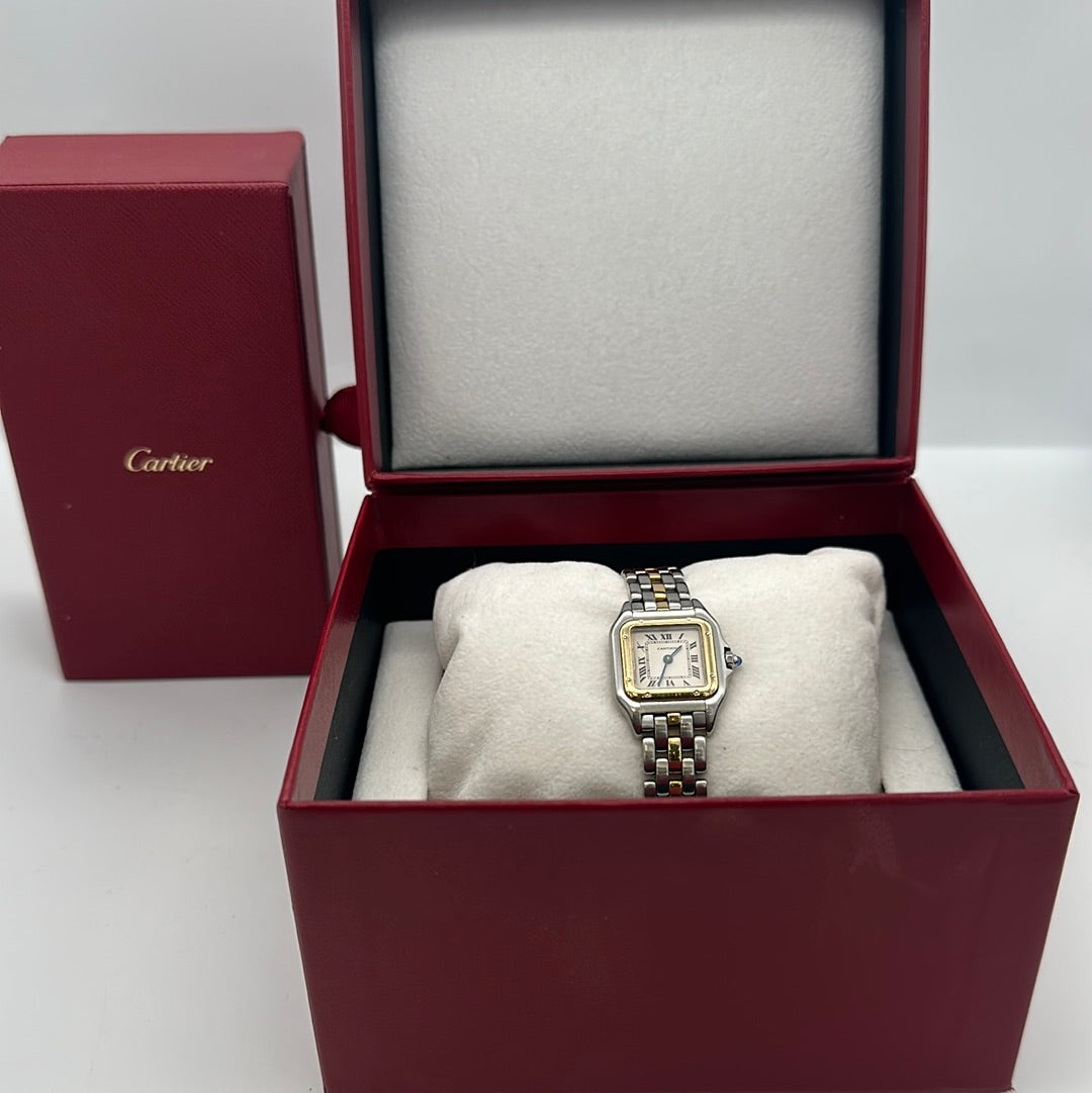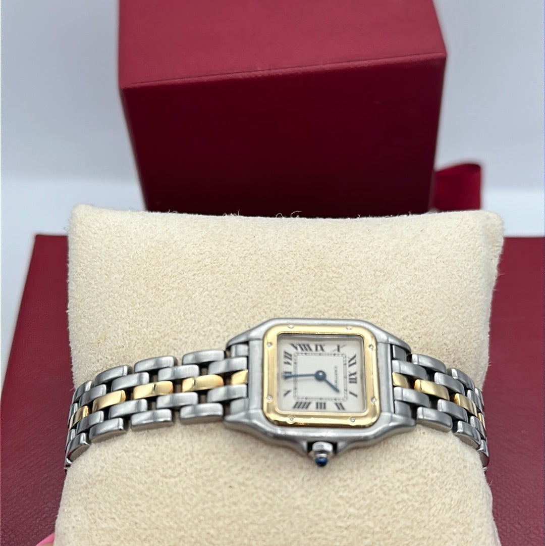 Panthère de Cartier watch, small model, quartz movement. This watch is presented in excellent condition, having been only worn a few times and has original box . Case in stainless steel and yellow gold, dimensions: 27 mm , crown set with a synthetic blue spinel, white dial, blued-steel sword-shaped hands, bracelet in yellow gold and steel with one gold centre links per four links. Water-resistant to 3 bar (around 30 metres).