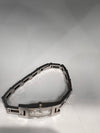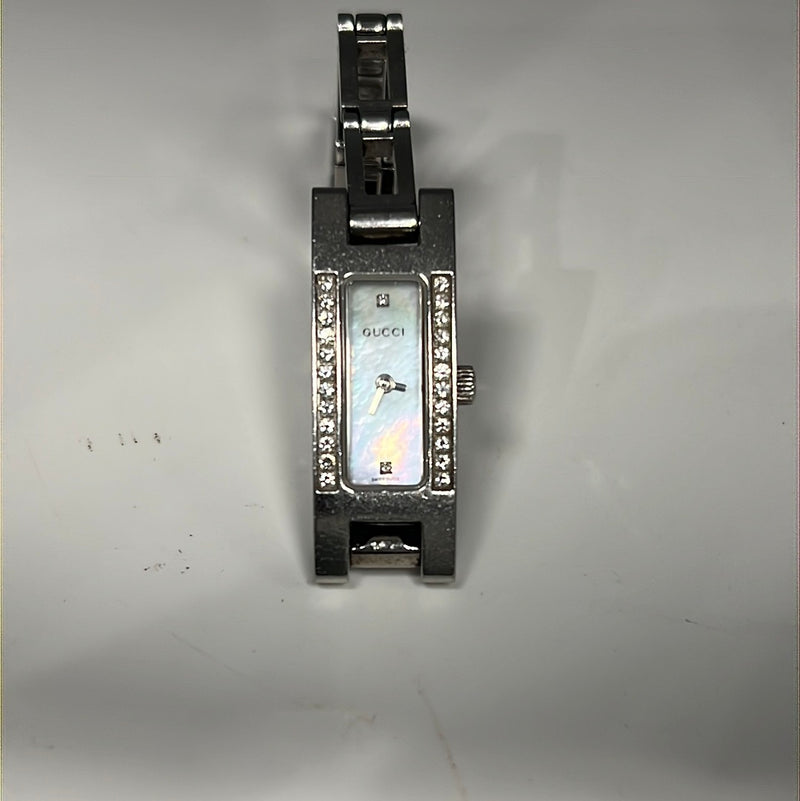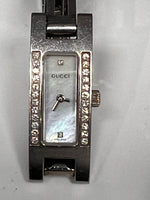 Gucci 3900L ladies watch in stainless steel with a mother of pearl dial and diamond set shoulders.