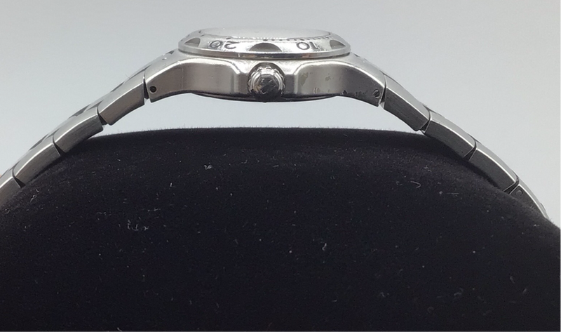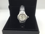 This pre-owned ladies stainless steel Tag Heuer watch shows signs of wear and is without paperwork or original box but has a quartz movement with a date window at the 3 o-clock position, hour, minute and second hands and a screw down crown.