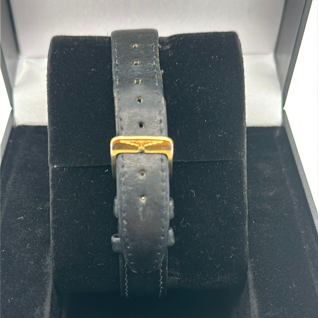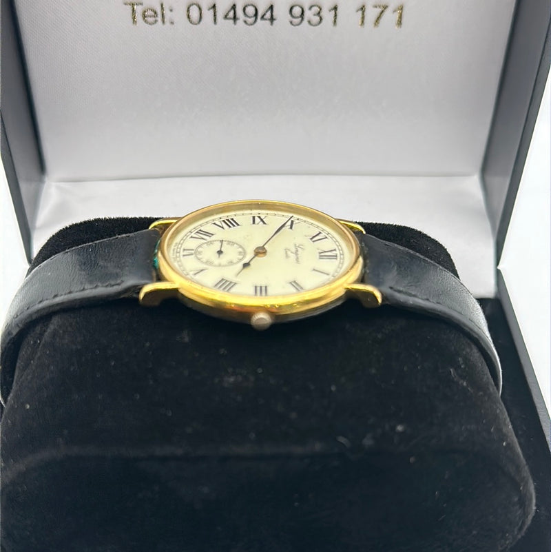 This stunning Longines 150th anniversary features a 32mm stainless steel gold plated round case, an antique dial with black roman numeral hour markers and a sub dial at 6 O'clock.