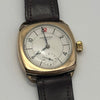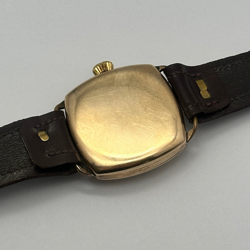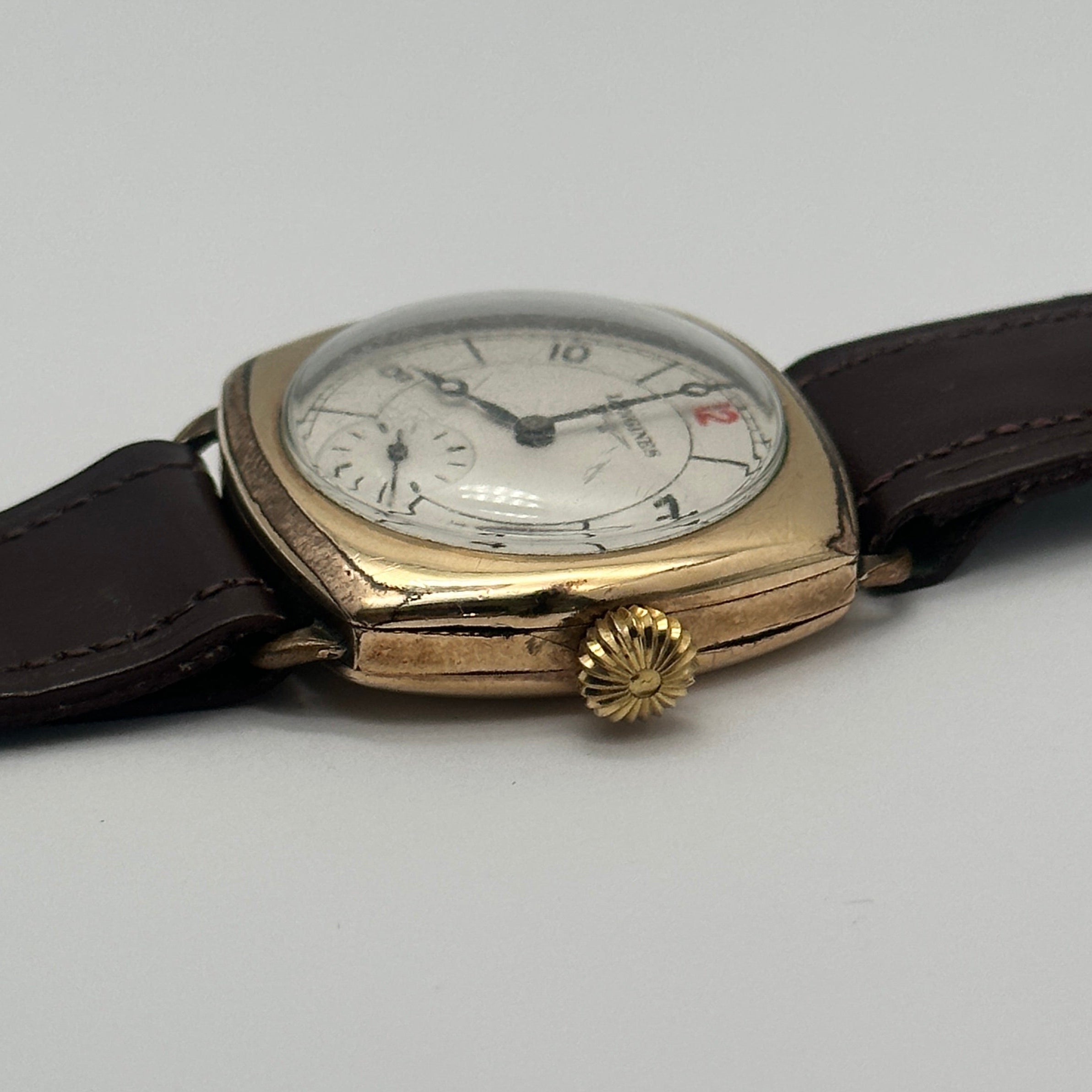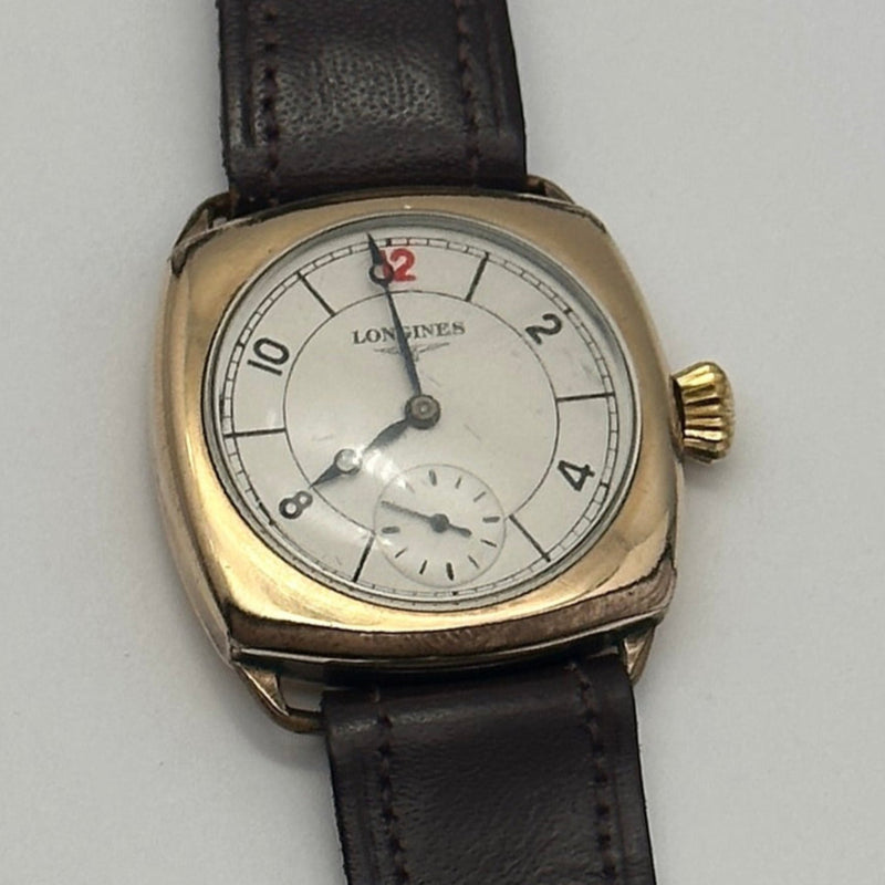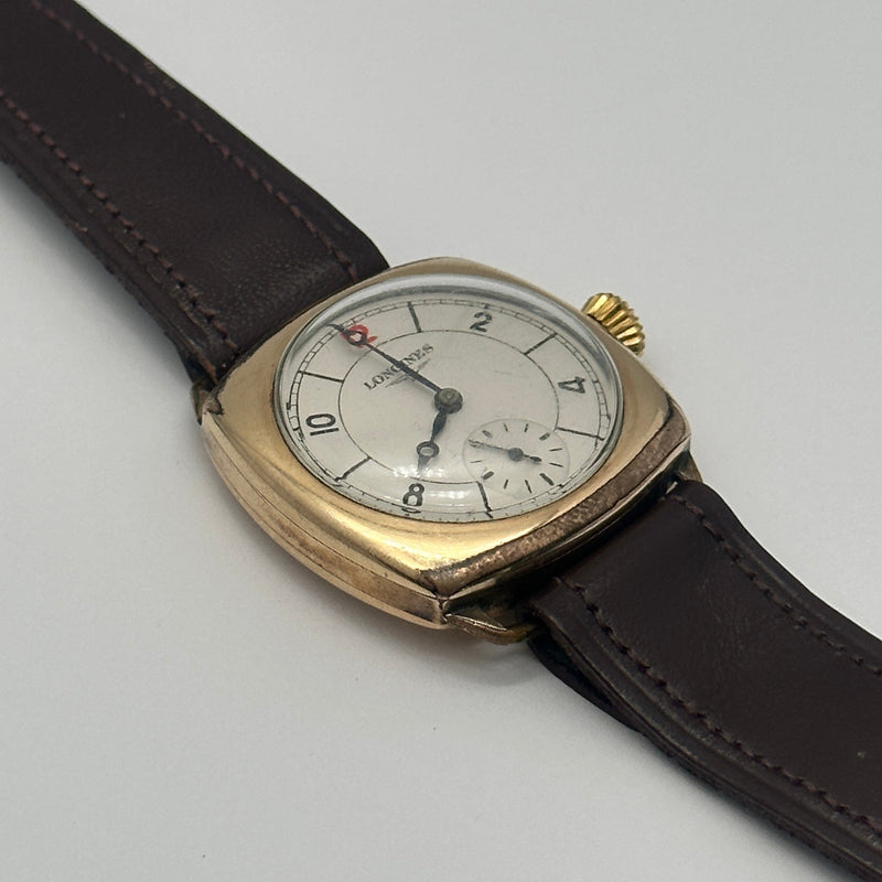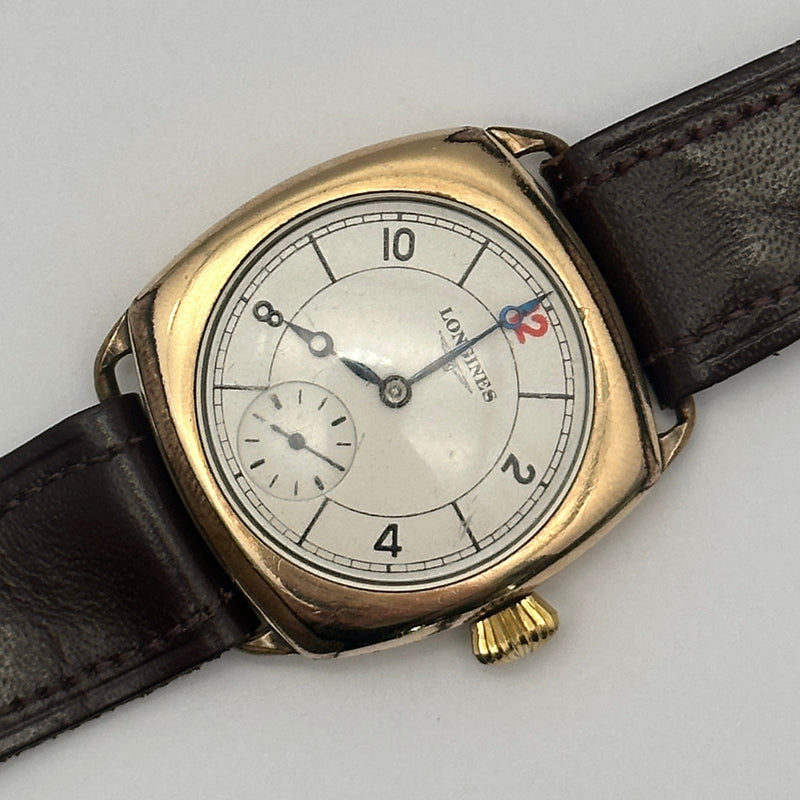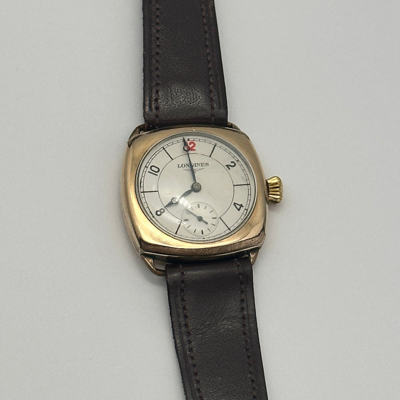 This refined vintage Longines timepiece is a stunning example of early 20th-century watchmaking. Housed in a cushion-shaped 9ct gold case, the watch features a classic ivory-toned dial with Arabic numerals, elegant blued steel hands, and a subsidiary seconds dial at the 6 o’clock position. The clean design is elevated by a charming red “12” marker—an iconic detail found on select vintage models. Paired with a dark brown leather strap, it maintains its original sophistication and timeless appeal. The manual wind movement inside reflects Longines' longstanding commitment to mechanical precision.