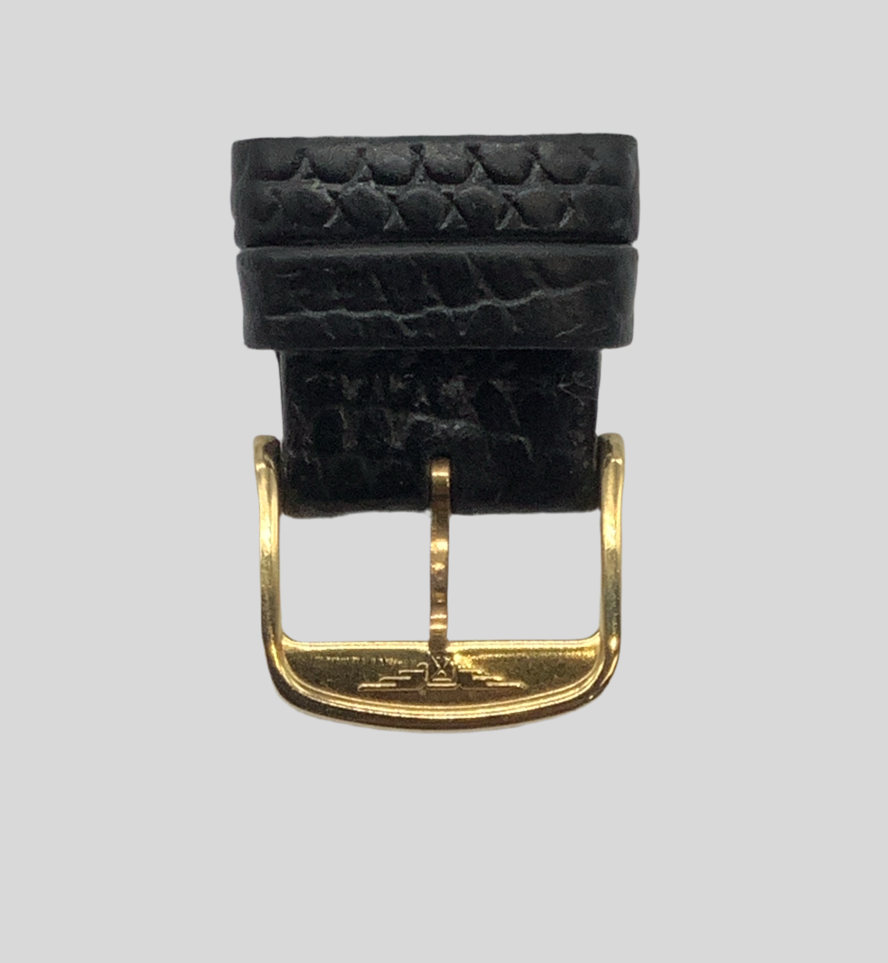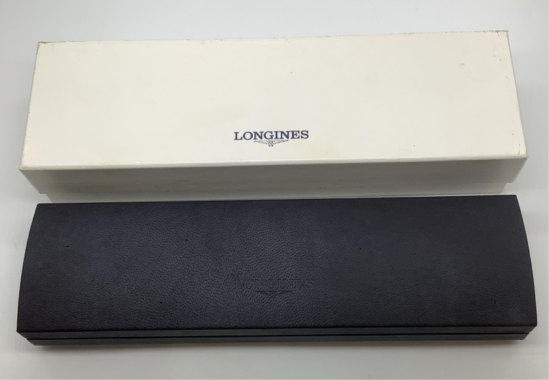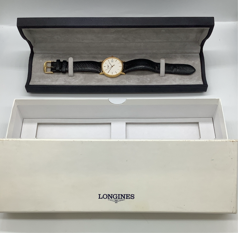 Bracelet: The watch is paired with an original Longines black leather strap with lizard printing and the original gold-plated Longines 'winged hourglass' buckle.