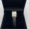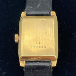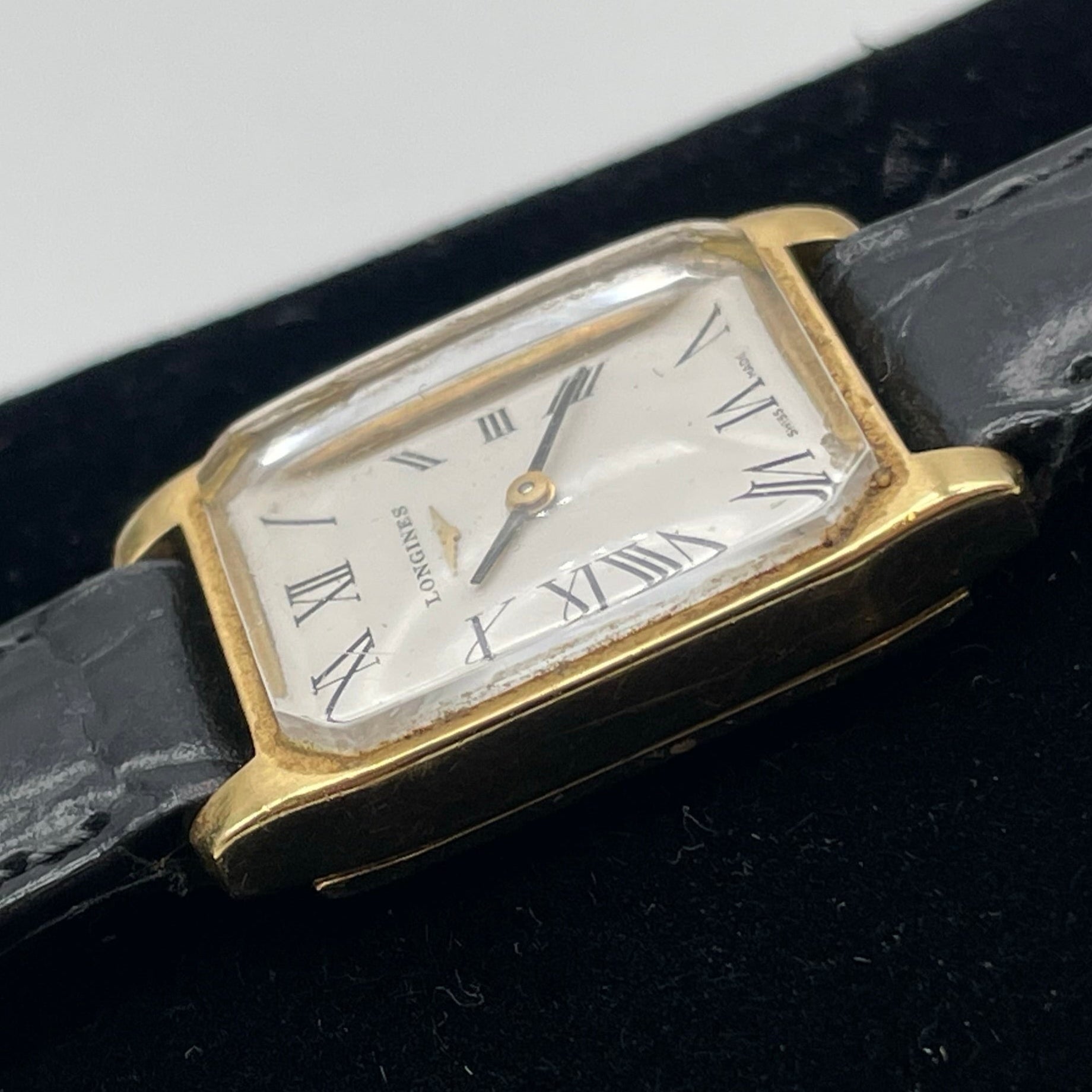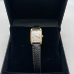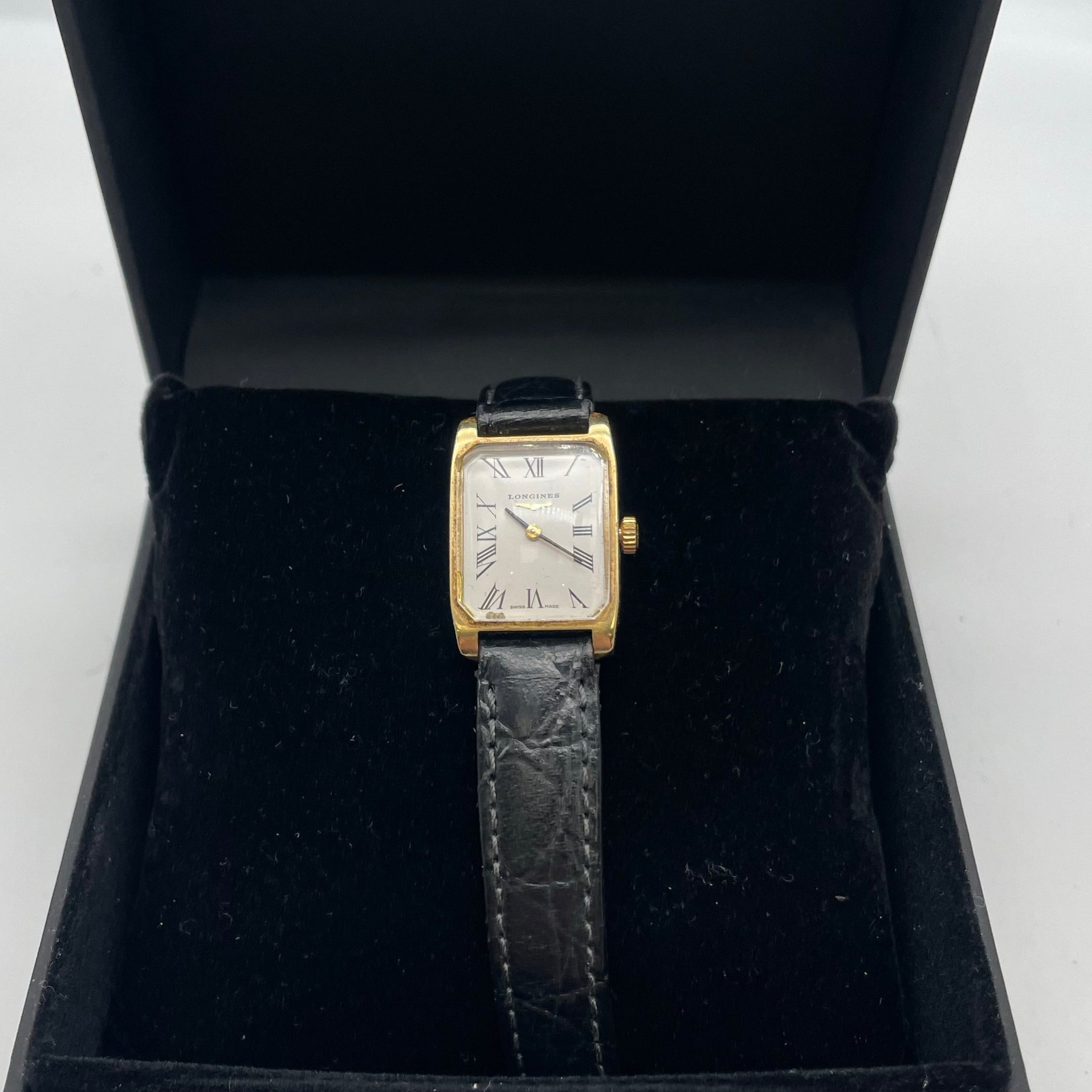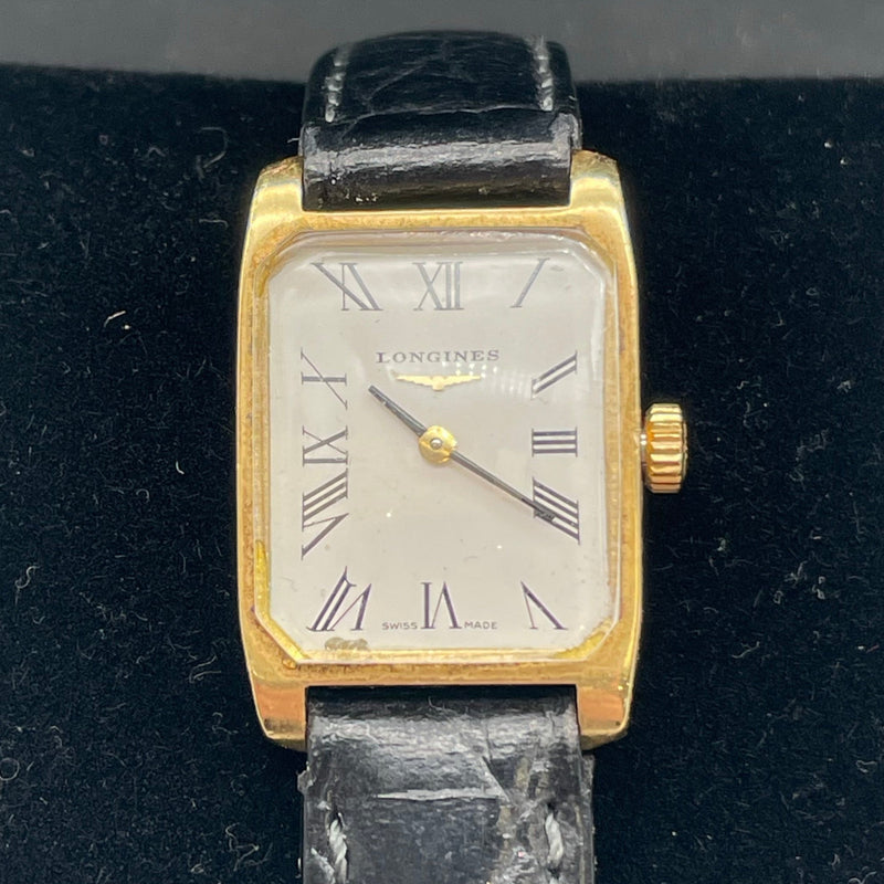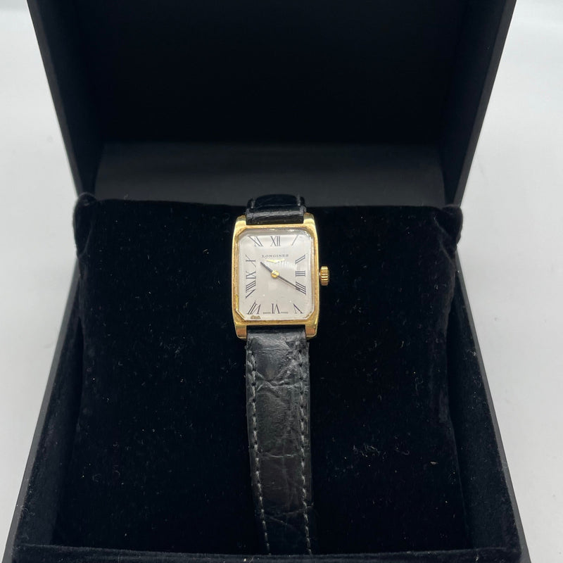 This elegant vintage ladies' dress watch by Longines features a classic gold case paired with a black leather strap, epitomising timeless sophistication. The gold case, often crafted from 14k gold, showcases the brand's commitment to luxury and durability. The black leather strap adds a touch of understated elegance, ensuring versatility for various occasions.