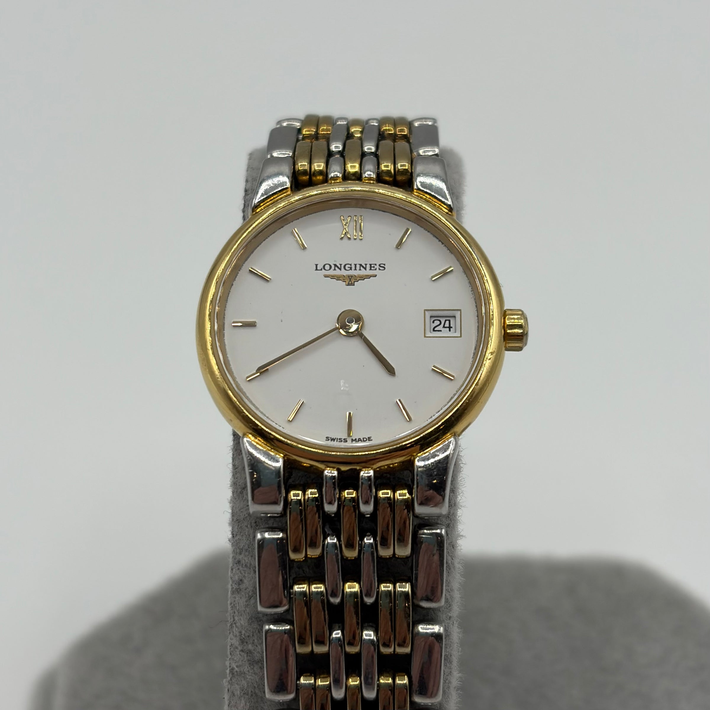 Introducing the Longines L5.132.3 Grand Classic Ladies’ watch – an elegant hybrid of steel and 18 k gold plated detailing. Its refined 24 mm stainless steel case is delicately framed with gold-toned accents, creating a timeless aesthetic that is both slender and poised on the wrist. The white dial features a Roman numeral at 12 o'clock paired with simple baton markers, sleek hour and minute hands, and a date aperture at 3 o’clock