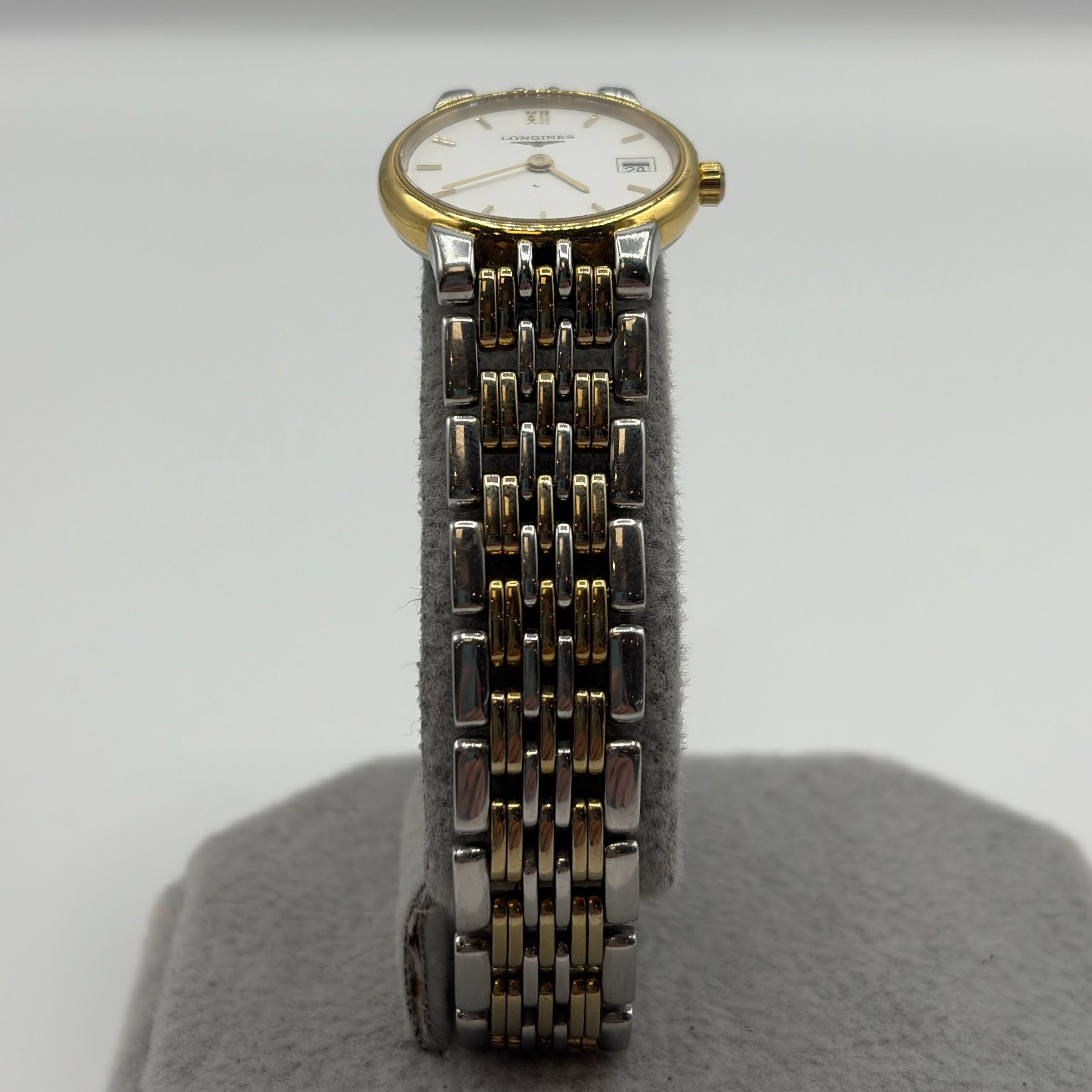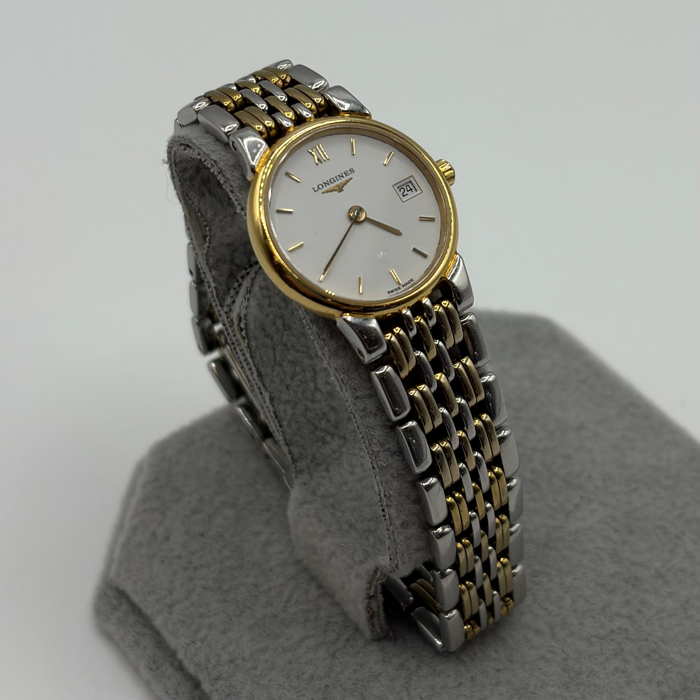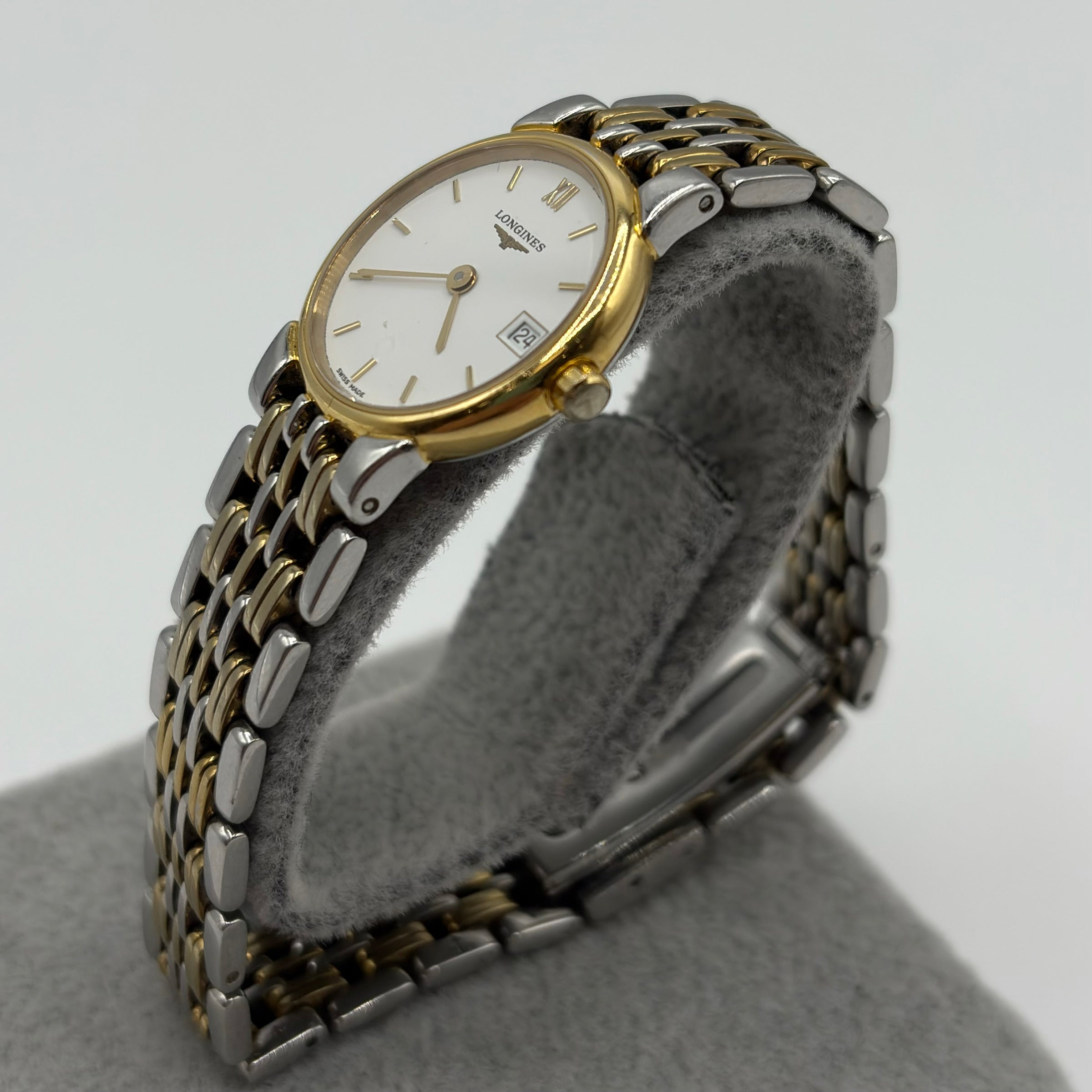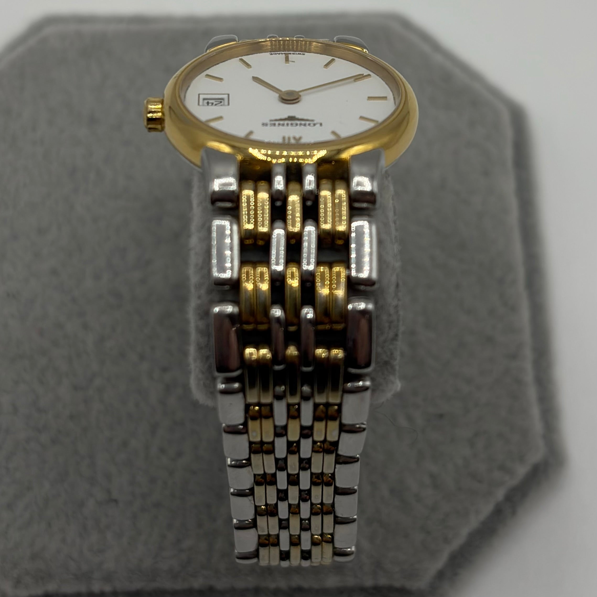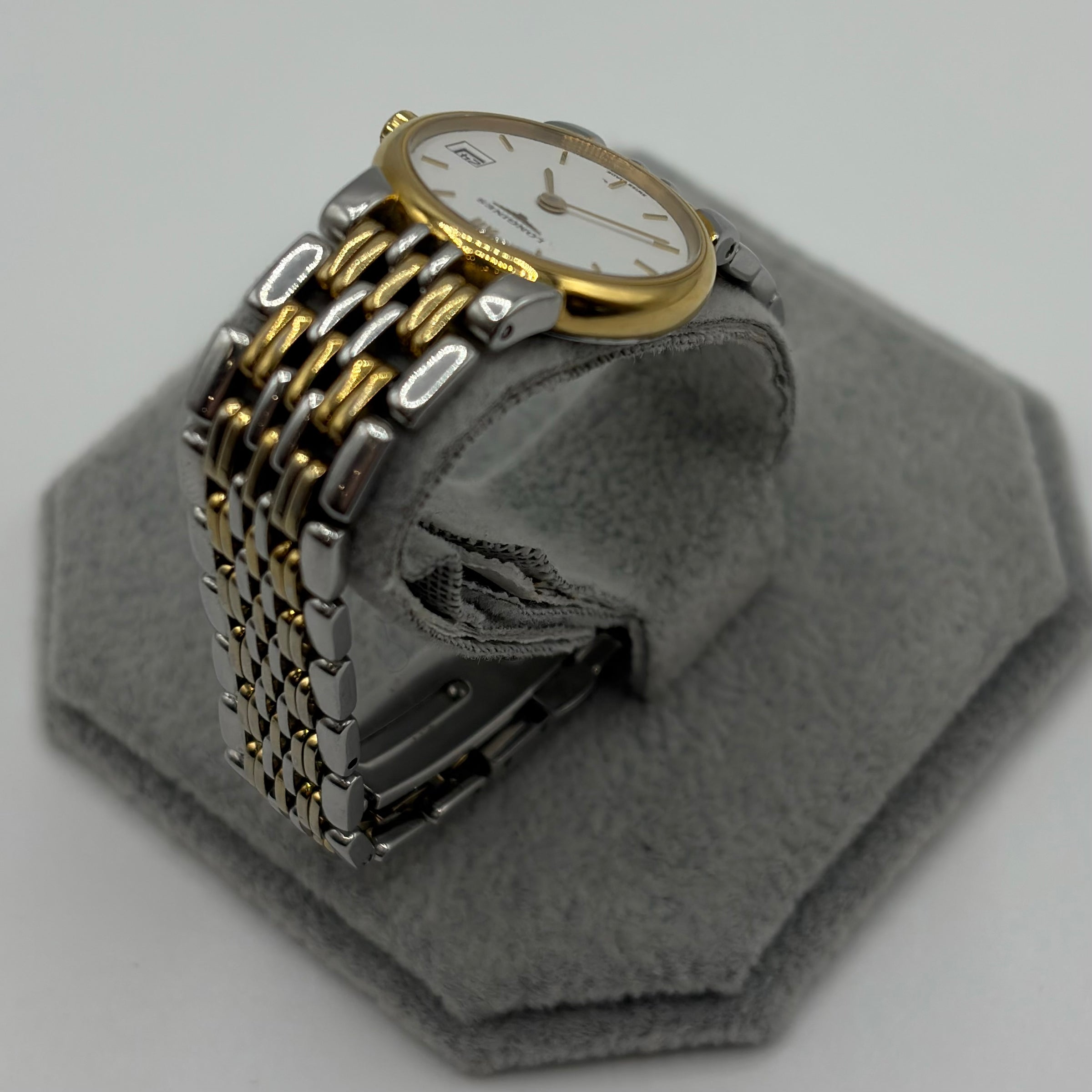 Powered by a Swiss quartz movement (Longines calibre L.160.2) with six jewels, this watch guarantees precision and reliability without the need for winding. The bracelet mirrors the two‑tone case with polished stainless steel and gold-plated centre links, securing with a sliding clasp for a seamless silhouette.