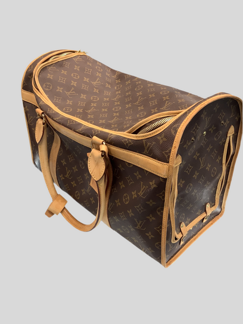 The Louis Vuitton Dog Carrier 40 is meticulously crafted from the brand's iconic Monogram coated canvas, complemented by natural cowhide leather trim. This combination ensures both durability and timeless style.