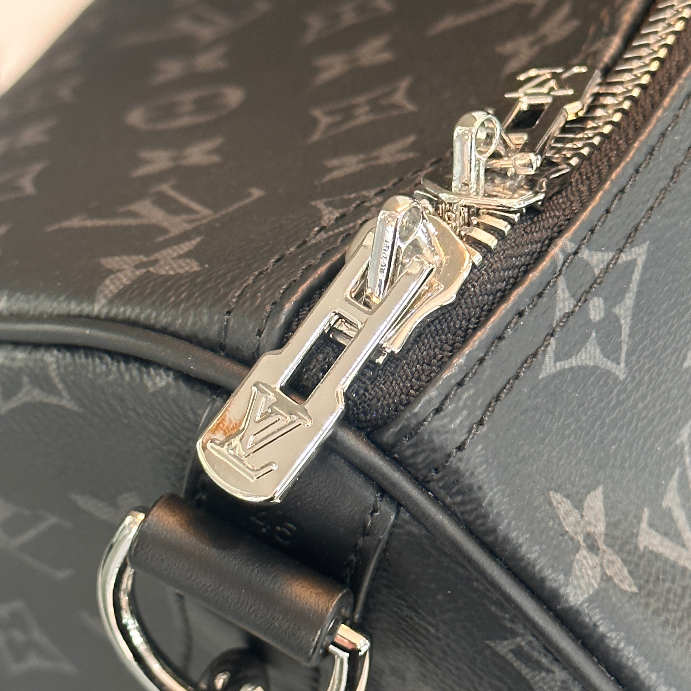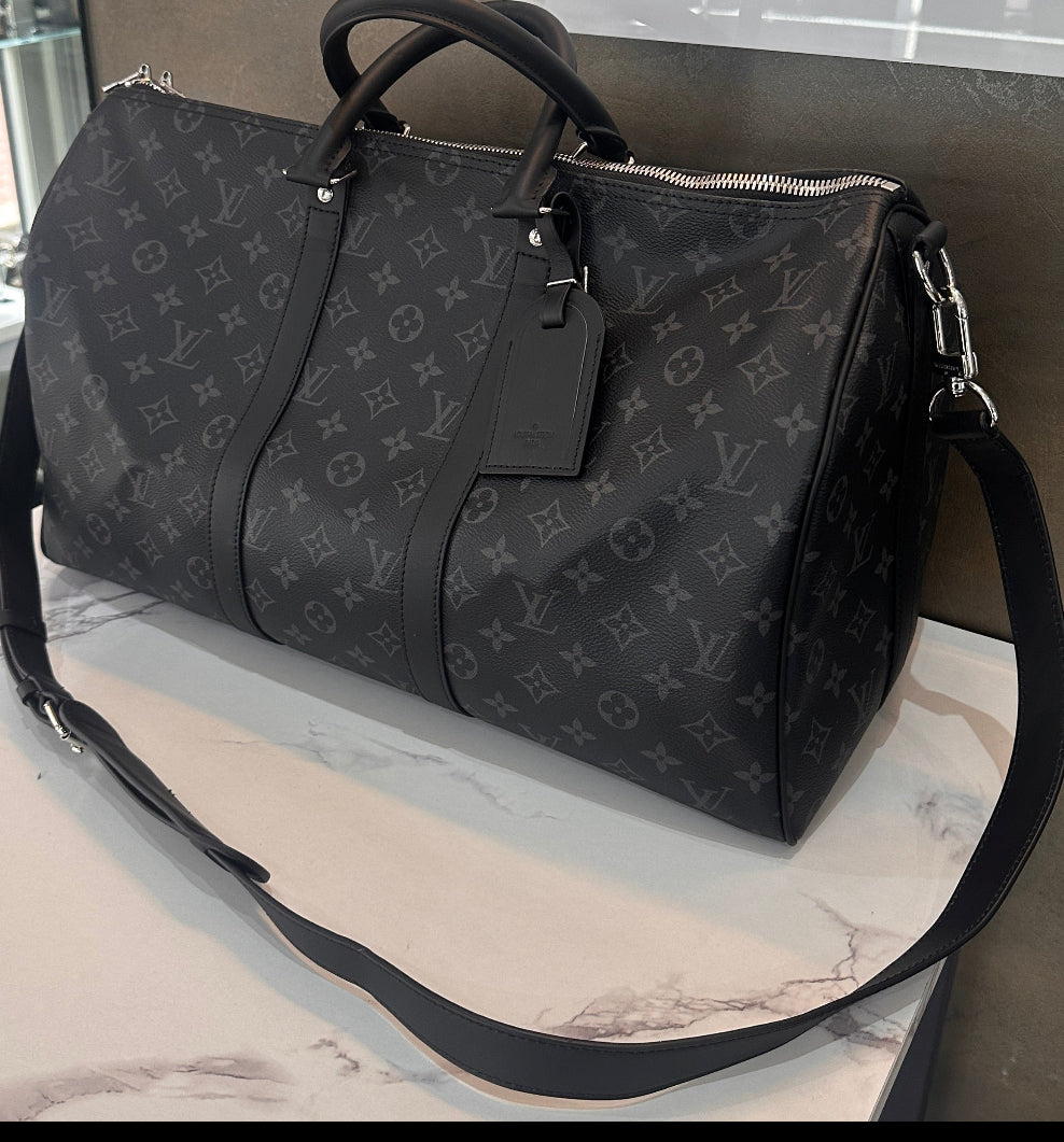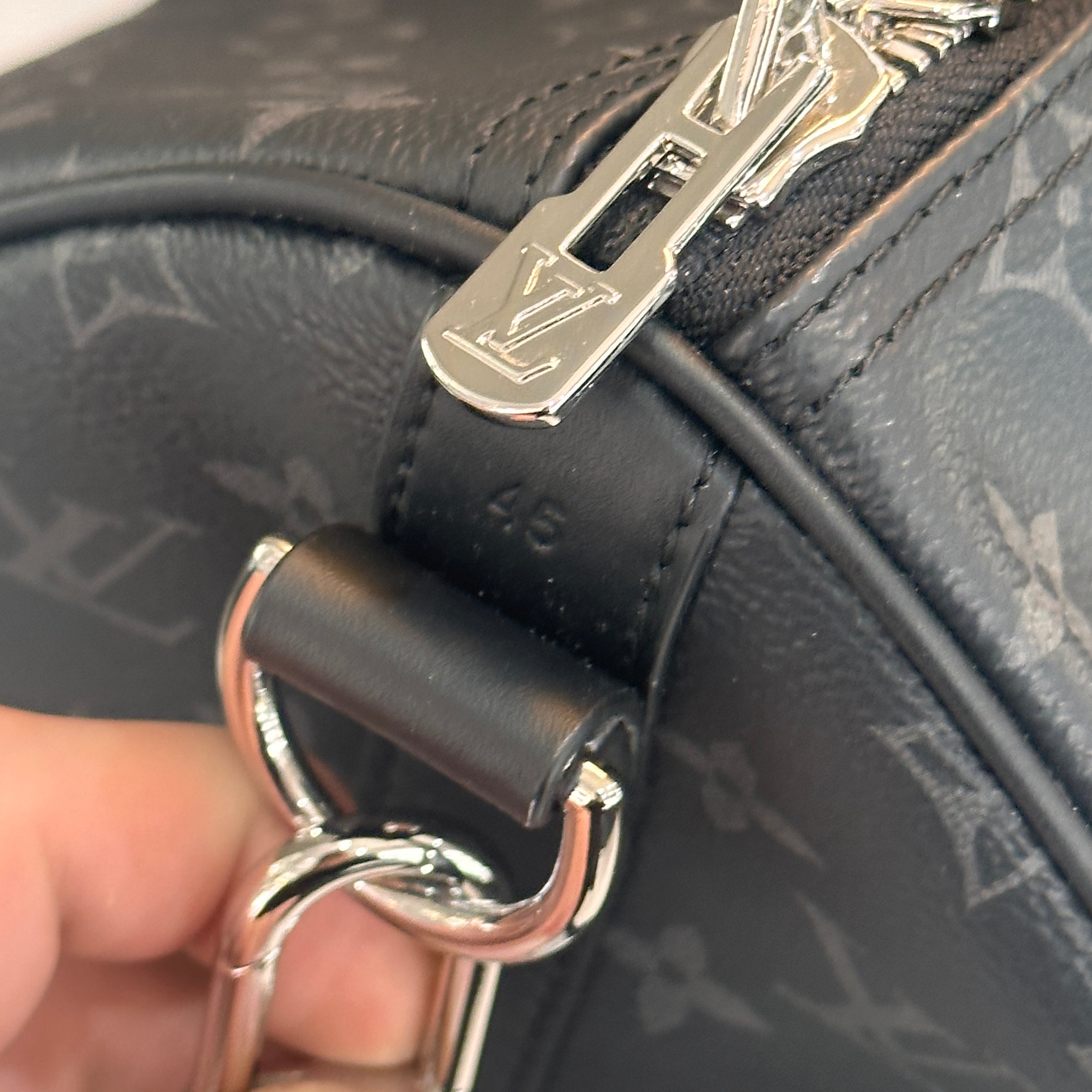 The bag's clean, minimalist look in black adds to its modern appeal, and its classic design ensures it remains timeless. The black Keepall 45 is highly regarded for its durability, craftsmanship, and the understated luxury it conveys.