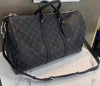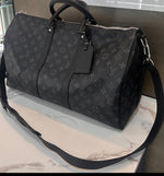 The Louis Vuitton Keepall 45 in black is a luxurious and iconic travel bag from the French fashion house. It is part of the Keepall collection, which was originally introduced in 1930 as a stylish and practical duffel bag for travel. The Keepall 45 is the medium size, measuring 45 cm in length, which offers a versatile option for both short trips and everyday use.