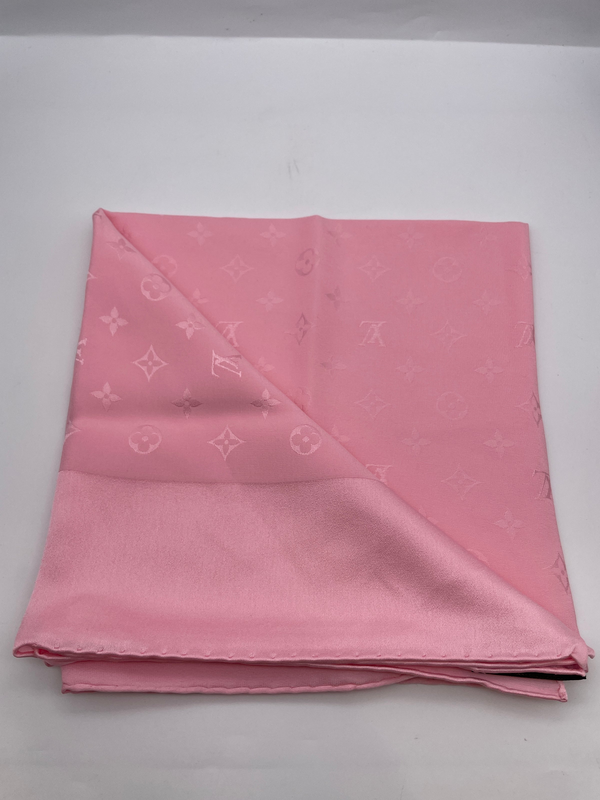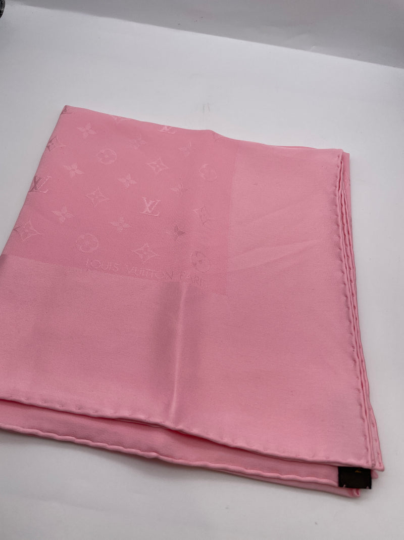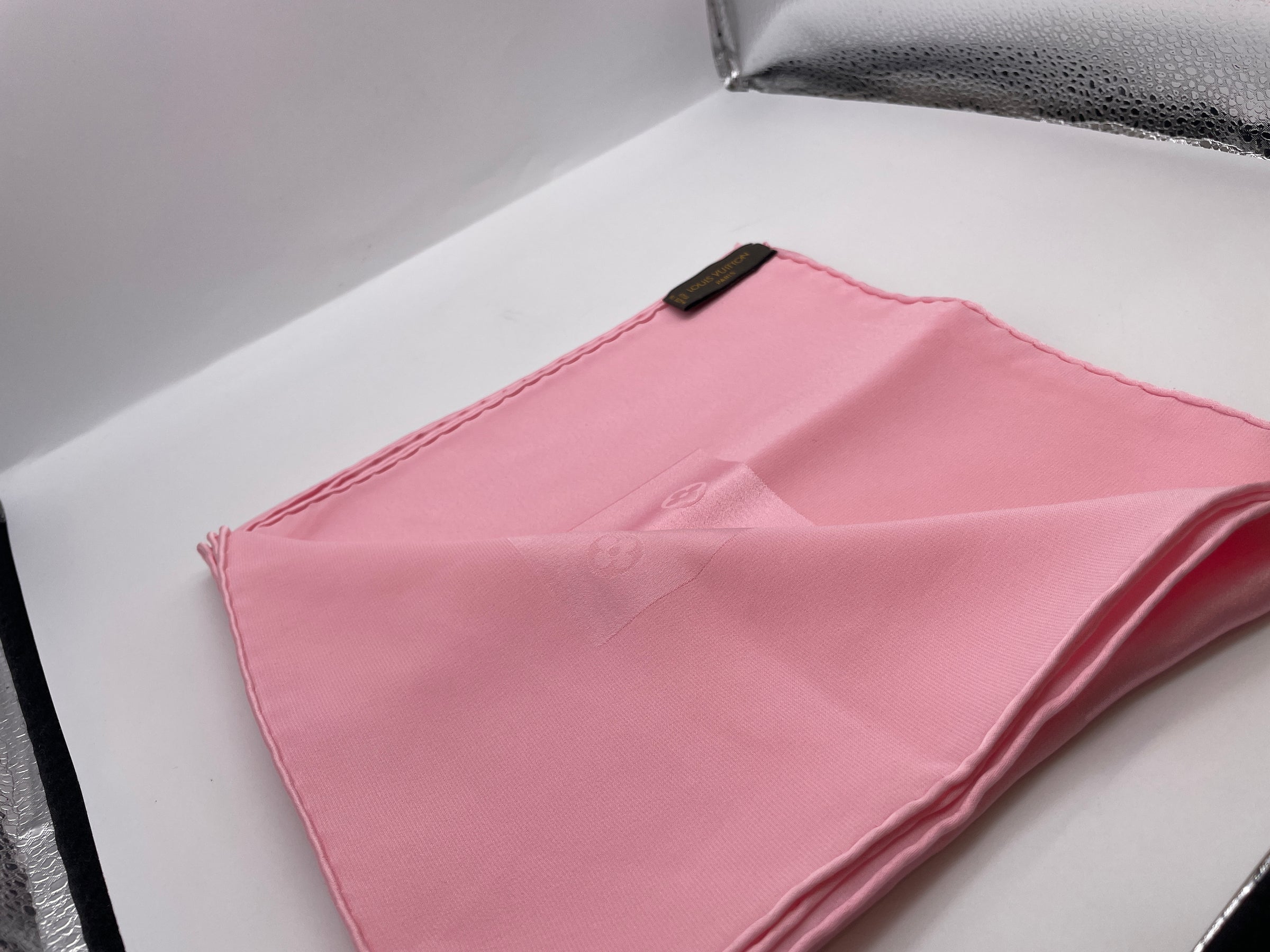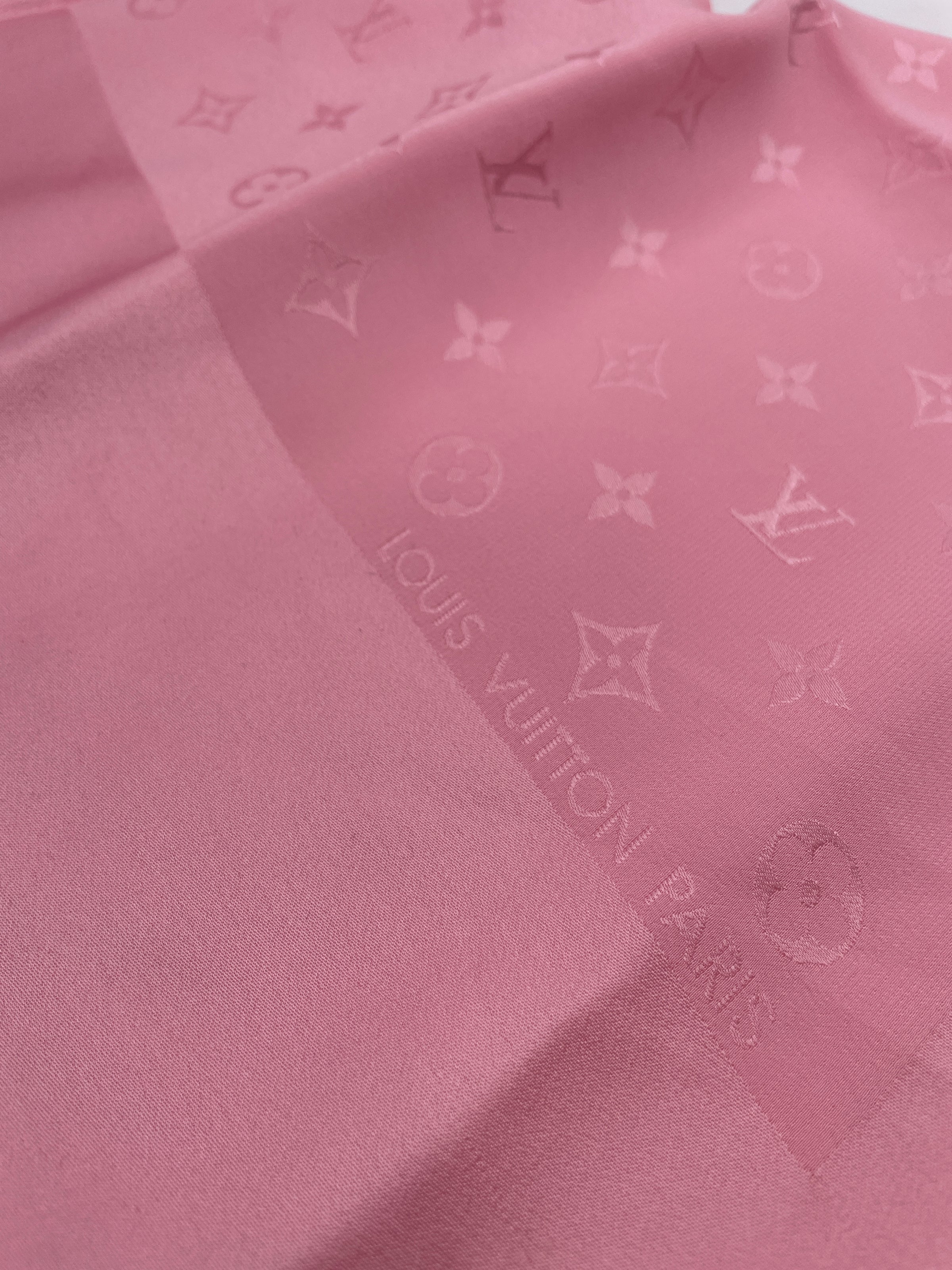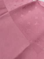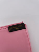 Louis Vuitton Ladies Pink Silk Square Scarf with monogram print.