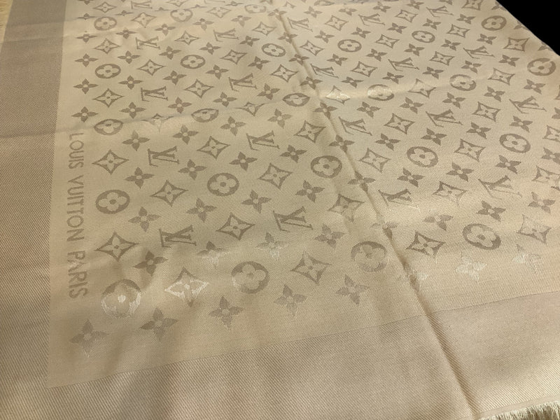 Design: The shawl features the iconic Monogram pattern woven using a jacquard technique, creating a subtle yet elegant tone-on-tone effect. Its generous dimensions make it versatile for various styling options, whether draped over the shoulders or wrapped around the neck. The fringed edges add a touch of refinement to the overall design.