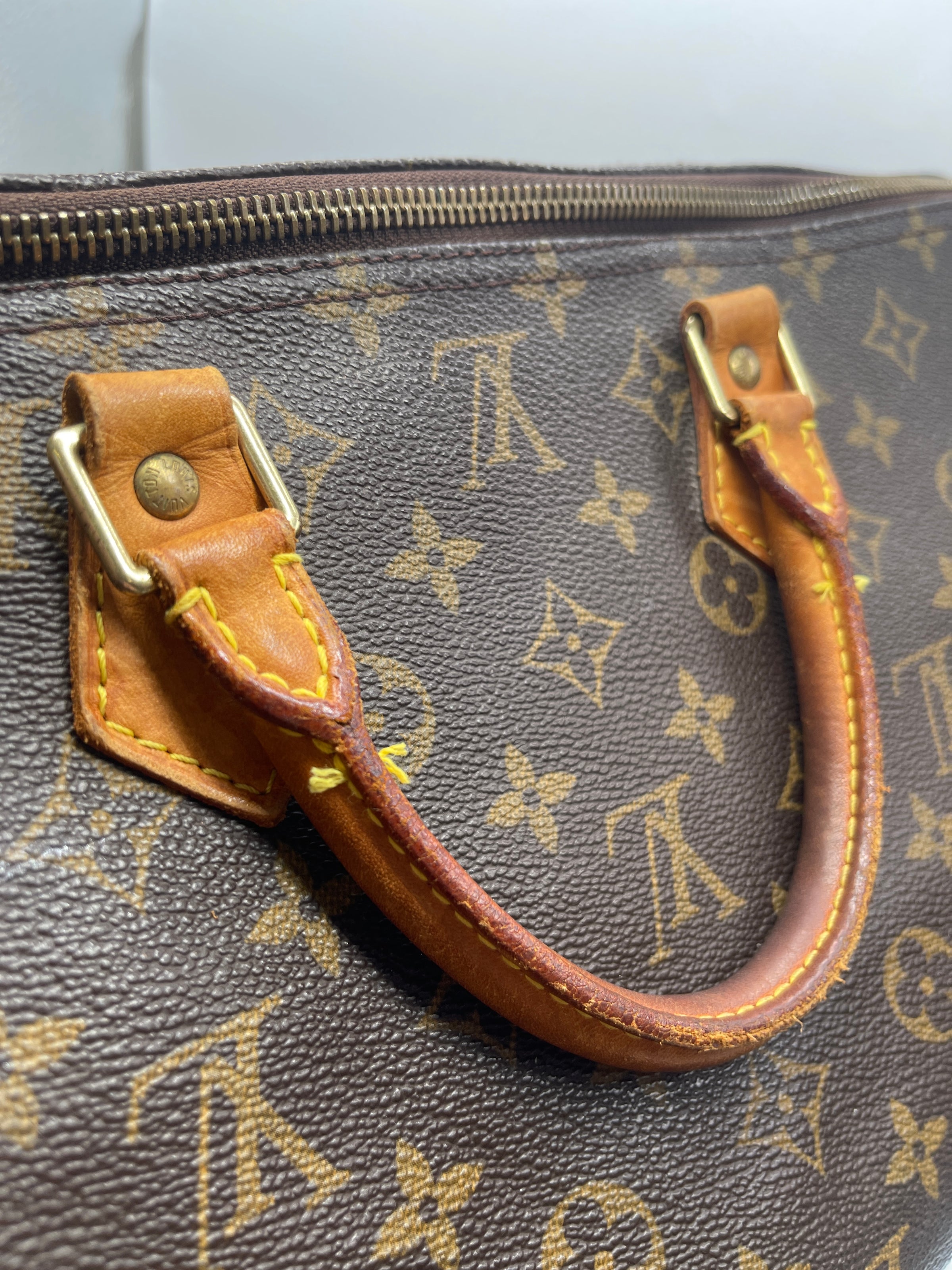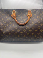 Materials & Design: The Louis Vuitton Speedy 40 Handbag is meticulously crafted from the brand's iconic Monogram canvas, renowned for its durability and timeless appeal. The bag features natural cowhide leather trimmings and handles that develop a unique patina over time, enhancing its distinctive character. It's structured yet supple silhouette makes it a versatile accessory suitable for various occasions.