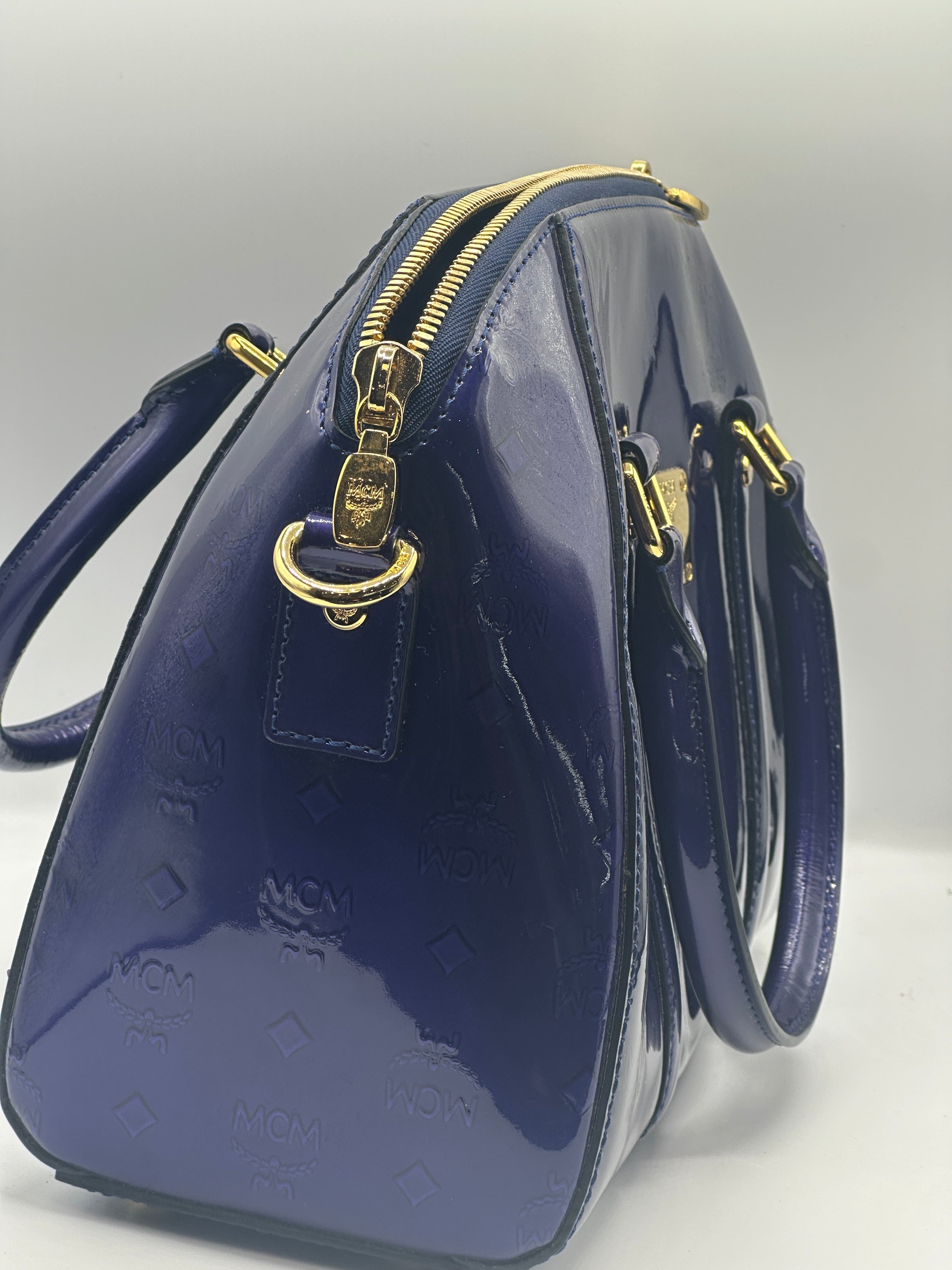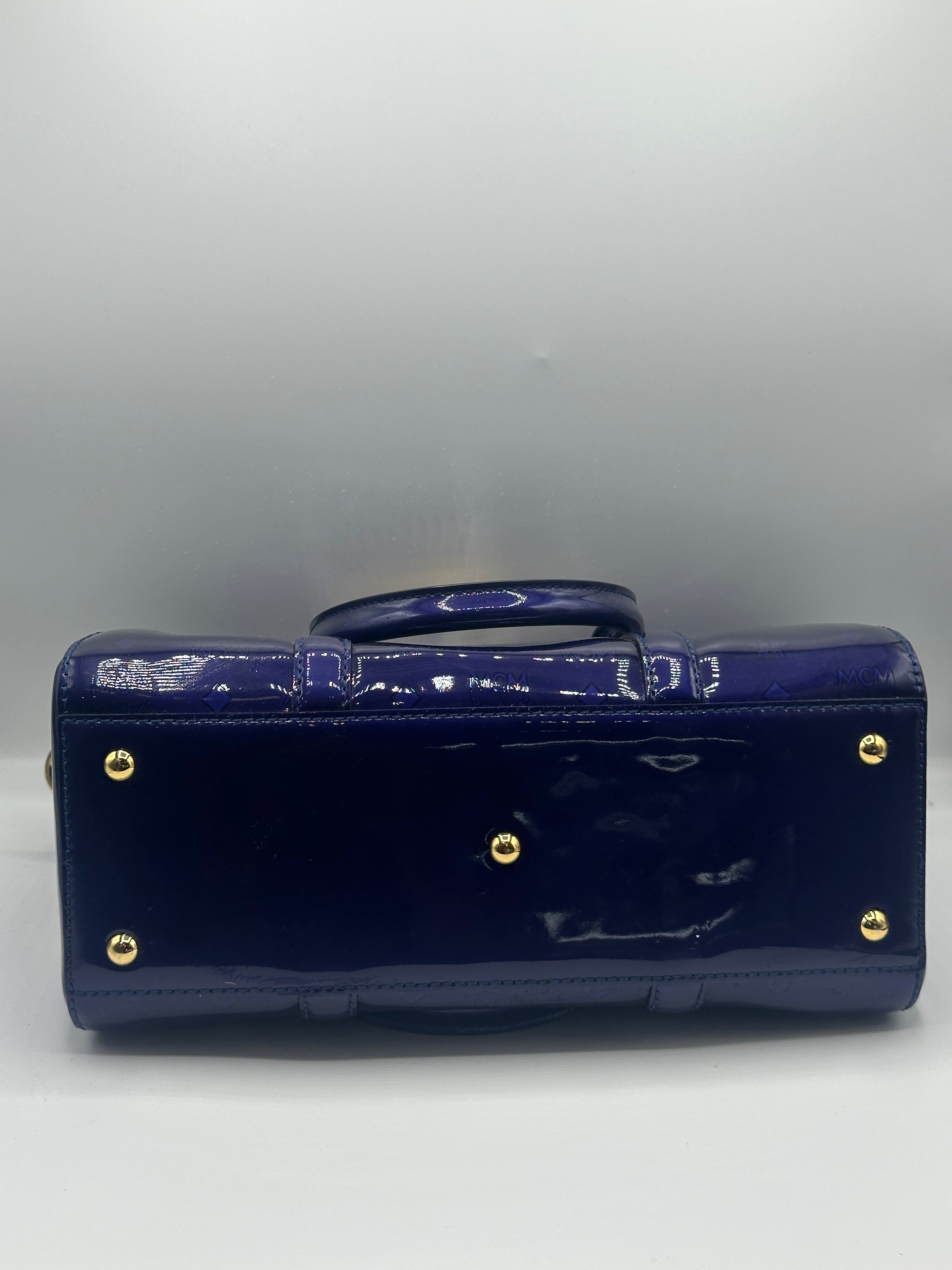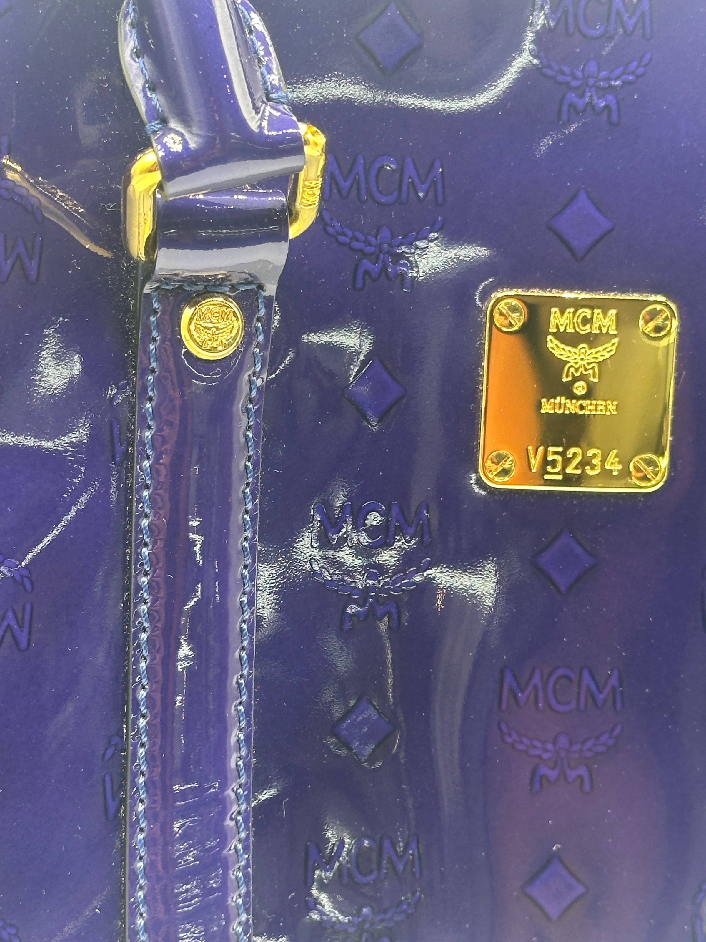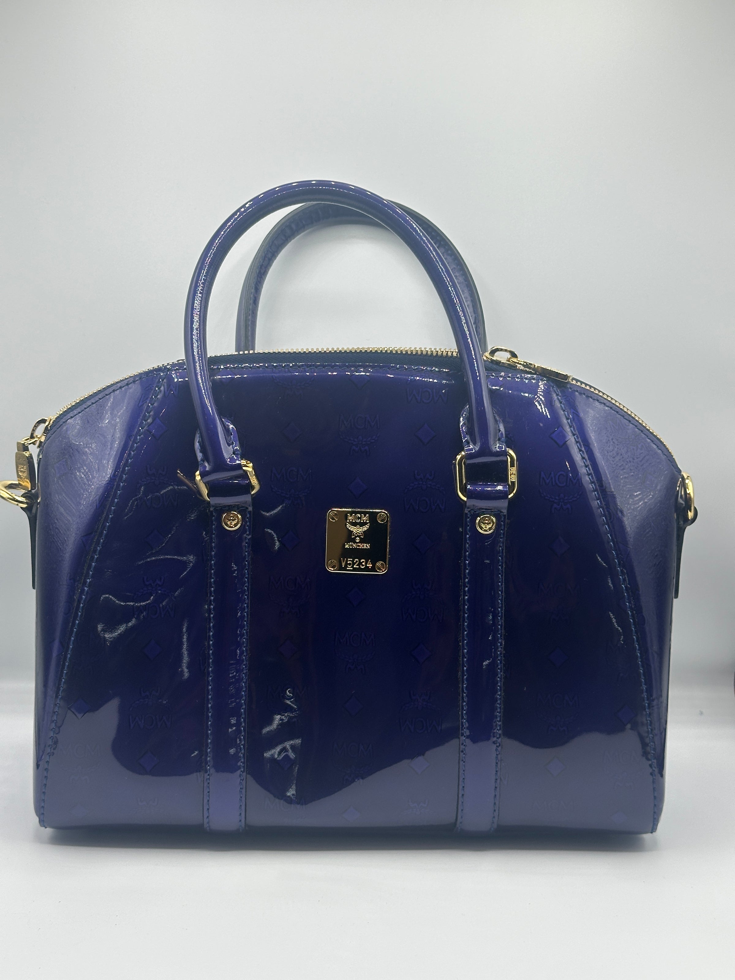 Material: Crafted from glossy patent leather, this bag showcases MCM's iconic Visetos monogram embossed throughout, offering a luxurious and durable finish.Design: The structured silhouette is complemented by dual rolled leather top handles and a detachable shoulder strap, providing versatility for hand or shoulder carry.