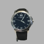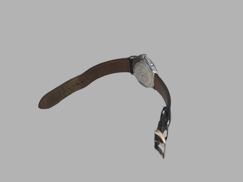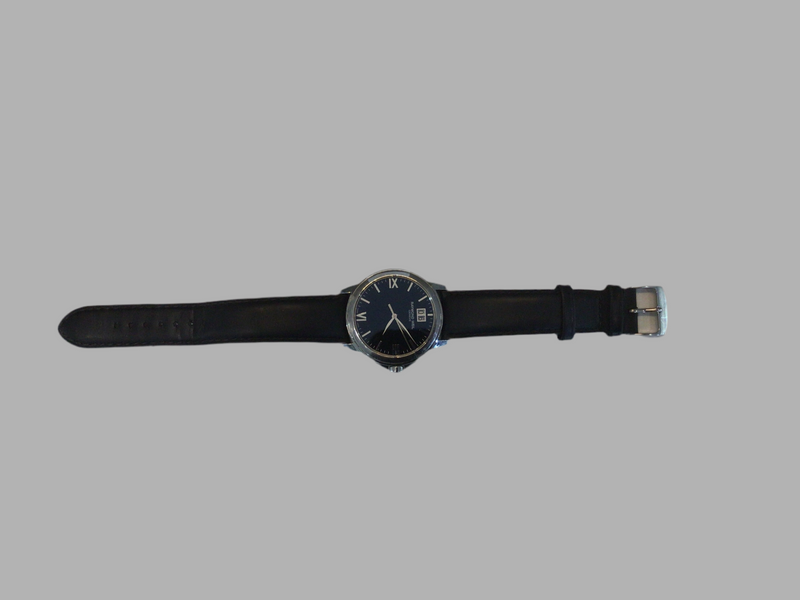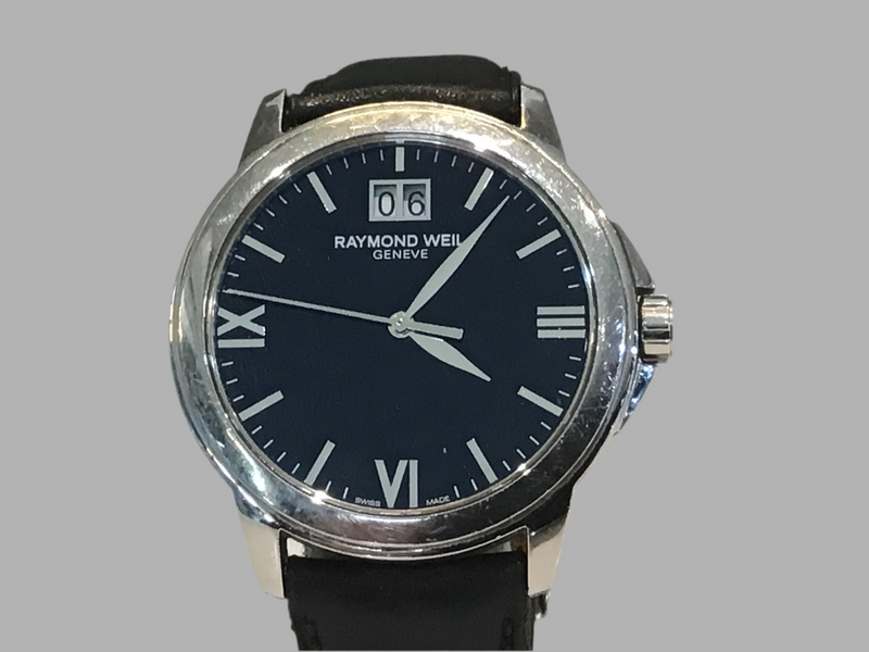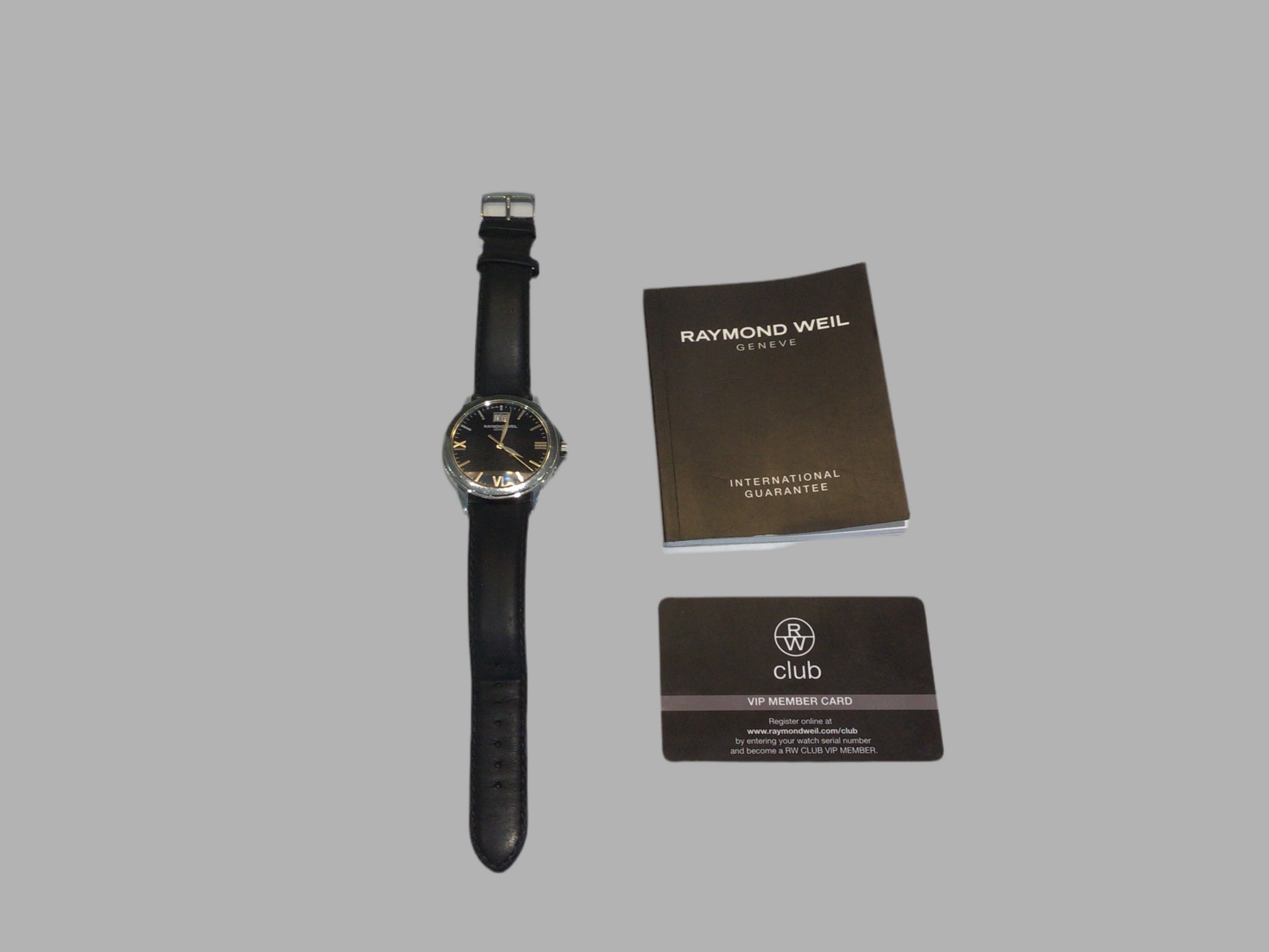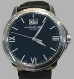 - Materials & Design: The Raymond Weil Tradition 5476-ST-00657 features a 39mm stainless steel case paired with a black leather strap, exuding timeless elegance. The black dial is adorned with silver hands and a combination of silver index hour markers and Roman numerals at the 3, 6, and 9 o'clock positions.