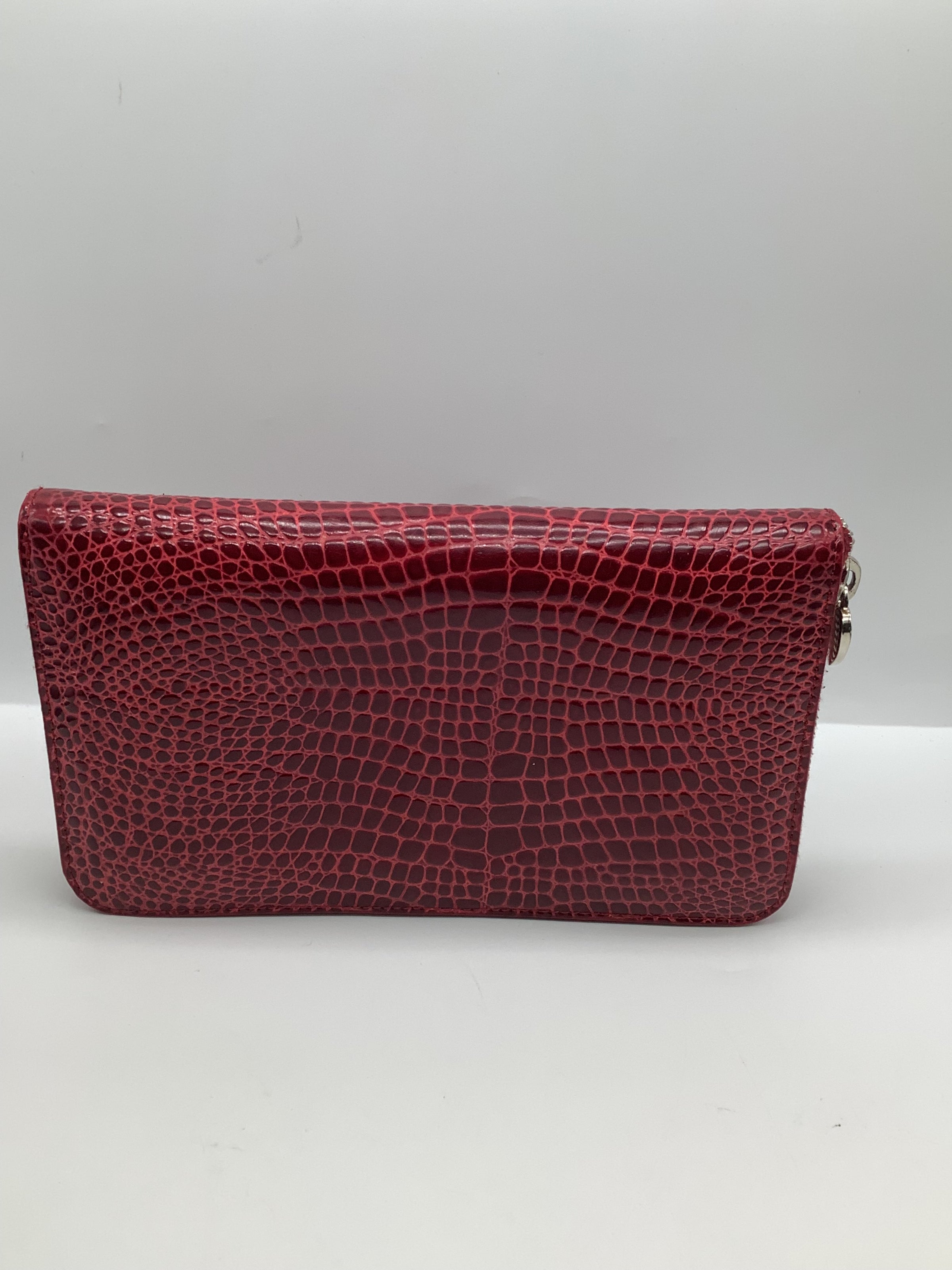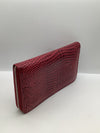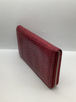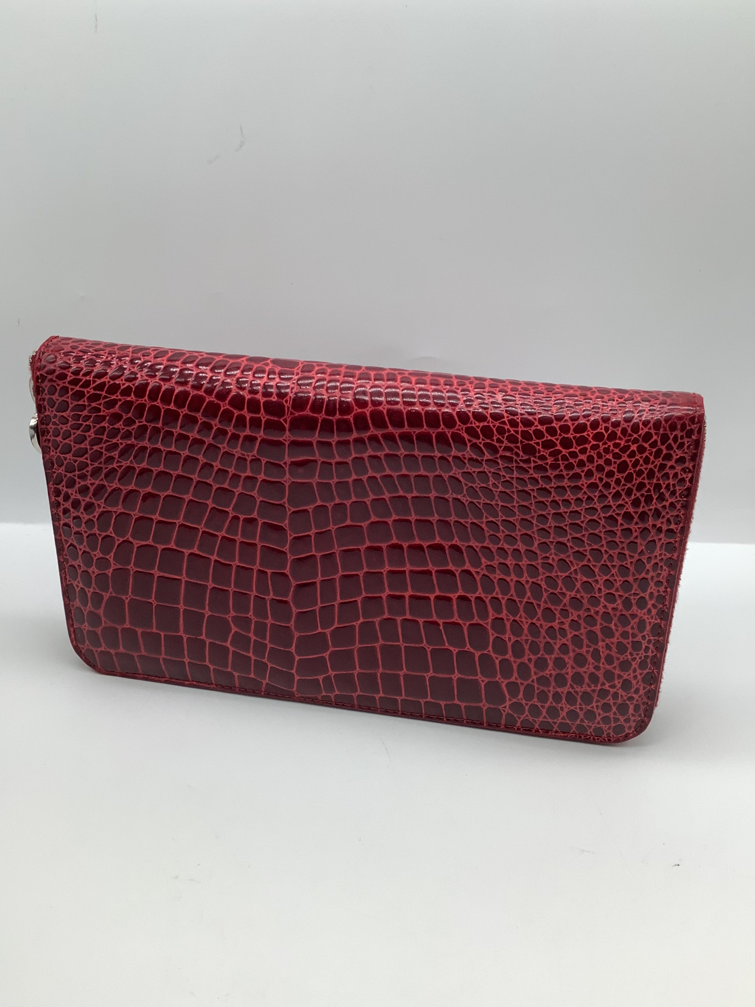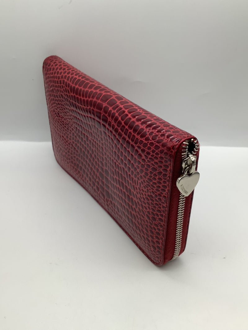 Materials & Design: The Moschino Wine-Coloured Crocodile Purse is a vintage clutch bag crafted from crocodile-embossed leather in a rich burgundy hue. The design features a sleek, rectangular silhouette, embodying timeless elegance.