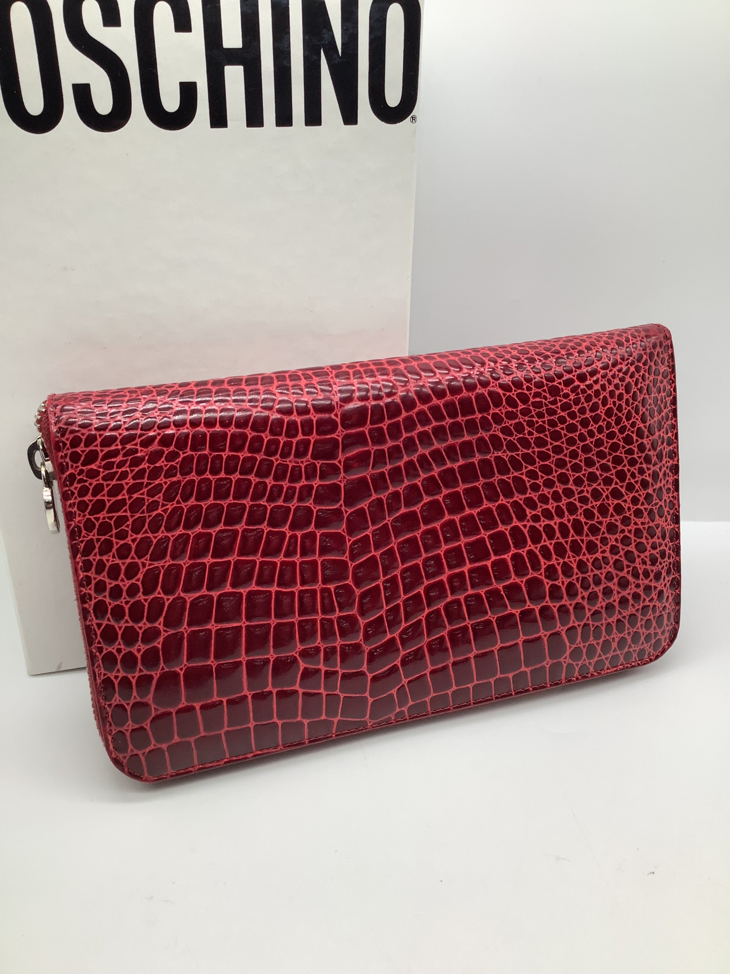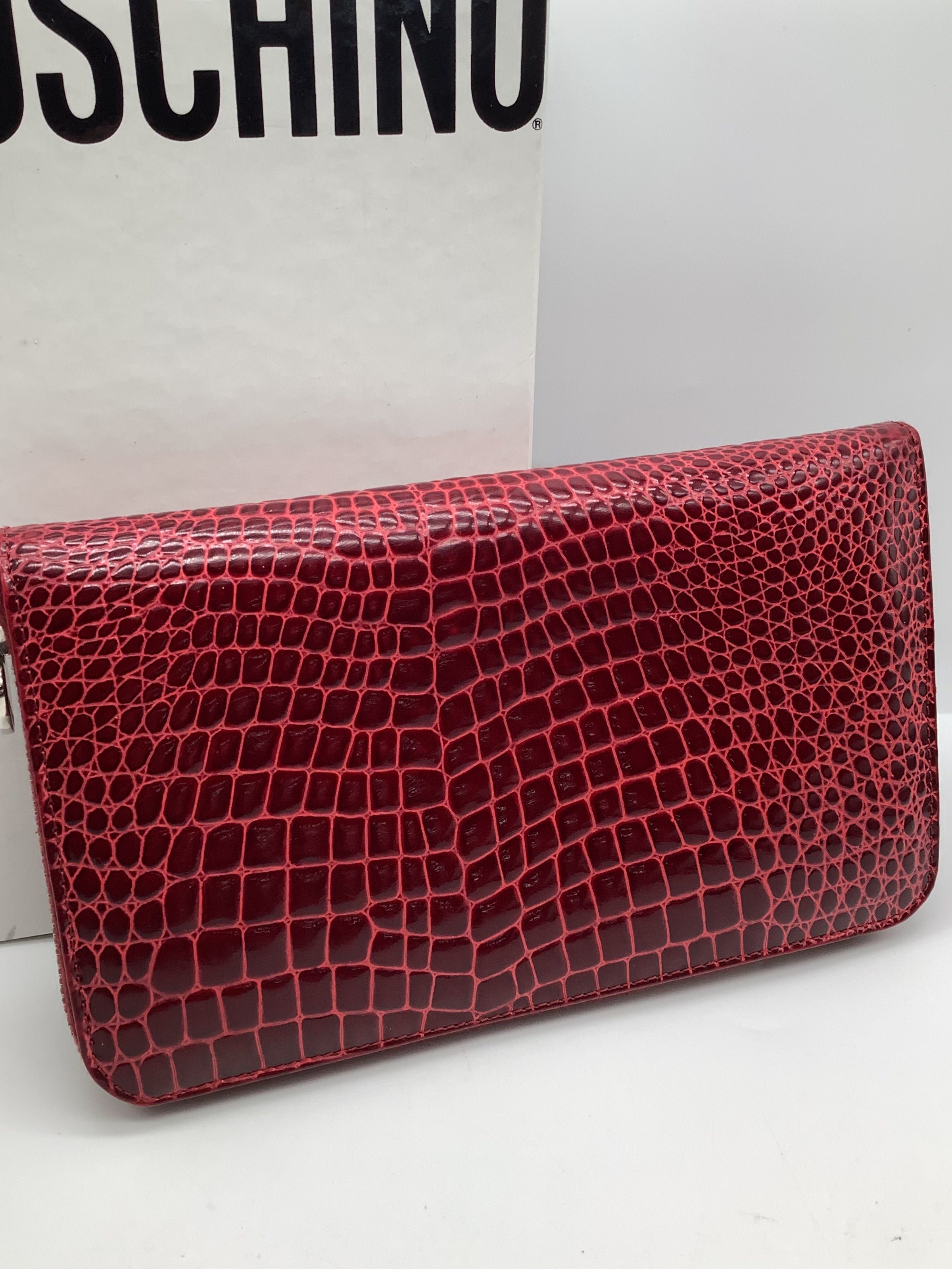Founded in 1983 by Franco Moschino, the Italian luxury fashion house Moschino is renowned for its innovative and playful designs. The brand combines classic elements with contemporary flair, creating pieces that stand out in the fashion world. This vintage crocodile-embossed clutch exemplifies Moschino's commitment to quality craftsmanship and distinctive style.