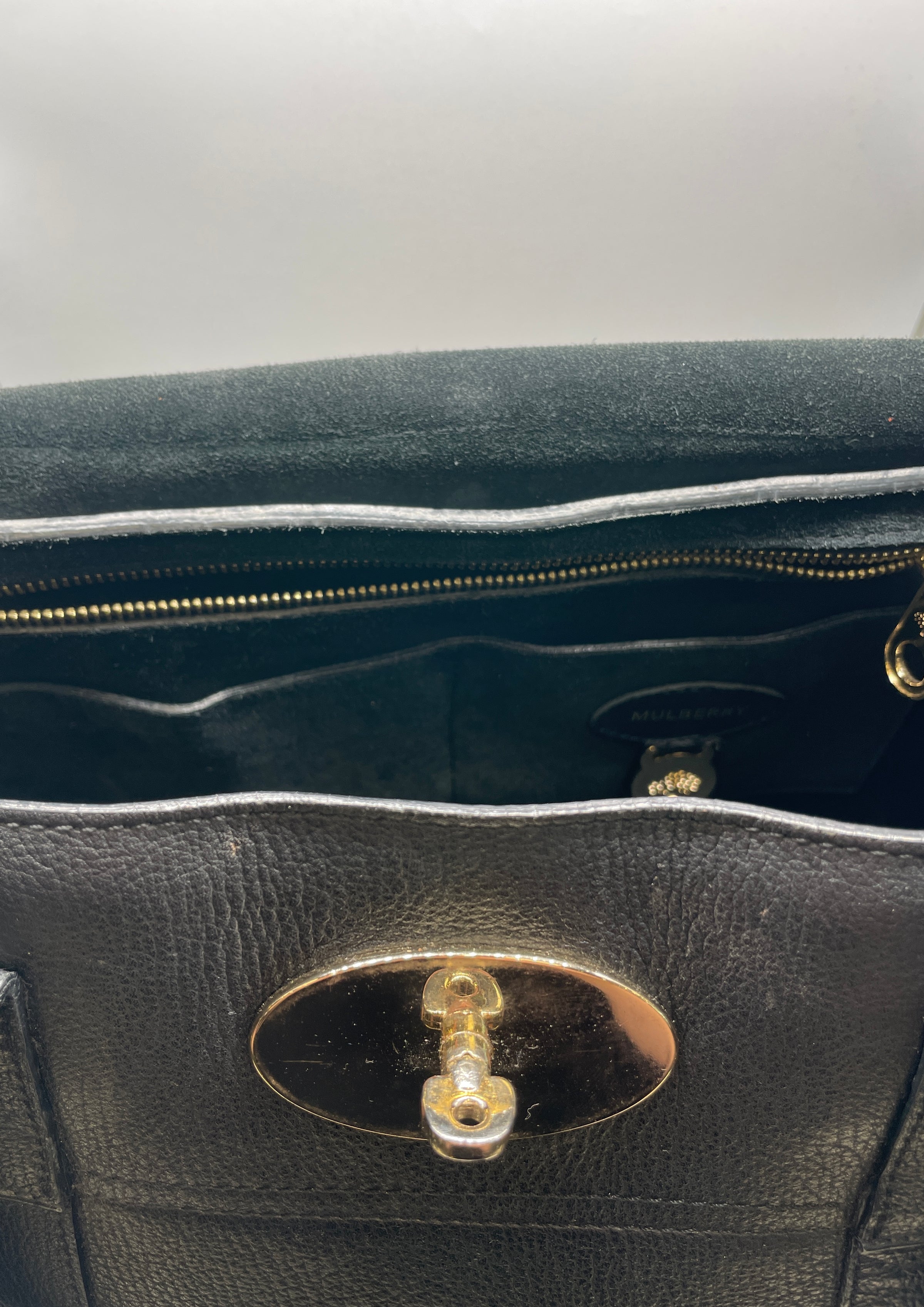 Materials & Design: The Mulberry Bayswater Bag in black is crafted from premium leather, showcasing the brand's commitment to quality and timeless style. The bag features gold-tone hardware, including the signature postman's lock, which adds a touch of elegance to its classic silhouette. The structured design and meticulous craftsmanship make it a versatile accessory suitable for both professional and casual settings.
