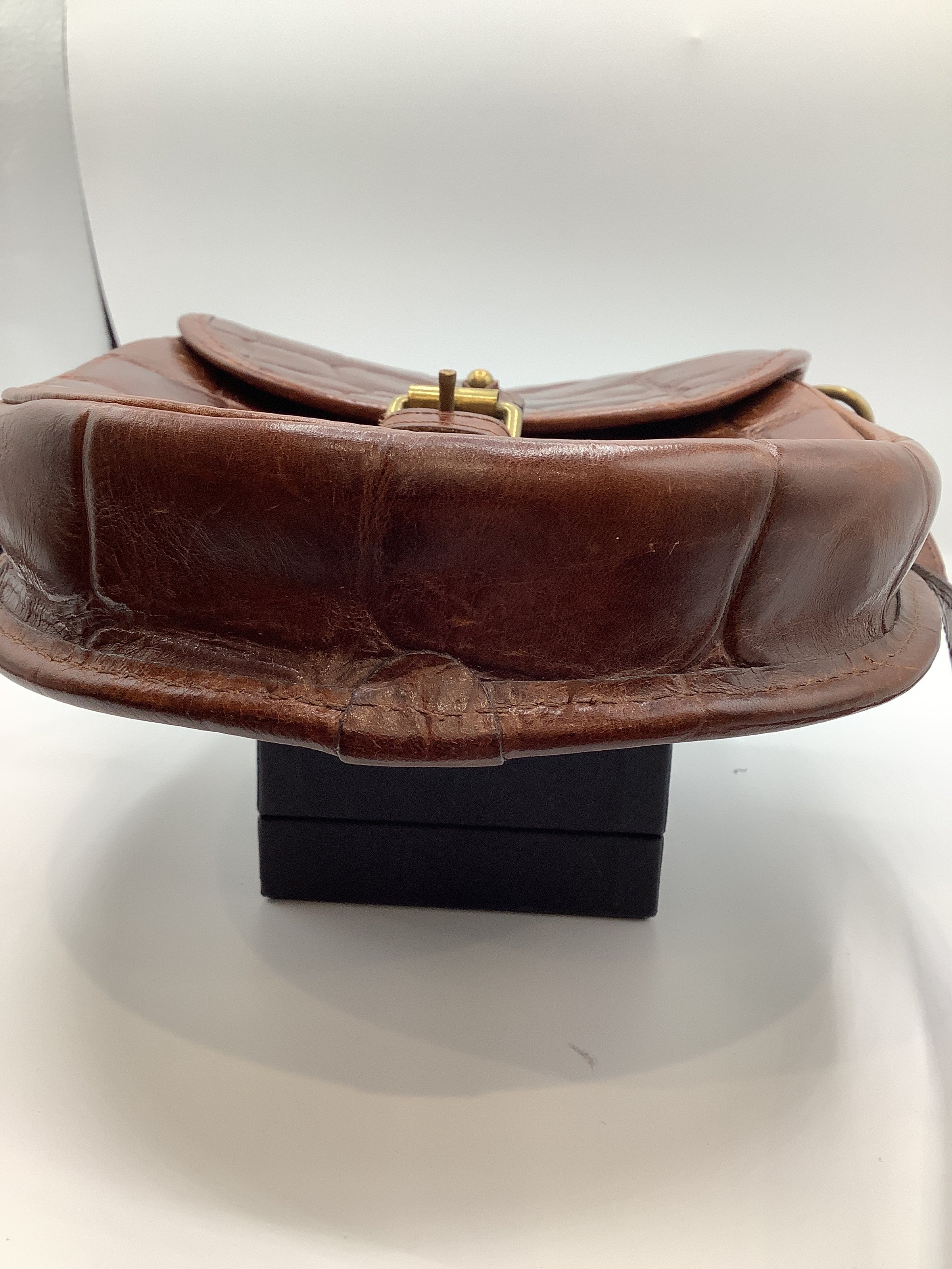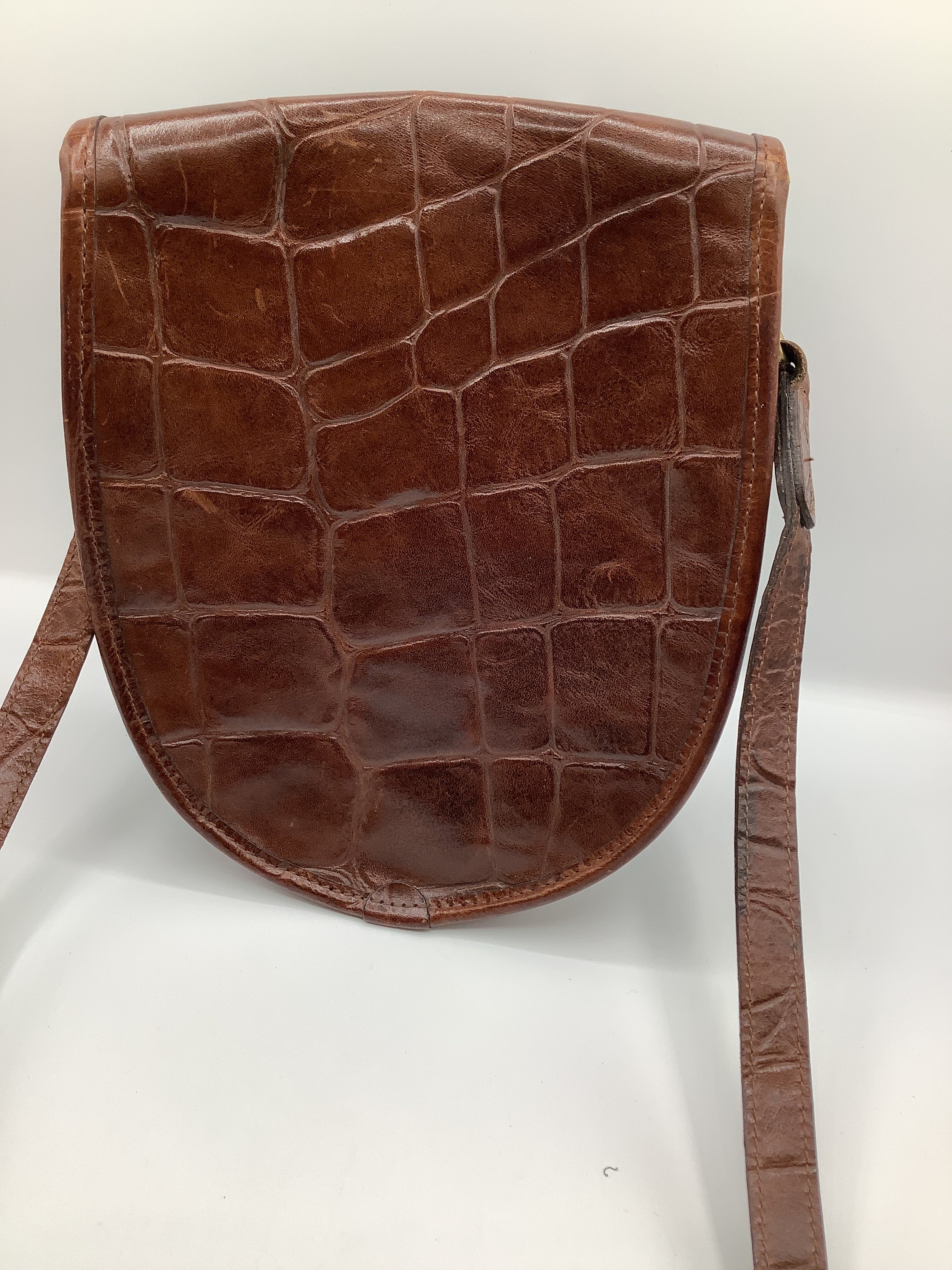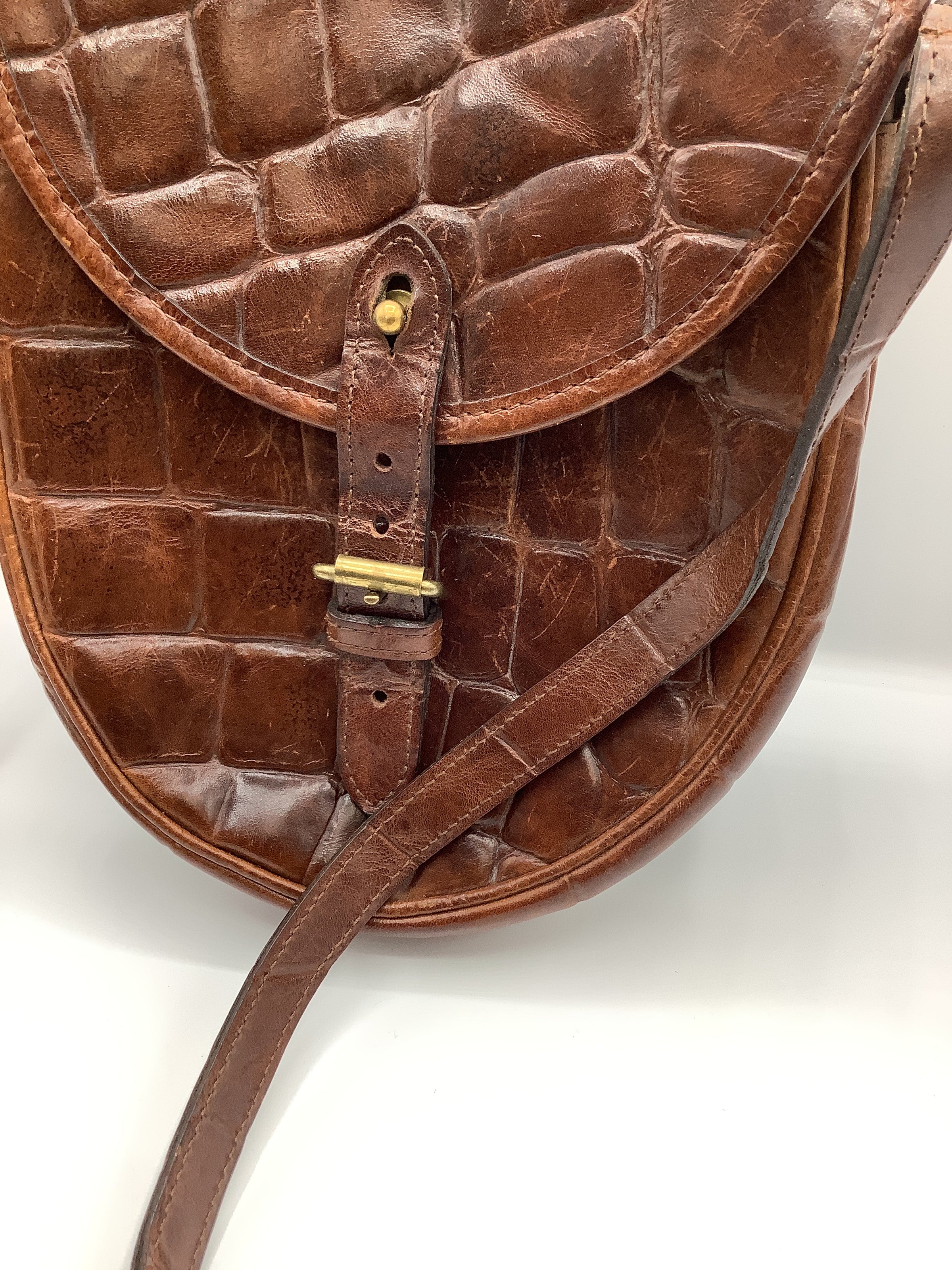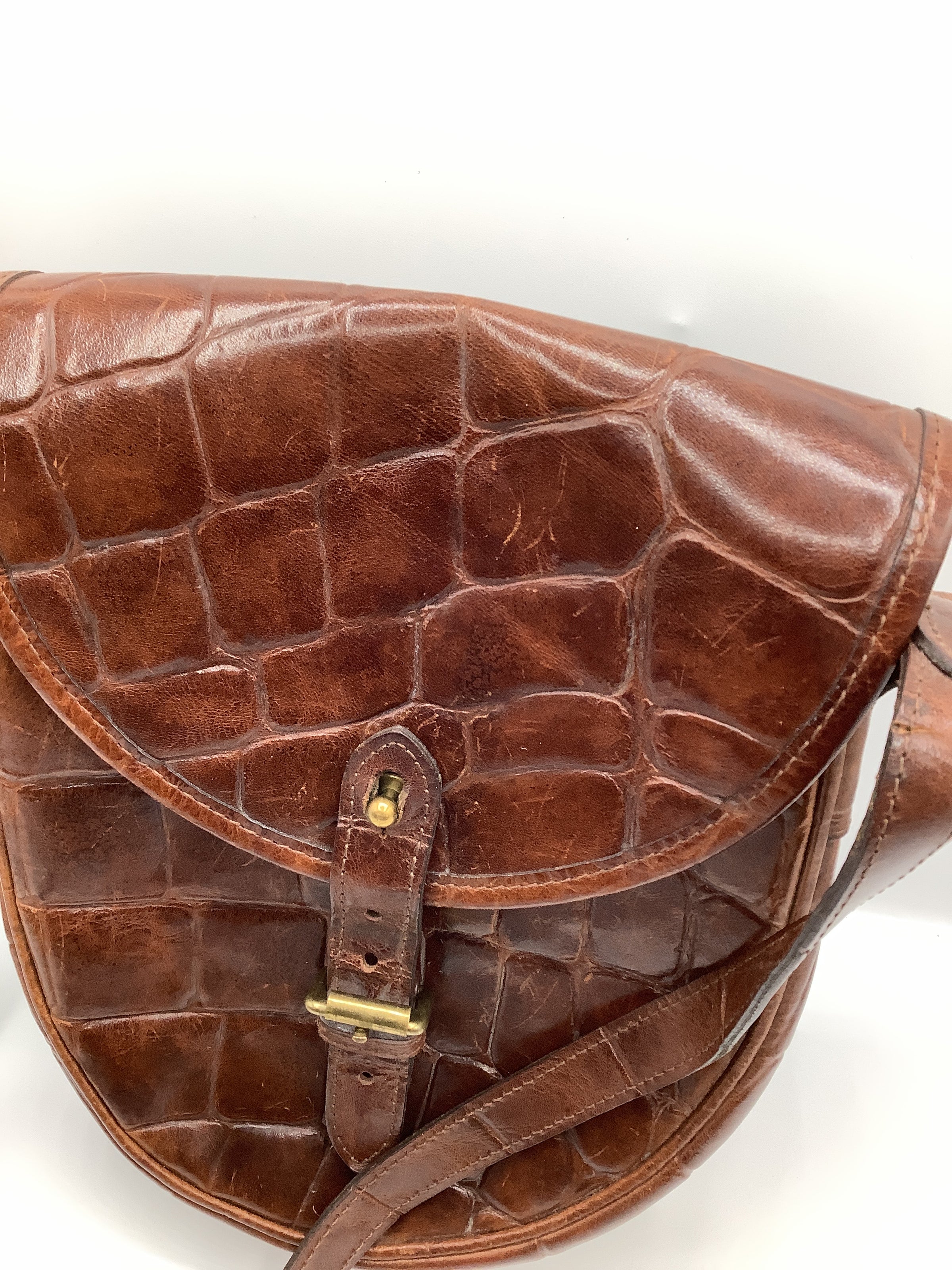 This vintage bag is crafted from croc-embossed brown leather, giving the exterior a refined, textured appearance that evokes classic elegance. It features a flap closure with typically brass or antiqued metal hardware, and a long adjustable leather strap designed for comfortable cross-body wear. The interior is lined with the signature tartan (or plaid) fabric — a distinctive hallmark of the brand’s heritage pieces — and most examples include practical interior organisation such as a zip pocket and open compartments. In terms of size, such cross-body models are compact-to-medium, ideal for daily use while preserving the sleek silhouette and elegant proportions.