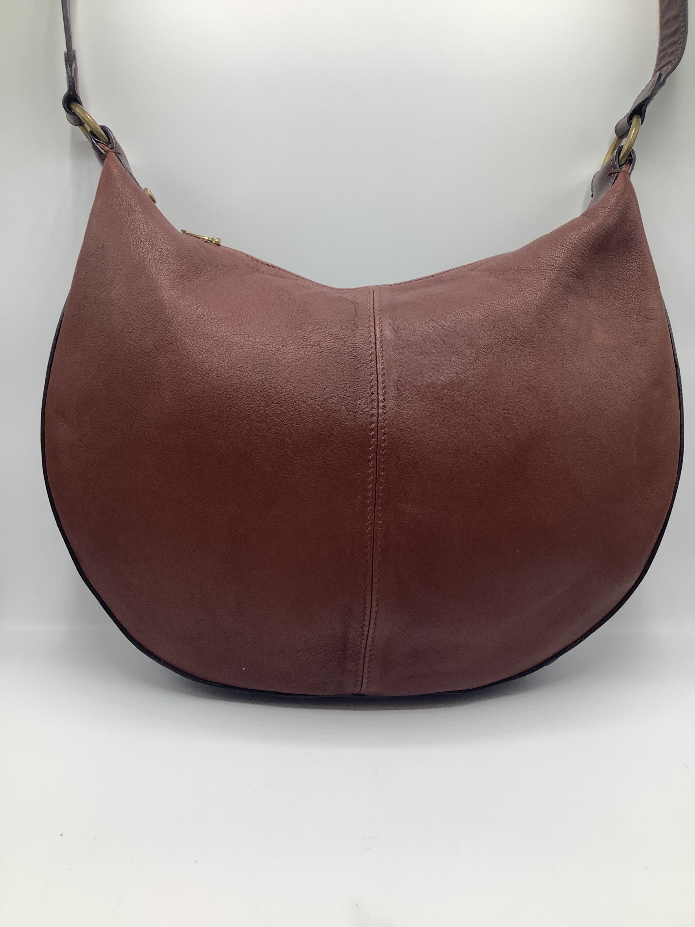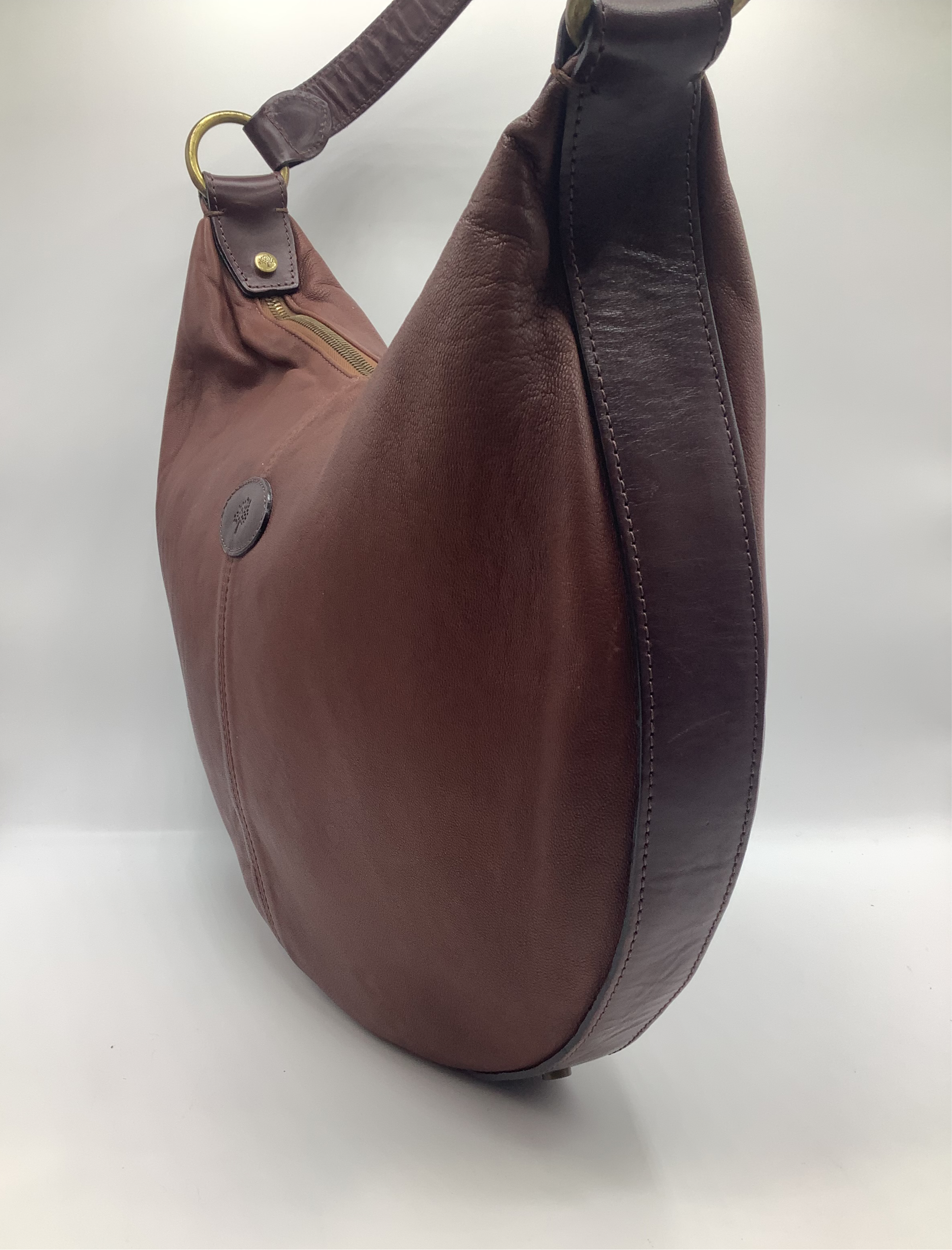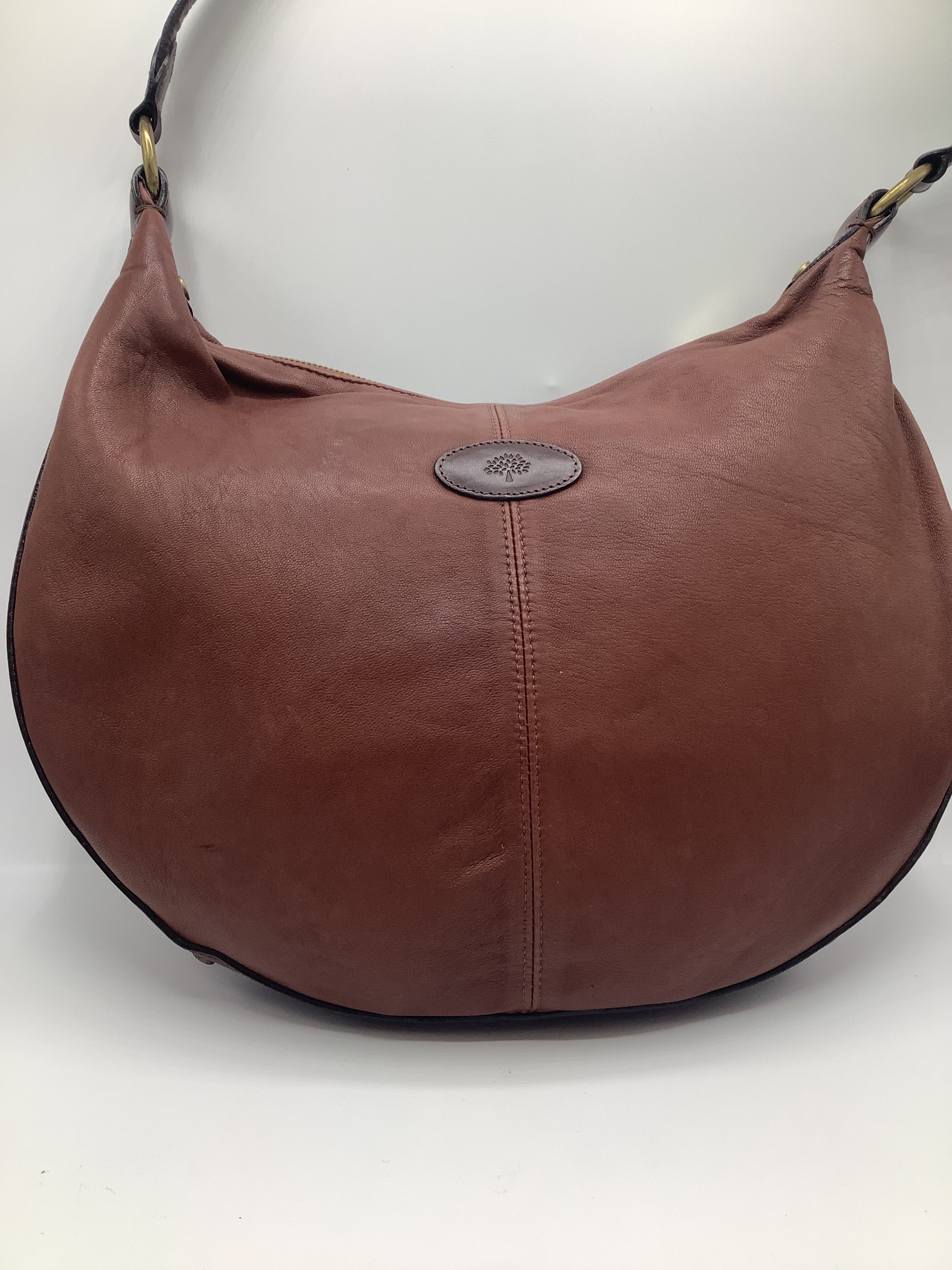 The Mulberry Half Moon Shoulder Bag is crafted from smooth, supple brown leather, shaped into a gently curved silhouette that evokes its namesake crescent moon. The minimalist design is enhanced by soft structure and clean lines, offering understated elegance perfect for everyday wear or evening outings. -