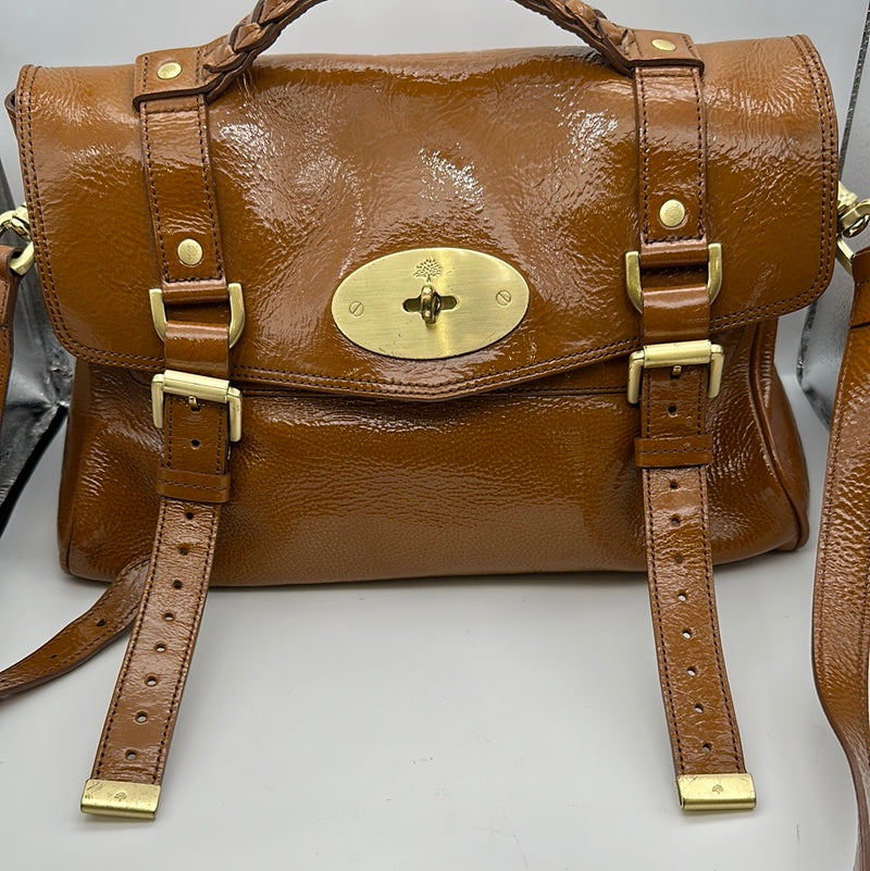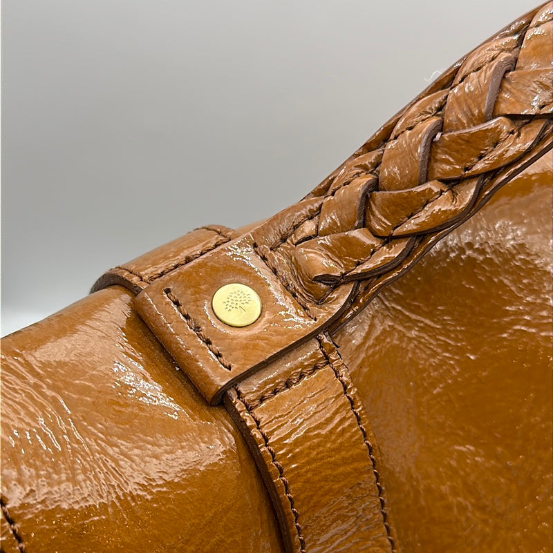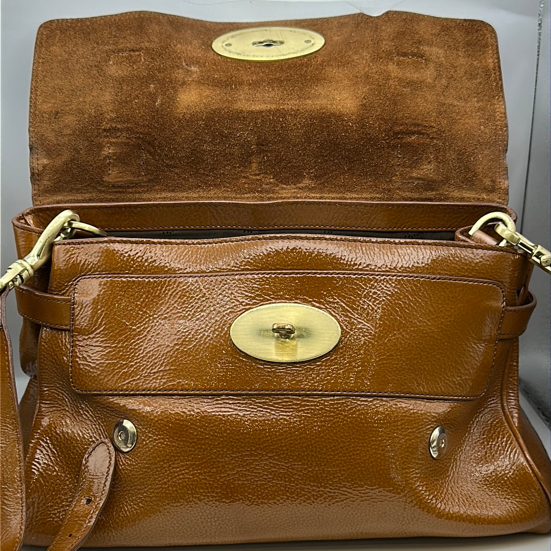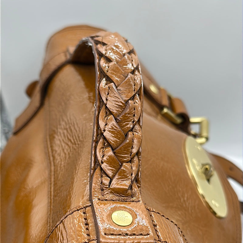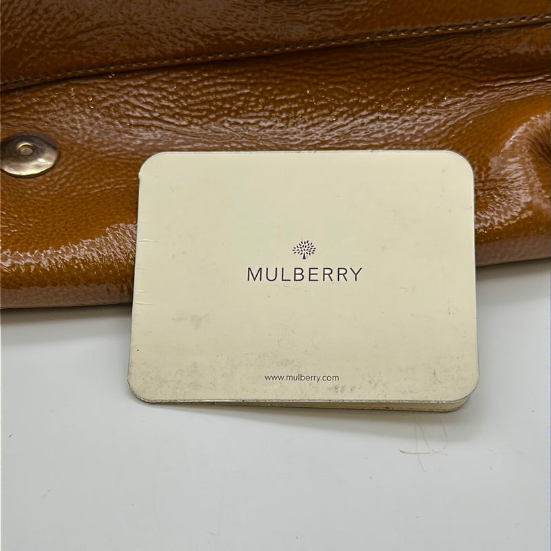 This stunning brown leather Mulberry handbag has an adjustable shoulder strap for easy carrying on the body, the interior of the bag is lined in Mulberry logo fabric and has a zipped pocket that runs the full width of the bag. Oval leather tab embossed "Mulberry" and brass metal disc embossed Mulberry Bush and on the other side the serial number.