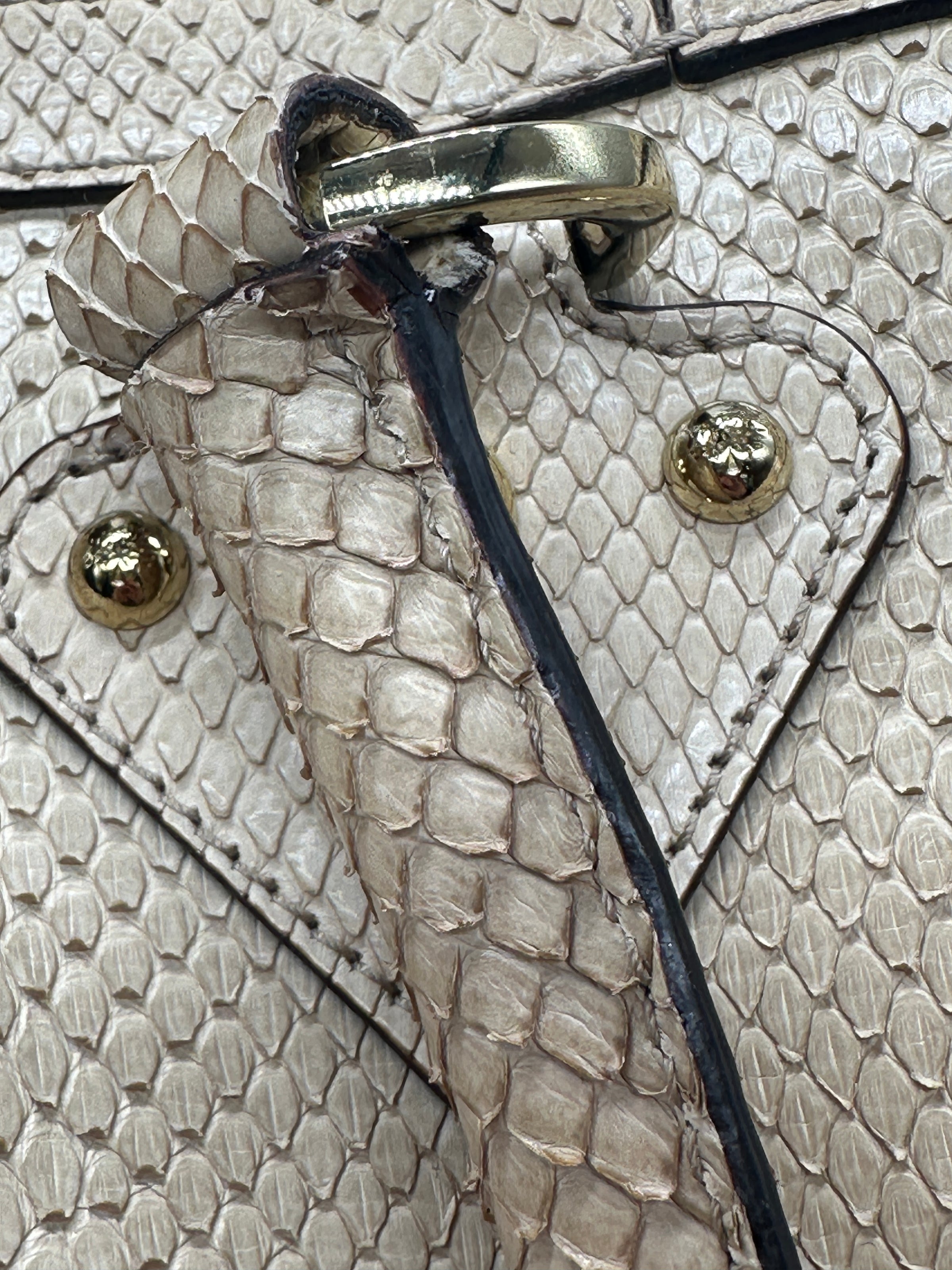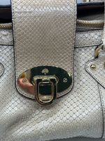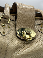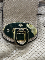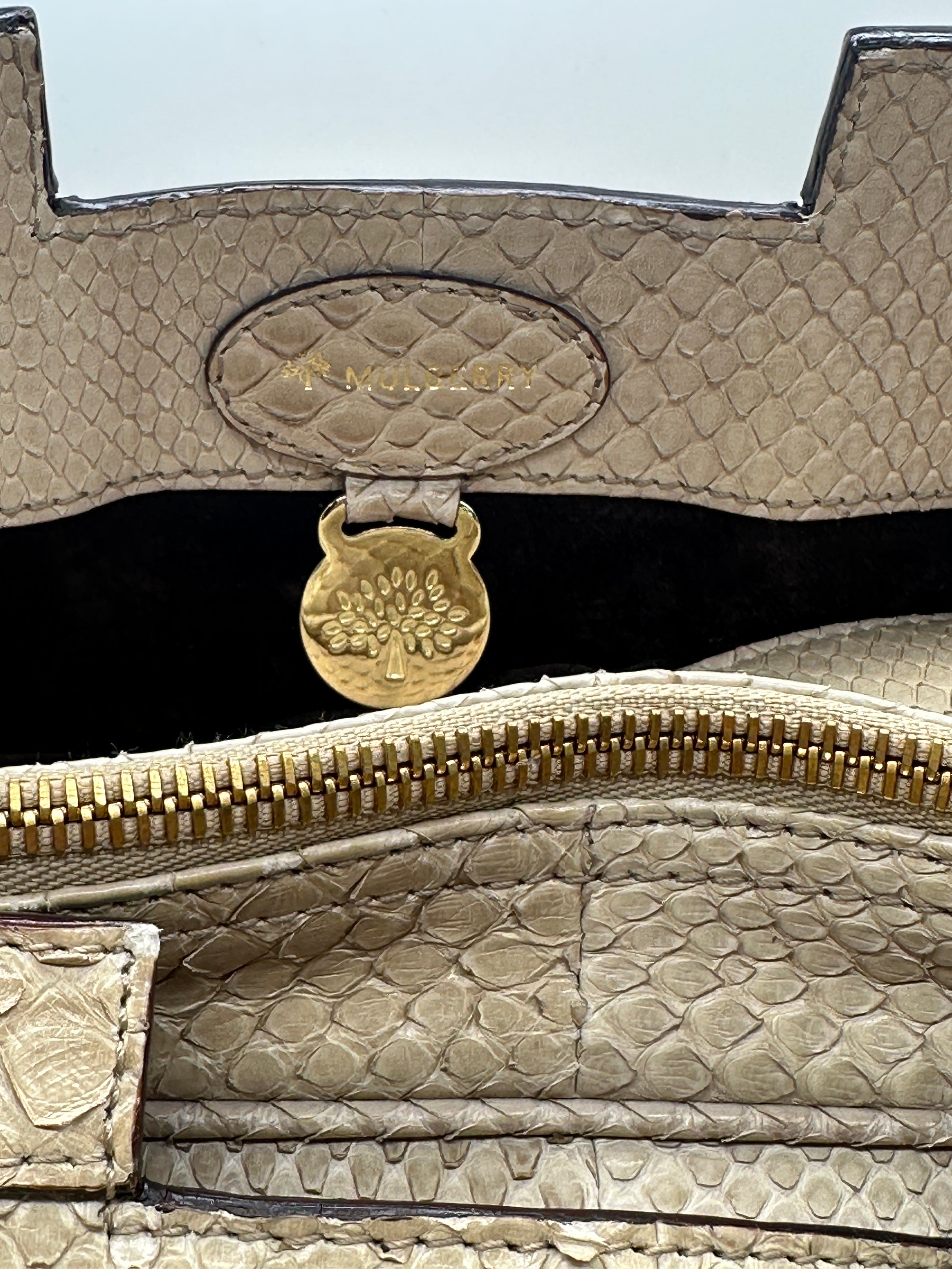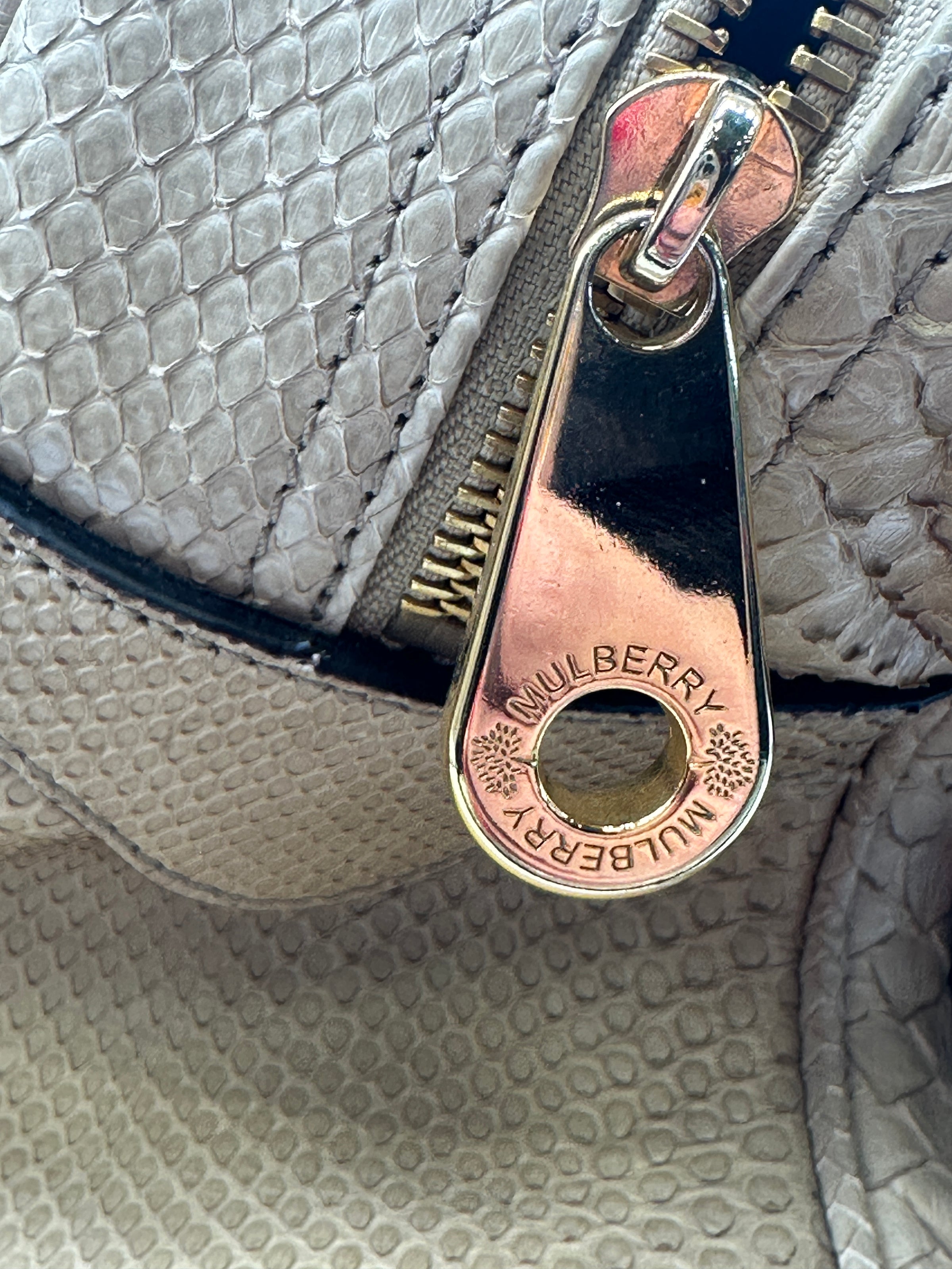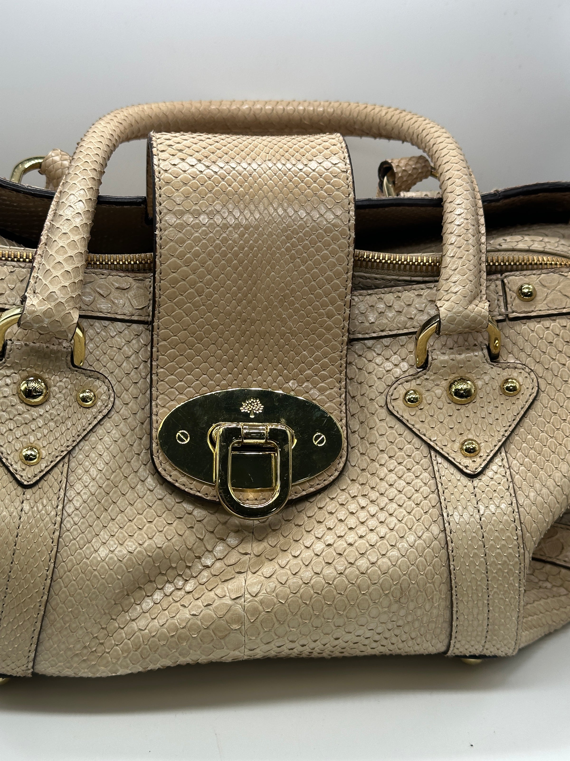 This Mulberry handbag showcases a cream snakeskin-textured exterior, complemented by luxurious gold-tone hardware. The design features a structured silhouette with a flap closure, secured by the brand's signature postman's lock. Inside, the bag offers a spacious interior lined with suede, including a zippered pocket for secure storage of essentials. The adjustable shoulder strap allows for versatile carrying options, making it both functional and stylish.