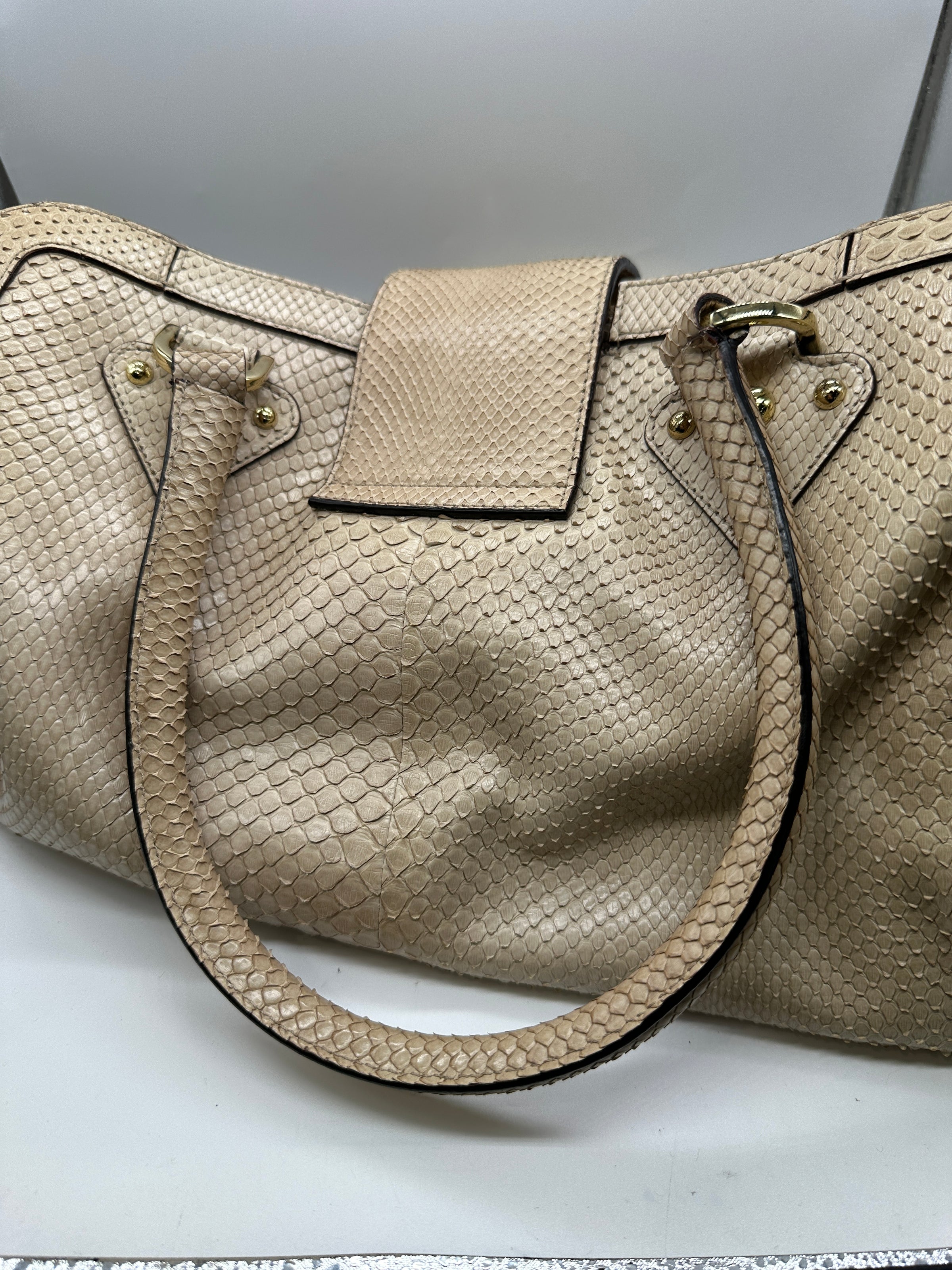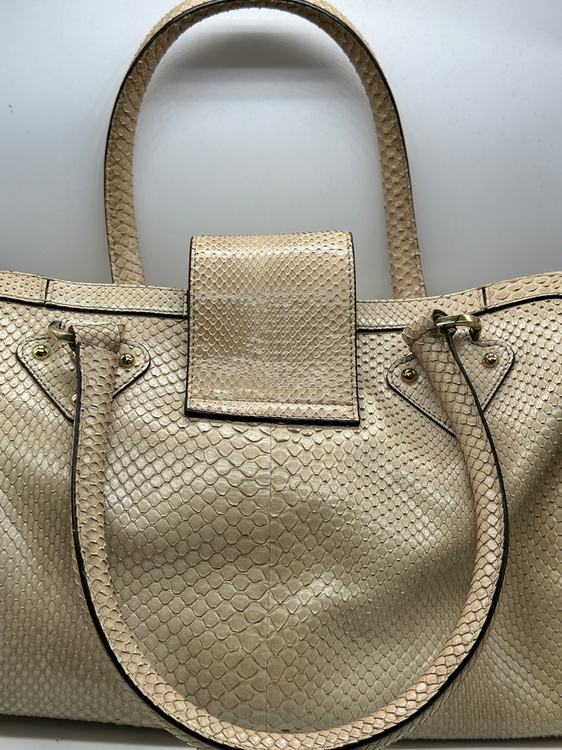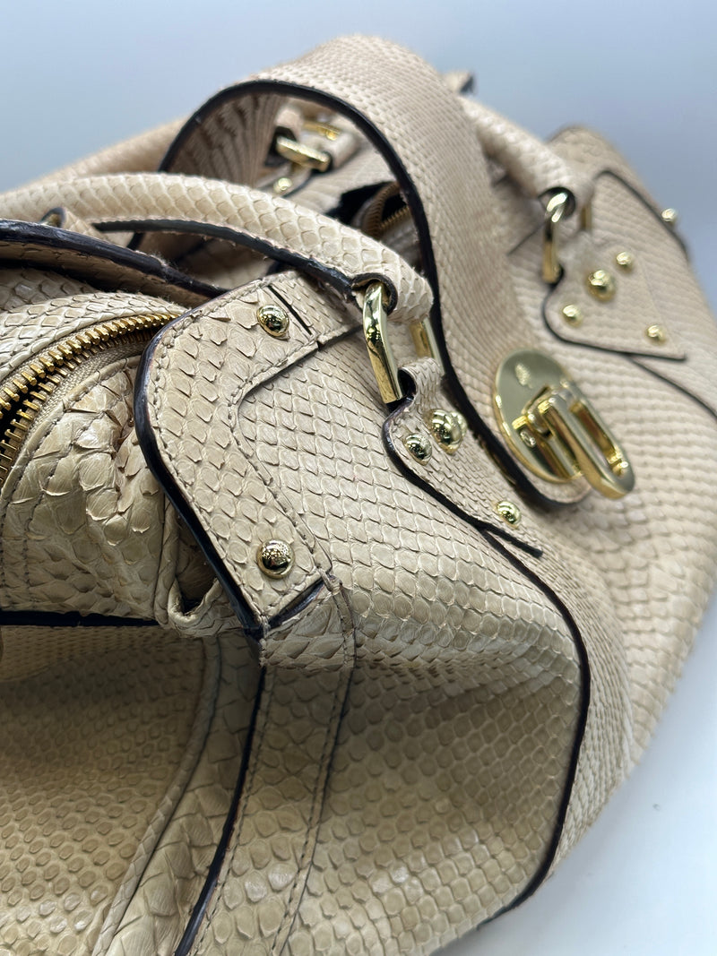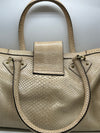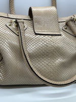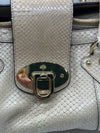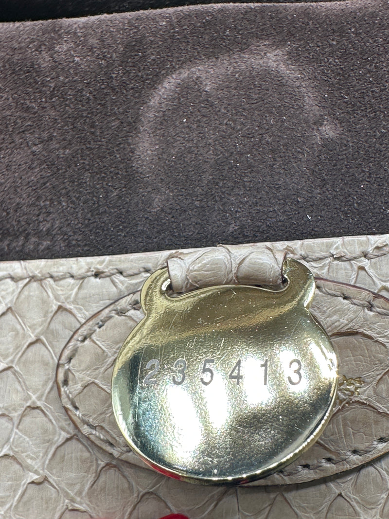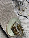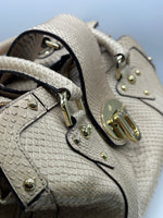 This Mulberry handbag showcases a cream snakeskin-textured exterior, complemented by luxurious gold-tone hardware. The design features a structured silhouette with a flap closure, secured by the brand's signature postman's lock. Inside, the bag offers a spacious interior lined with suede, including a zippered pocket for secure storage of essentials. The adjustable shoulder strap allows for versatile carrying options, making it both functional and stylish.