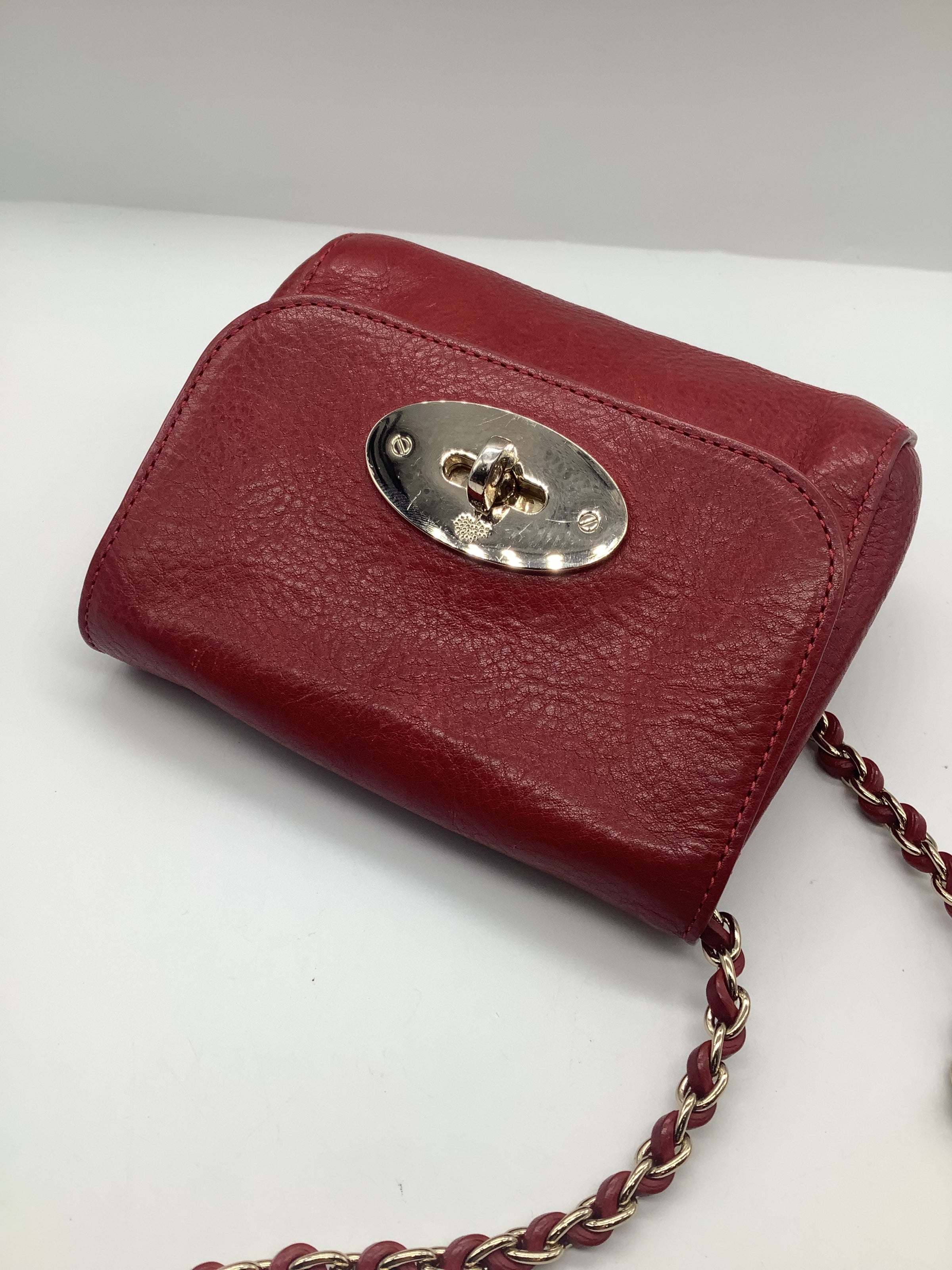 The Mulberry Mini Lily is a compact and elegant handbag, perfect for both day and evening use. Crafted from high-quality leather, it features the signature postman's lock closure and a woven leather and chain strap, allowing for versatile wear as a shoulder or crossbody bag. The interior is lined with soft suede and includes three card slots, providing just enough space for essentials. Measuring approximately 12 cm in height, 15.5 cm in width, and 6 cm in depth, the Mini Lily is both stylish and functional.