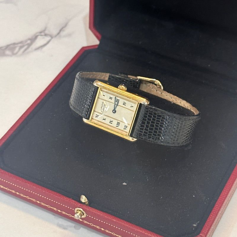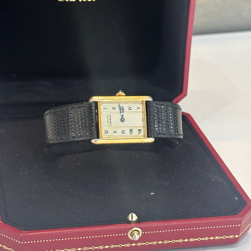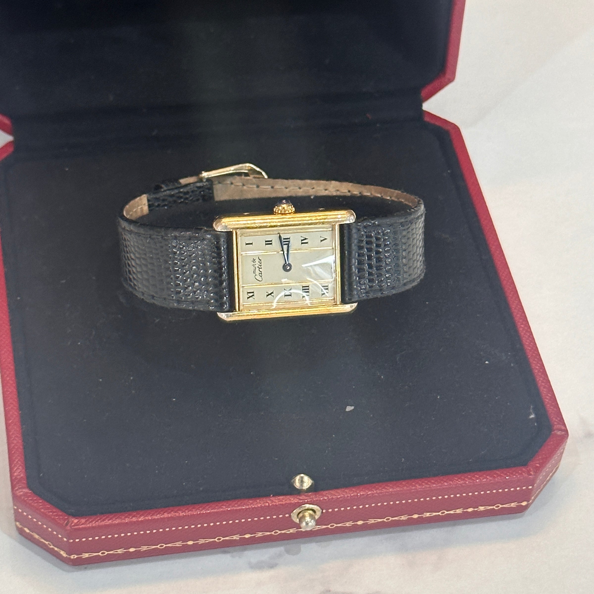 The Women's Must de Cartier Watch in 925 Silver with Gold Plating is a beautiful piece that blends elegance with the luxury of Cartier's craftsmanship. This timepiece typically features a combination of sterling silver (925) and gold plating, offering a timeless aesthetic that works well for both casual and formal occasions. Cartier's Must de Cartier collection is known for its iconic design, often mixing classic features with a modern touch.