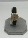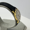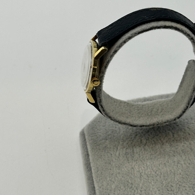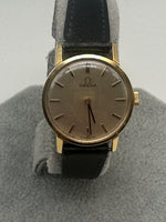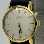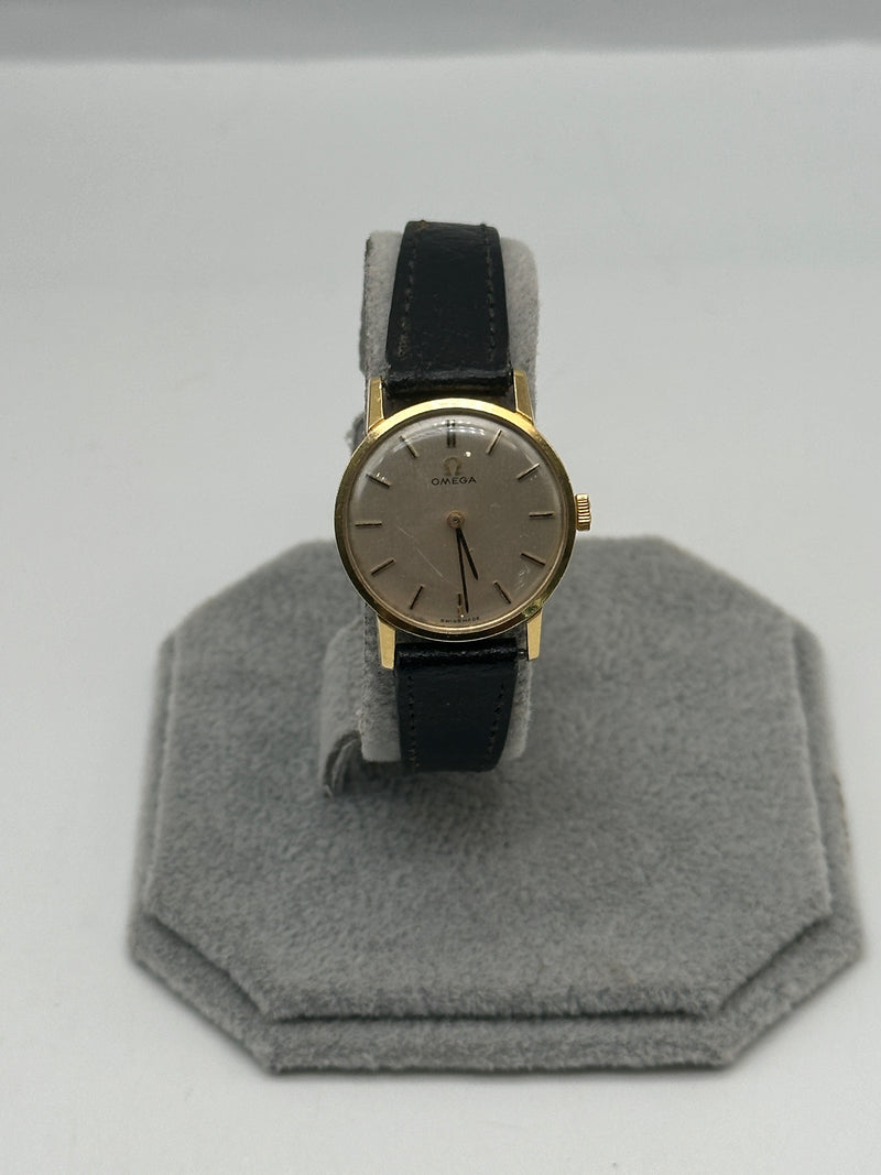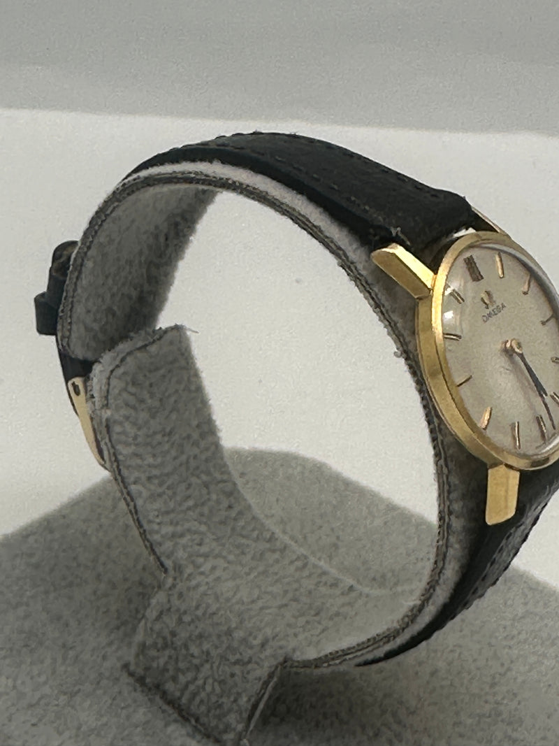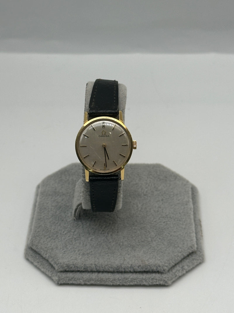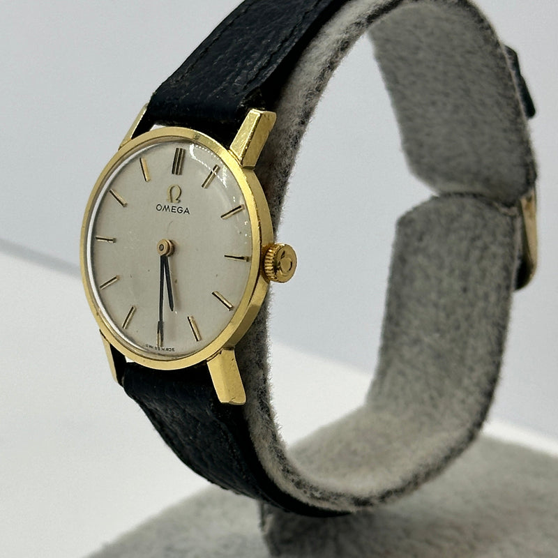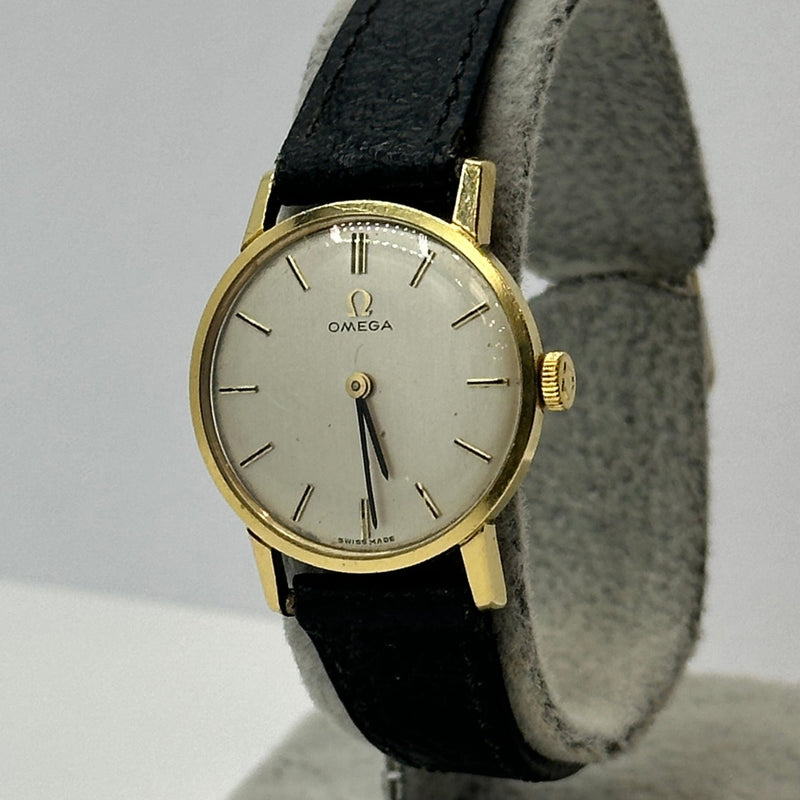 An elegant piece of Swiss horological craftsmanship, this Omega Ladies Watch, reference 511.137 from 1965, is crafted from luxurious 18ct yellow gold. The silvered dial features fine black baton hour markers and matching gold hands, embodying minimalist sophistication. With a petite case measuring approximately 20mm, this timepiece is designed for an understated and refined wrist presence. It is paired with a black leather strap and gold-tone buckle. Powered by the renowned manual wind Omega Calibre 620 movement, this vintage piece offers both precision and timeless style.