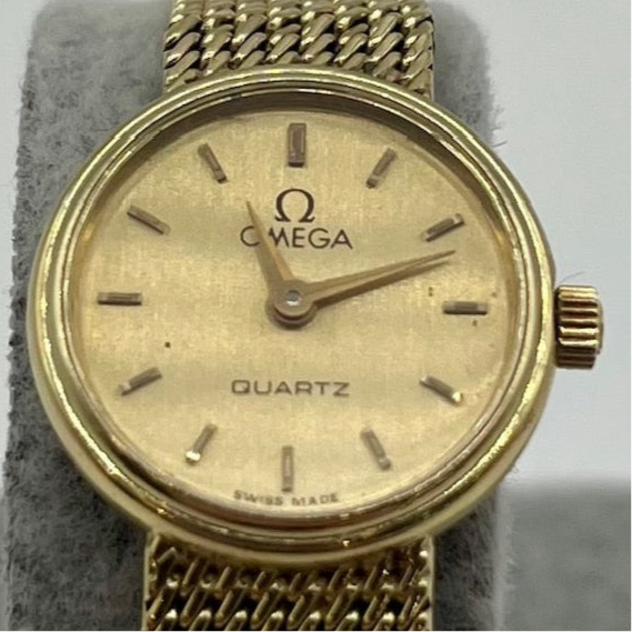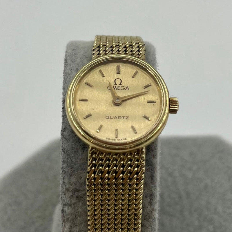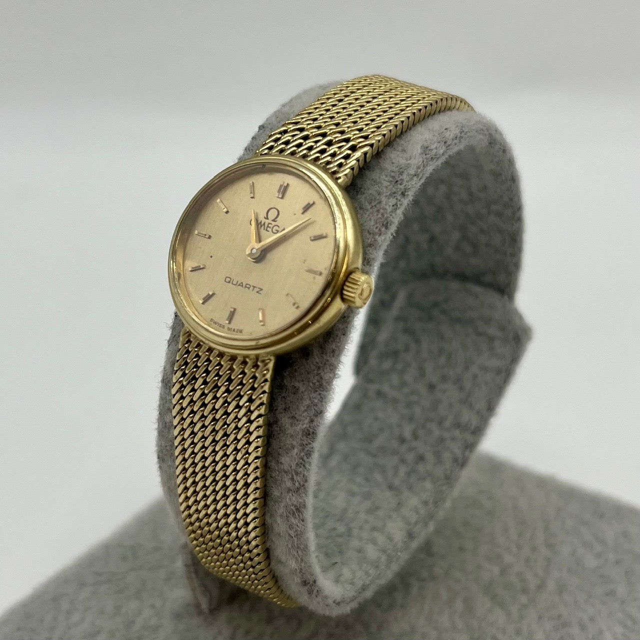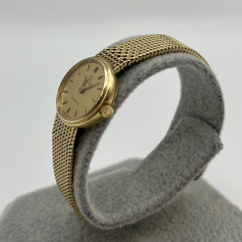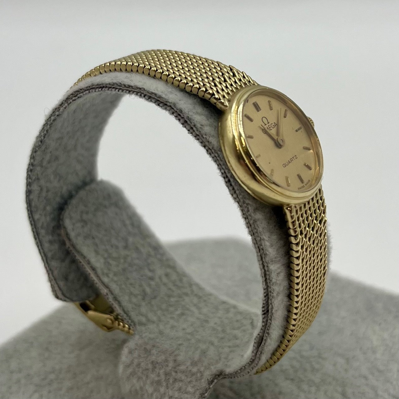 This exquisite 1986 Omega ladies' solid gold watch is crafted entirely from 18ct yellow gold, exemplifying timeless elegance and superior craftsmanship. The soft champagne-hued dial is accented with slim gold baton hour markers and slender gold hands, offering a refined, minimalist aesthetic. Measuring approximately 19mm in diameter, the round case is seamlessly paired with an integrated 18ct gold woven bracelet, secured with a signed Omega clasp. Powered by an Omega quartz movement, this elegant timepiece combines luxurious materials with Omega’s renowned precision and style.