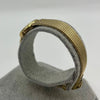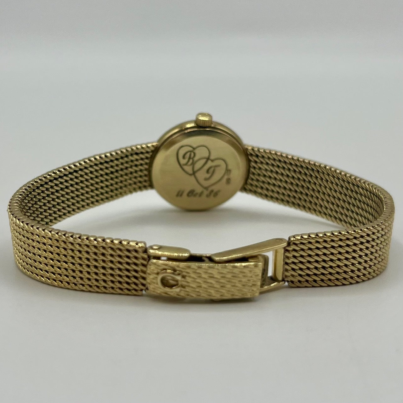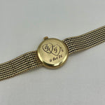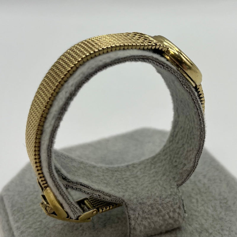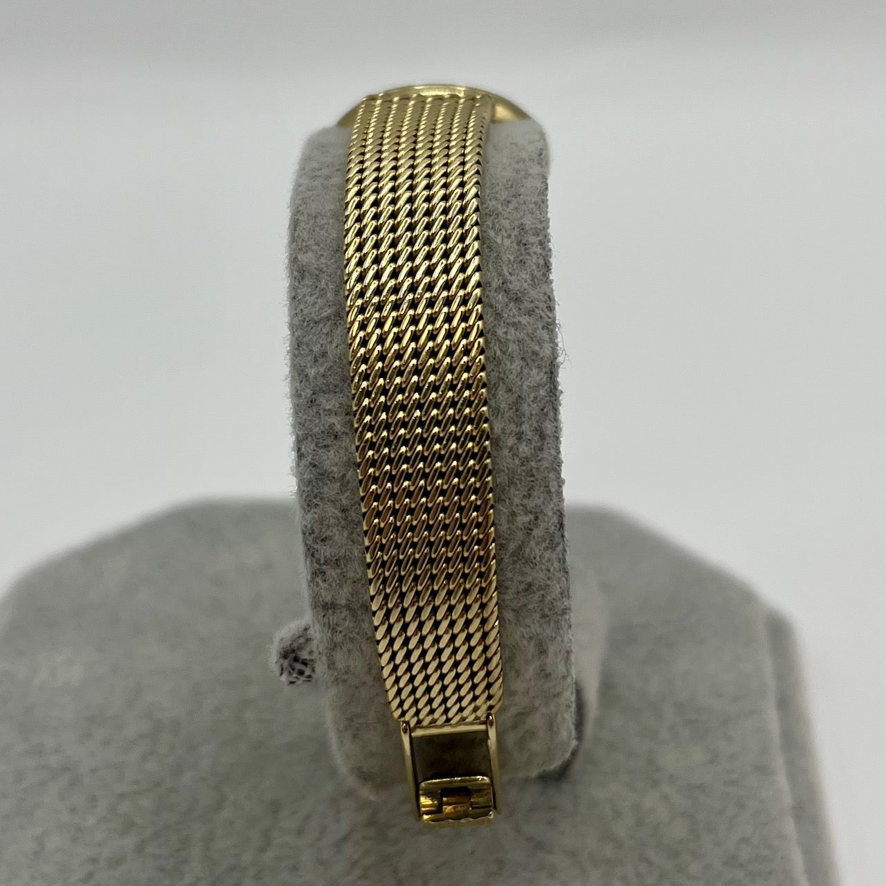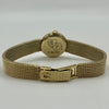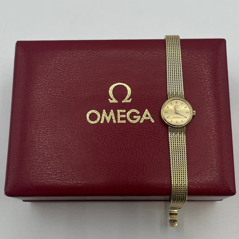 This exquisite 1986 Omega ladies' solid gold watch is crafted entirely from 18ct yellow gold, exemplifying timeless elegance and superior craftsmanship. The soft champagne-hued dial is accented with slim gold baton hour markers and slender gold hands, offering a refined, minimalist aesthetic. Measuring approximately 19mm in diameter, the round case is seamlessly paired with an integrated 18ct gold woven bracelet, secured with a signed Omega clasp. Powered by an Omega quartz movement, this elegant timepiece combines luxurious materials with Omega’s renowned precision and style.