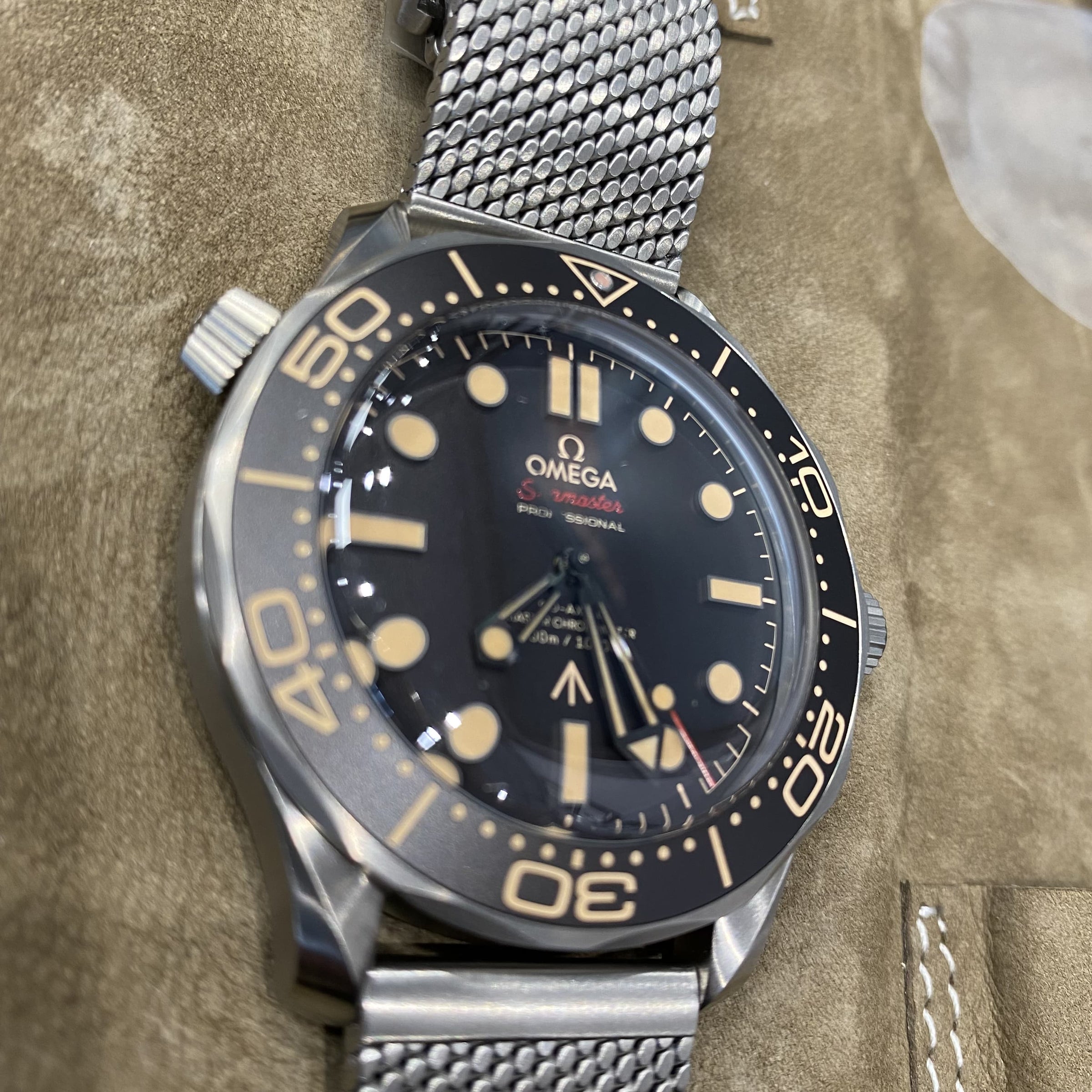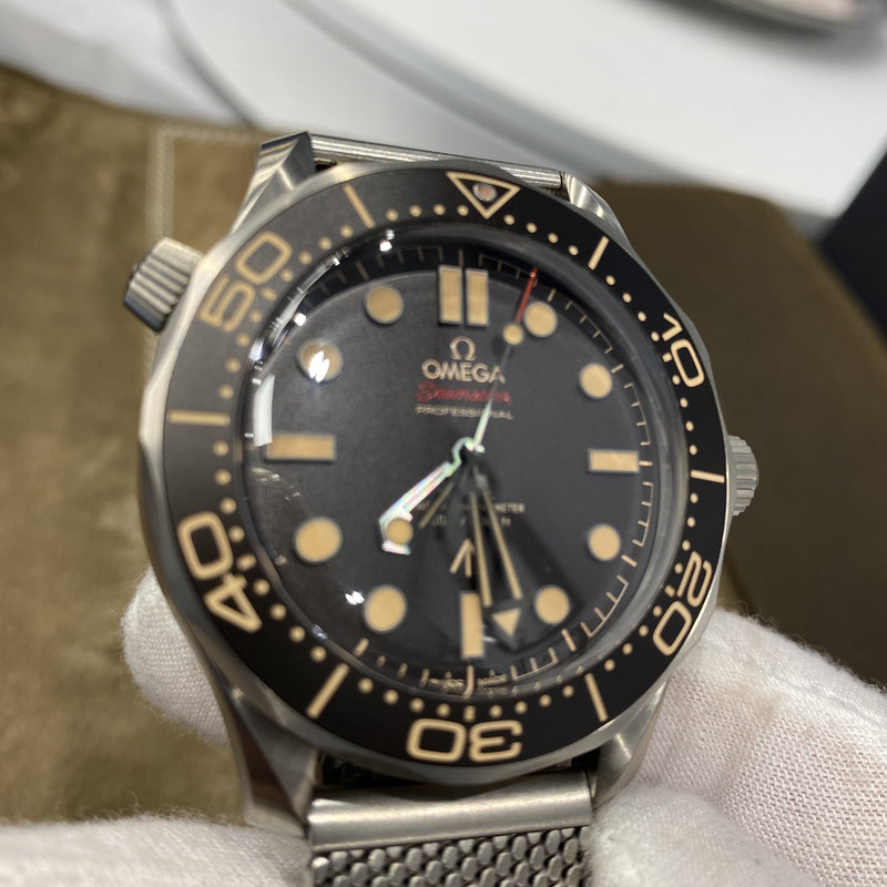 Identical to 007's watch in No Time To Die this 42mm Seamaster, in strong yet lightweight Grade 2 Titanium, sports a brown tropical aluminium bezel ring and dial.