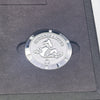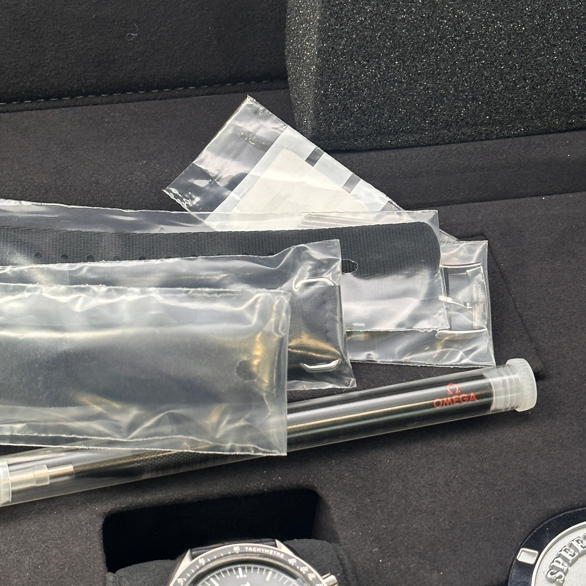 Presented on a nylon fabric strap, this 42 mm Moonwatch in stainless steel features hesalite glass on the front and an embossed Seahorse medallion on the caseback. Inspired by the 4th generation Speedmaster style worn on the moon, it also includes an asymmetrical case, black step dial and the famous dot over 90 on the anodised aluminium bezel ring.